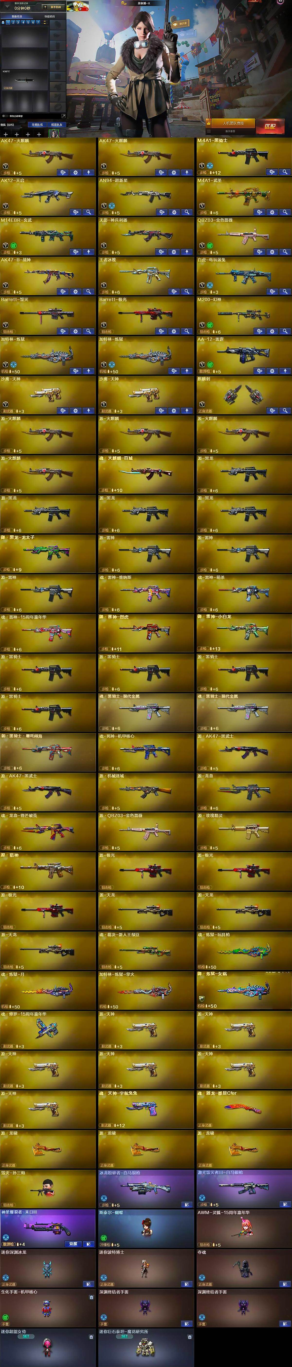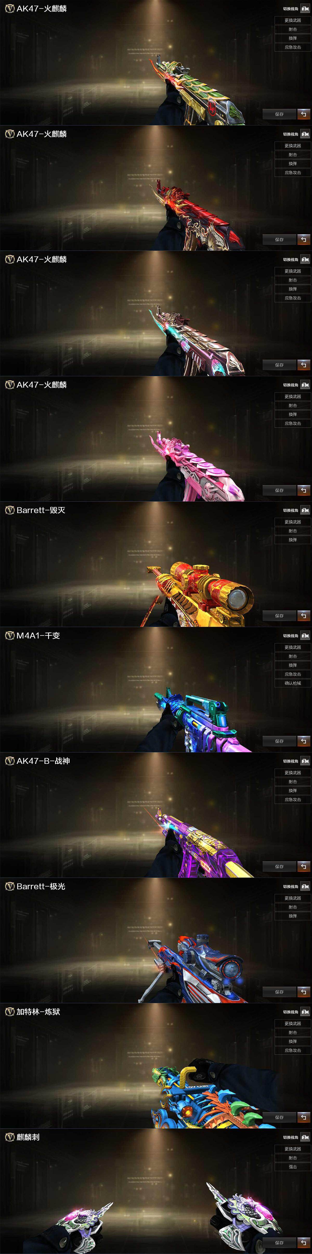 【英雄级武器】:AK47-火麒麟*2,M4A1-黑骑士,AK12-天启,AN94-超新星,M4A1-武圣,M14EBR-玄武,无影-神兵利器,QBZ03-金色蔷薇,AK47-B-战神,王者冰魄-觉醒版,白虎-电玩蓝兔,Barrett-毁灭,Barrett-极光,M200-幻神,加特林-炼狱*2,AA-12-雷霆,沙鹰-天神*2,麒麟刺