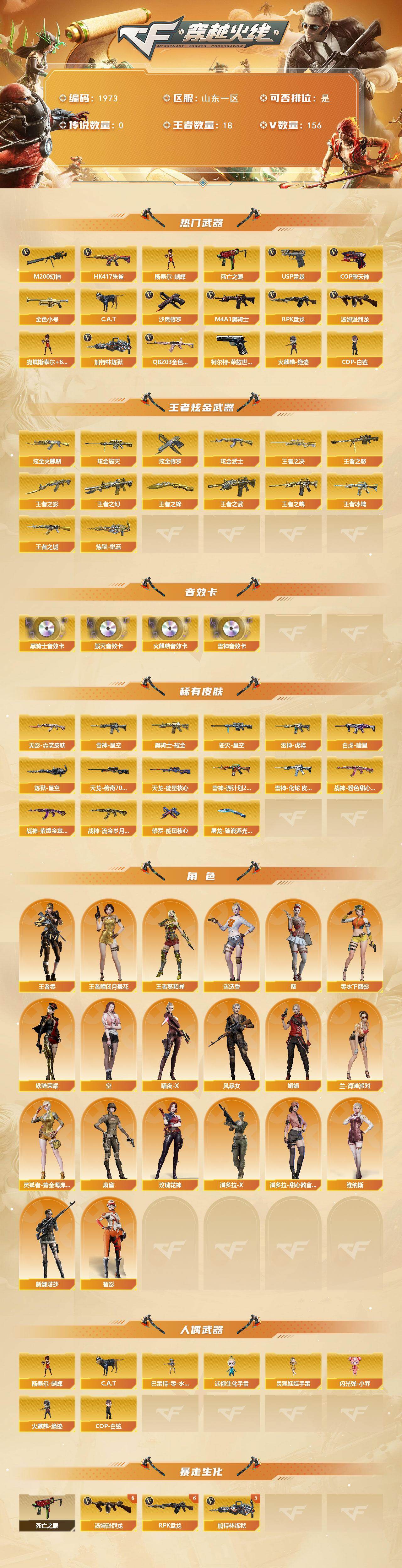 - [16332078]广东一区-38V-2王者-0炫金 【热门武器】:死亡之眼,汤姆逊-烈龙*5,RPK-盘龙*5,沙鹰-修罗 【王者炫金武器】:玫瑰精灵-悦动,炼狱-悦蓝 【音效卡】:炼狱-百战金芒-庆典舞曲音效卡 【皮肤】:雷神-能量核心,M4A1-再燃火线,雷神-神秘按键 皮肤,黑龙-暗月,无影-能量核心*2,天启-暗月*2,修罗-能量核心,轻型军用手斧-再燃火线 【角色】:瞳,修道士,云海玲珑,娟娟,潘多拉-X,潘多拉-甜心教官,青霞仙子,蛇姬,雪莉杨-摸金校尉,影武者-X 【人偶武器】:迷你生化手雷*2 【暴走生化】:死亡之眼 【英雄级武器】:AK47-火麒麟,M4A1-黑龙,M4A1-雷神*2,AK47-无影*2,M4A1-死神,AN94-超新星,AK47-机械迷城,AWM-天龙,Barrett-毁灭,RPK-盘龙*5,炼狱-百战金芒,汤姆逊-烈龙*5,沙鹰-修罗,沙鹰-天神,屠龙*3,龙啸,擎天,麒麟刺,麒麟刺-百战金芒 【道具】:CFS限定背包,战舰背包,炫彩背包,百战金芒炫彩背包,圣拳猎手-炽雪,女皇终结者-魔龙之吻,绿色巨人,灵魂忍者,变异宝贝,迷雾幽灵,夺命之镰,防化服*2,语音特效-盛典烟火,萌萌小葵表情,炽雪表情,防弹头盔*2,防弹衣*2,C4工具钳*2,手雷包*2 【特殊枪械】:5烈龙,5盘龙