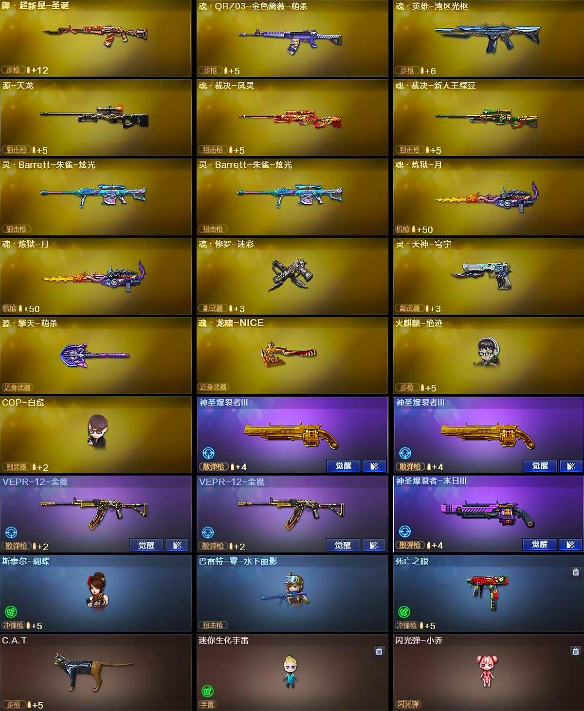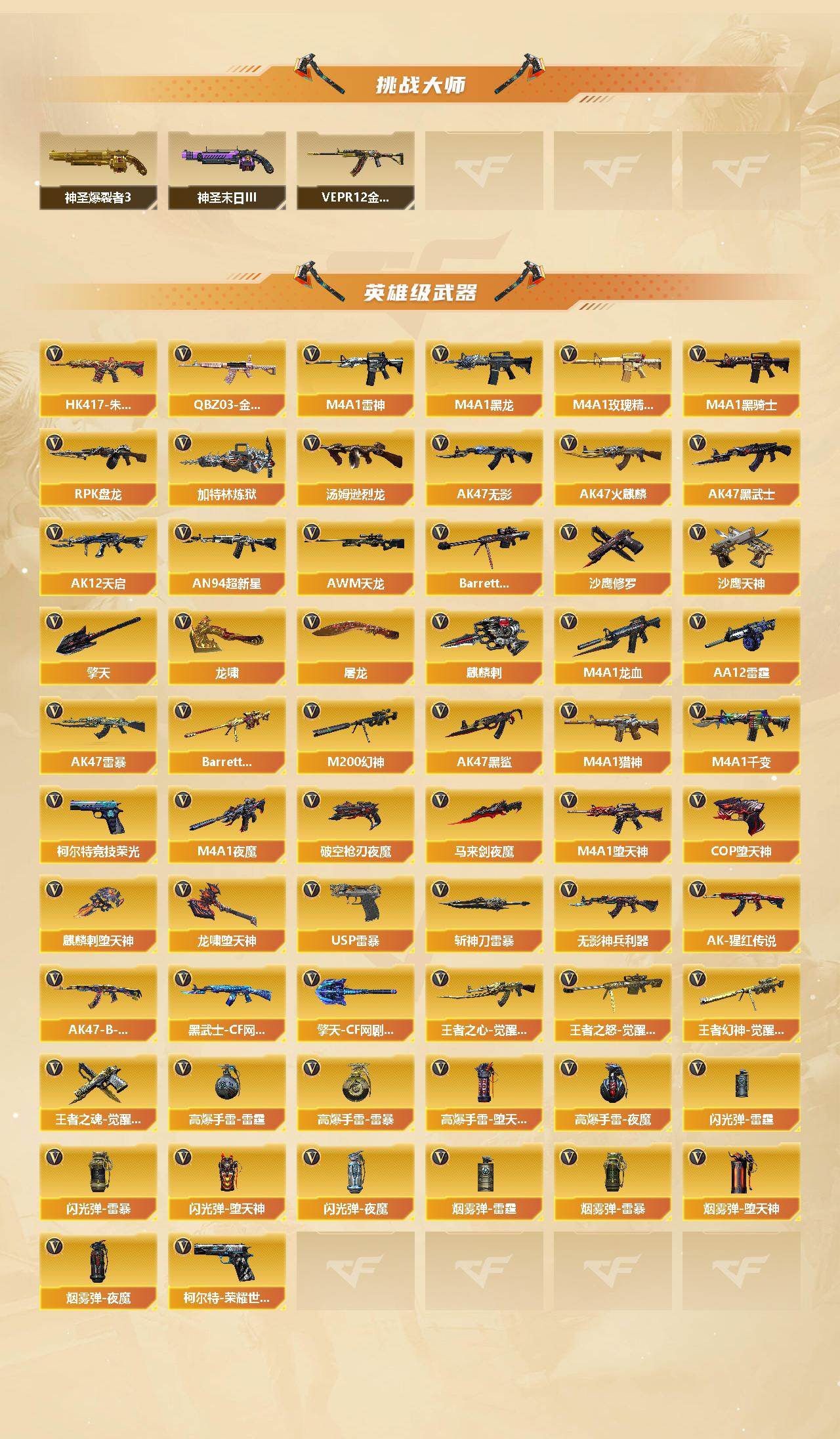 【英雄级武器】:M4A1-千变,AK47-火麒麟*2,M4A1-黑龙*5,M4A1-雷神*2,M4A1-黑骑士,AK47-无影,AK47-黑武士*2,AK12-天启,AN94-超新星,AK47-黑鲨*2,M4A1-龙血,AK47-雷暴,M4A1-堕天神,HK417-朱雀,M4A1-夜魔,无影-神兵利器,M4A1-玫瑰精灵*7,QBZ03-金色蔷薇*4,M4A1-猎神,王者之心-觉醒版,AK-47-猩红传说*13,AK47-B-战神,黑武士-CF网剧冠军,AWM-天龙*2,Barrett-毁灭*3,M200-幻神,Barrett-朱雀,王者之怒-觉醒版,王者幻神-