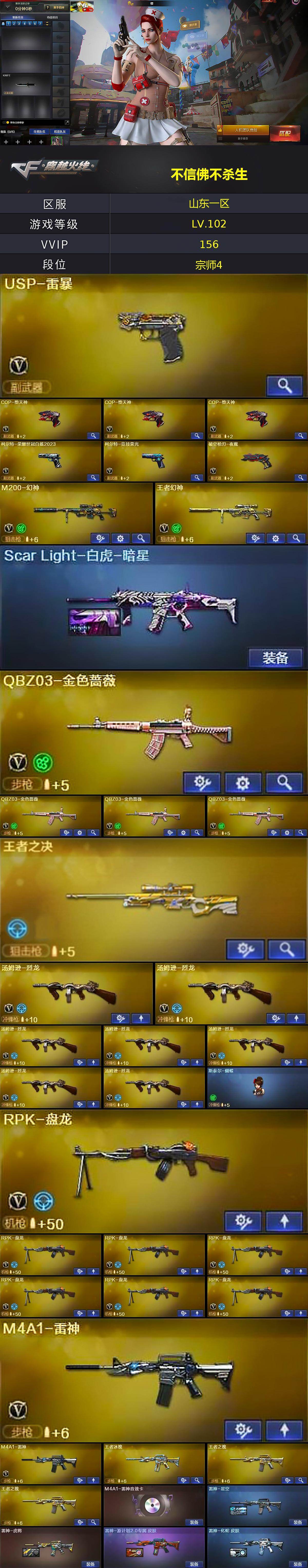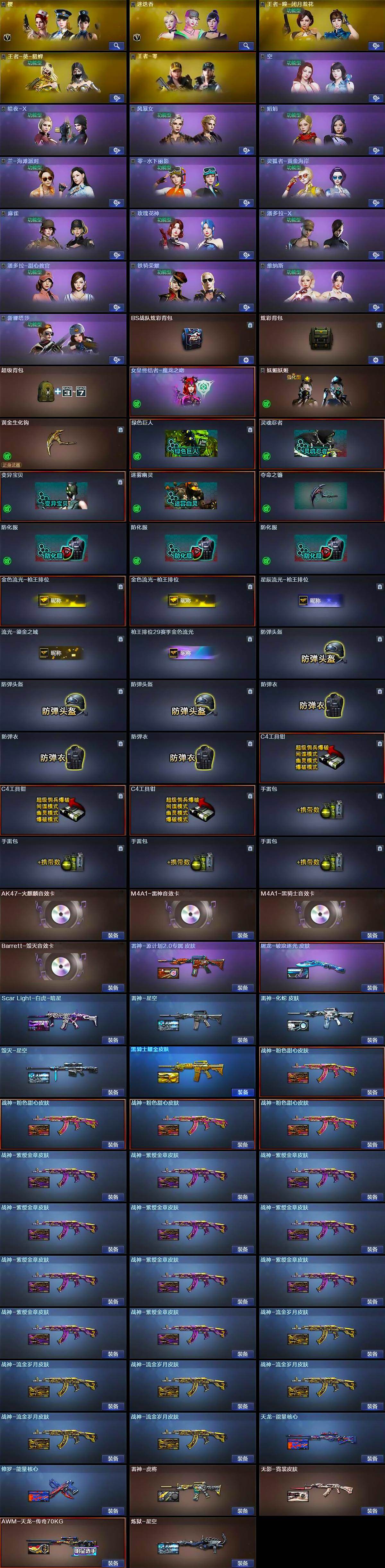 【皮肤】:Scar Light-白虎-暗星,雷神-星空,雷神-虎将,雷神-源计划2.0专属 皮肤,雷神-化蛇 皮肤,毁灭-星空,黑骑士耀金皮肤,无影-霓裳皮肤,战神-粉色甜心皮肤*4,战神-紫绶金章皮肤*11,战神-流金岁月皮肤*6,天龙-能量核心,AWM-天龙-传奇70KG,炼狱-星空,修罗-能量核心,屠龙-破浪逐光 皮肤