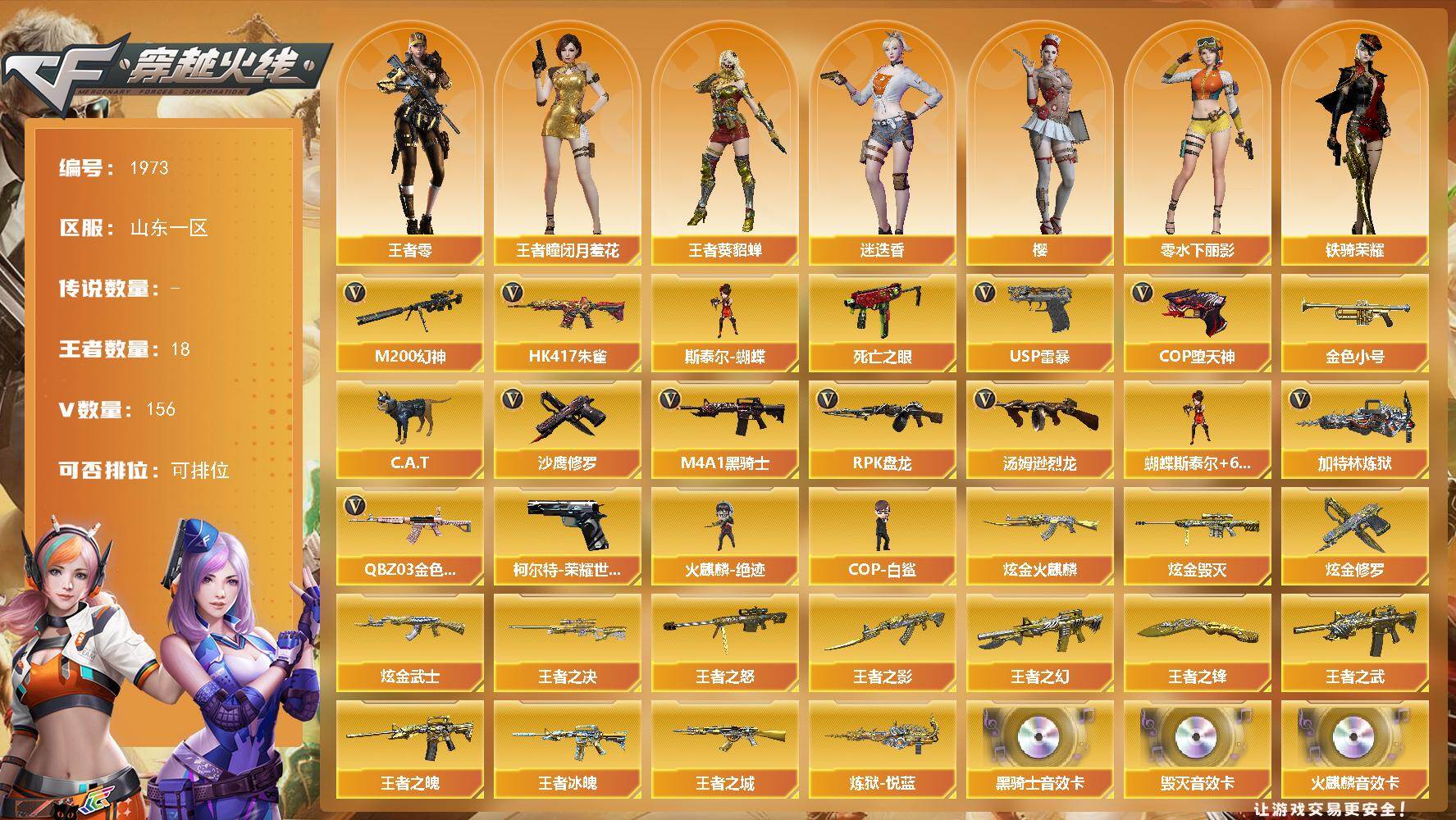 [16447715]山东一区-162V-18王者武器数-5炫金武器数 【热门武器】:QBZ03-金色蔷薇*4,HK417-朱雀,M200-幻神,柯尔特-荣耀世冠白鲨2023,死亡之眼,金色小号,C.A.T,M4A1-黑骑士,汤姆逊-烈龙*7,RPK-盘龙*7,加特林-炼狱*5,斯泰尔-蝴蝶,火麒麟-绝迹,COP-白鲨,USP-雷暴,COP-堕天神*3,沙鹰-修罗*4 【王者炫金武器】:王者之城,王者冰魄,王者之幻,王者之武*2,王者之影,王者之魄*2,王者之决,王者之怒*3,炼狱-悦蓝,王者之锋,炫金火麒麟,炫金武士,炫金毁灭*2,炫金修罗 【音效卡】:AK47-火麒麟音效卡,M4A1-雷神音效卡,M4A1-黑骑士音效卡,Barrett-毁灭音效卡 【皮肤】:Scar Light-白虎-暗星,雷神-星空,雷神-虎将,雷神-源计划2.0专属 皮肤,雷神-化蛇 皮肤,毁灭-星空,黑骑士耀金皮肤,无影-霓裳皮肤,战神-粉色甜心皮肤*4,战神-紫绶金章皮肤*11,战神-流金岁月皮肤*6,天龙-能量核心,AWM-天龙-传奇70KG,炼狱-星空,修罗-能量核心,屠龙-破浪逐光 皮肤 【角色】:樱,迷迭香,王者-瞳-闭月羞花,王者-葵-貂蝉,王者-零,空,暗夜-X,风暴女,娟娟,兰-海滩派对,零-水下丽影,灵狐者-黄金海岸,麻雀,玫瑰花神,潘多拉-X,潘多拉-甜心教官,铁骑荣耀,维纳斯,新娜塔莎,智影 【人偶武器】:火麒麟-绝迹,COP-白鲨,斯泰尔-蝴蝶,巴雷特-零-水下丽影,C.A.T,迷你生化手雷,闪光弹-小乔,灵狐娃娃手雷 【暴走生化】:死亡之眼 【挑战大师】:神圣爆裂者III*2,VEPR-12-金魔*2,神圣爆裂者-末日III 【英雄级武器】:M4A1-千变,AK47-火麒麟*2,M4A1-黑龙*5,M4A1-雷神*2,M4A1-黑骑士,AK47-无影,AK47-黑武士*2,AK12-天启,AN94-超新星,AK47-黑鲨*2,M4A1-龙血,AK47-雷暴,M4A1-堕天神,HK417-朱雀,M4A1-夜魔,无影-神兵利器,M4A1-玫瑰精灵*7,QBZ03-金色蔷薇*4,M4A1-猎神,王者之心-觉醒版,AK-47-猩红传说*13,AK47-B-战神,黑武士-CF网剧冠军,AWM-天龙*2,Barrett-毁灭*3,M200-幻神,Barrett-朱雀,王者之怒-觉醒版,王者幻神-