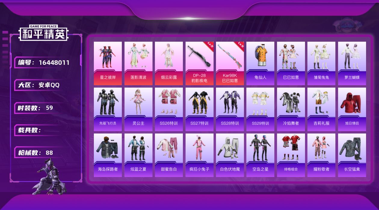 [16448011]安卓 手Q-3粉装-2特效枪-0载具-1粉色飞行器-24634热力值-2王牌印记-59套装-88枪皮
