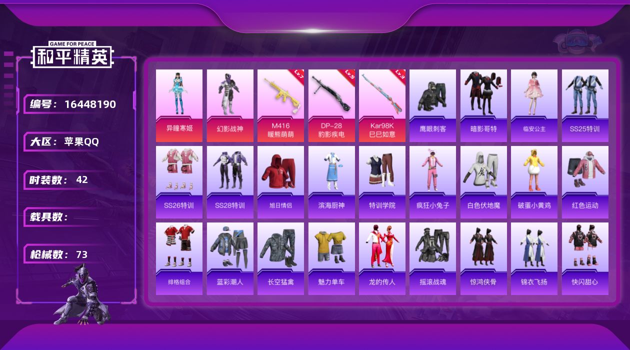 [16448190]苹果 手Q-2粉装-3特效枪-0载具-2粉色飞行器-20419热力值-3王牌印记-42套装-73枪皮 【热门品类】:套装-暗影哥特 【粉色套装】:粉装-幻影战神,角色-异瞳寒姬 【粉色枪皮等级】:M416-暖熊萌萌(七级),Kar98K-巳巳如意(三级),DP-28-豹影疾电(五级) 【粉色枪皮】:M416-暖熊萌萌,Kar98K-巳巳如意,DP-28-豹影疾电 【粉色飞行器】:萌物绒绒飞行器 【粉色降落伞】:极限特训降落伞,暖熊萌萌降落伞,炫彩糖果降落伞 【稀有套装】:套装-雪国风尚,套装-炫彩糖果,角色-临安公主 【稀有枪皮】:AUG-冰晶雪宝,AKM-影袭,AKM-龙的传人,M16A4-幻世战舞者,SCAR-L-炫彩节奏,AUG-天降萌叽,AUG-青春冒险家,M762-天降萌叽,Mk47-炫光之旅,AC-VAL-快闪甜心,蜜獾-天降萌叽,UZI-天降萌叽,UZI-幻影战神,UZI-影袭,UMP45-炫光之旅,UMP45-生命誓言,Vector-生命誓言,Vector-田园牧歌,Vector-金玉无双,汤姆逊-天降萌叽,P90-快闪甜心,P90-飞驰魅影,P90-巳巳如意,AWM-盛世惊鸿,Mini14-金玉无双,M417-惊鸿侠骨,MK20-H-快闪甜心,M200-惊鸿侠骨,S686-千金淑猫,S12K-玩趣呆呆,AA12-G-炫光之旅,M249-彩虹符号,DP-28-彩虹符号,MG3-幻世战舞者,MG3-惊鸿侠骨,短管霰弹-星穹咏叹调,沙漠之鹰-快闪甜心,爆炸猎弓-惊鸿侠骨,平底锅-无垠阁 【其他套装】:套装-STE战队服,套装-SS25特训,套装-SS26特训,套装-SS28特训,套装-旭日情侣,套装-暗影哥特,套装-滨海厨神,套装-特训学院,套装-疯狂小兔子,套装-白色伏地魔,套装-破蛋小黄鸡,套装-红色运动,套装-绯格组合,套装-蓝彩潮人,套装-长空猛禽,套装-魅力单车,套装-龙的传人,套装-鹰眼刺客,套装-摇滚战魂,套装-惊鸿侠骨,套装-锦衣飞扬,套装-快闪甜心,套装-春光漫游,套装-无暇誓言 【营地ID】:917303245