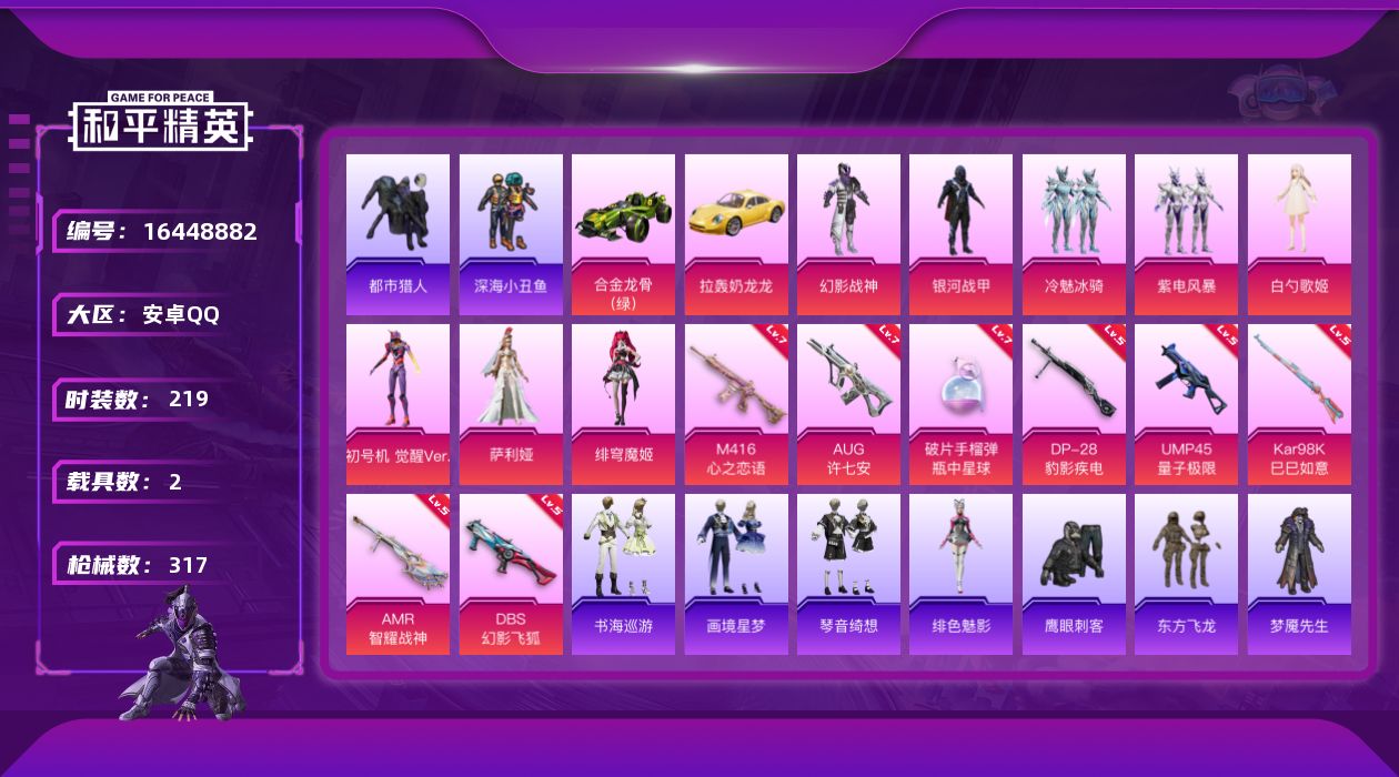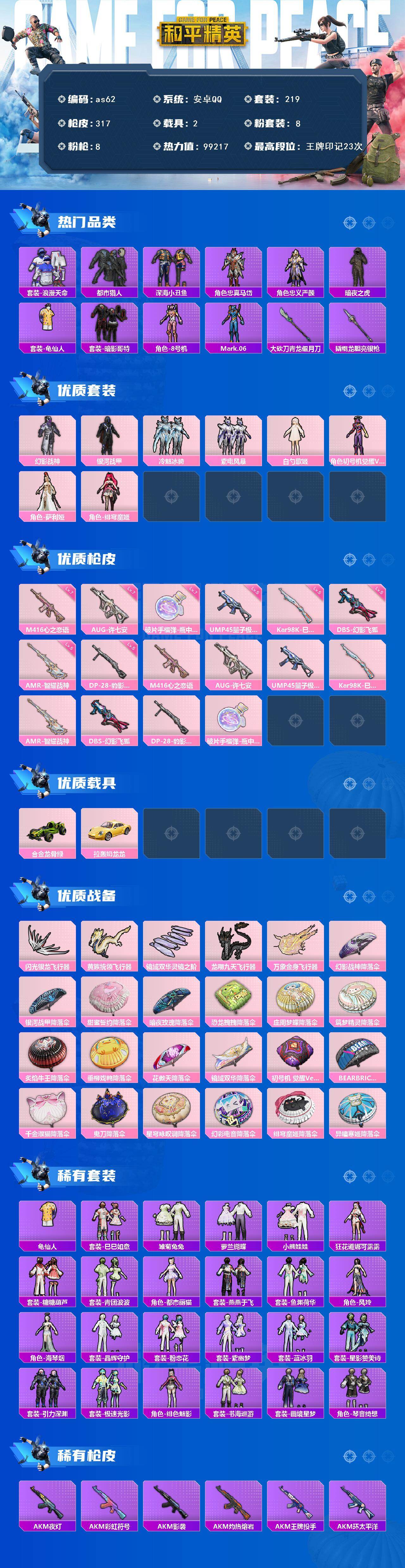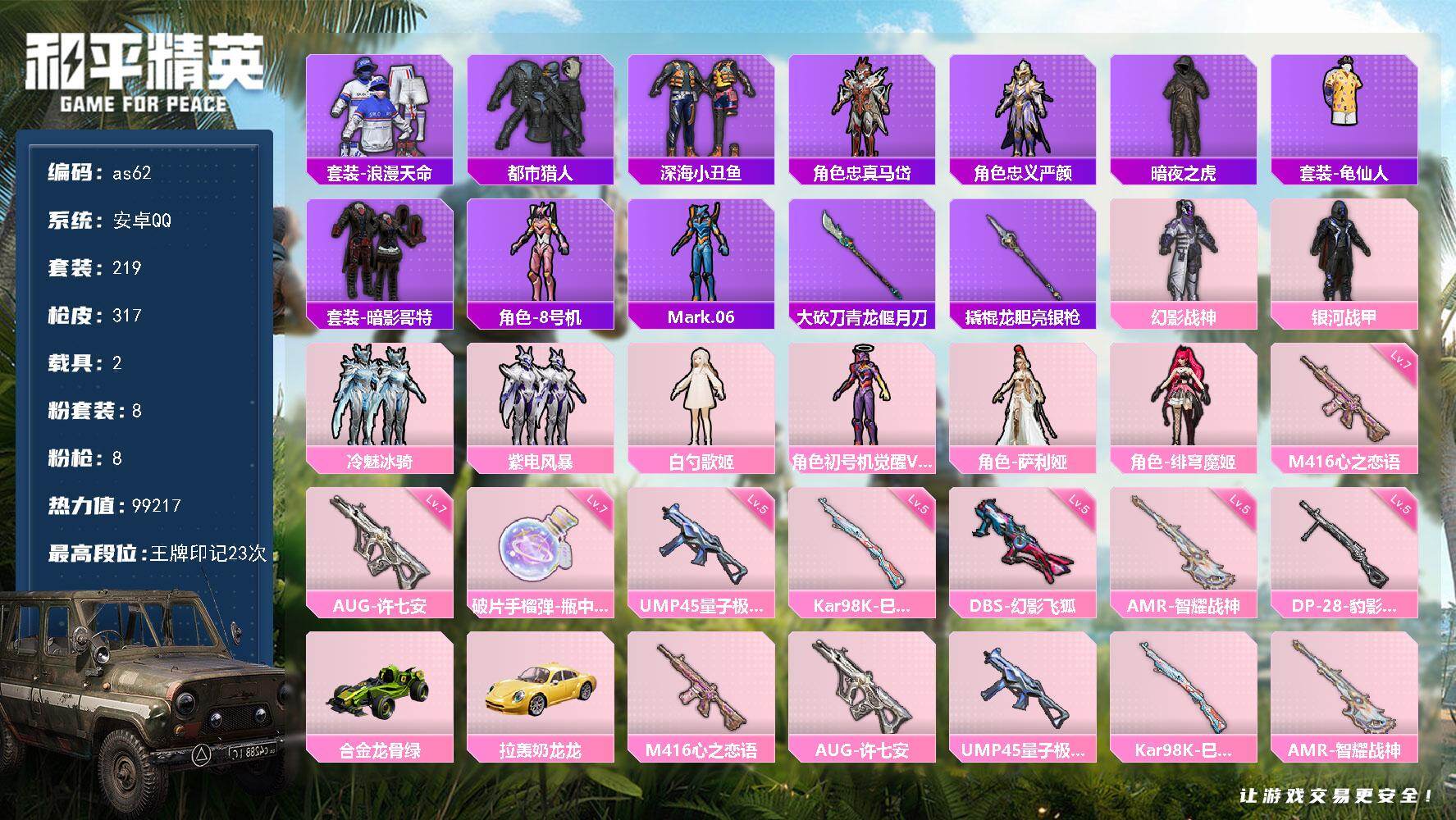 [16448882]安卓 手Q-8粉装-8特效枪-2载具-6粉色飞行器-99217热力值-23王牌印记-219套装-317枪皮