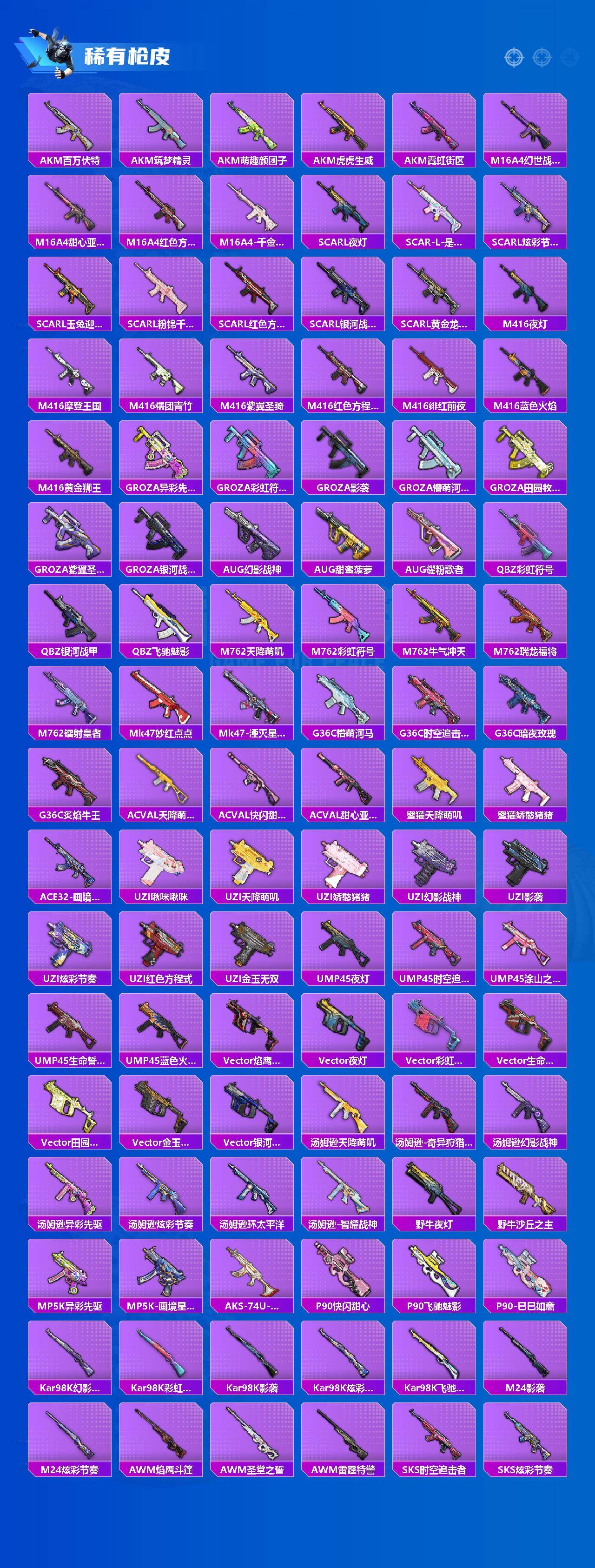 【稀有枪皮】:AKM-夜灯,AKM-彩虹符号,AKM-影袭,AKM-灼热熔岩,AKM-王牌投手,AKM-环太平洋,AKM-百万伏特,AKM-筑梦精灵,AKM-萌趣颜团子,AKM-虎虎生威,AKM-