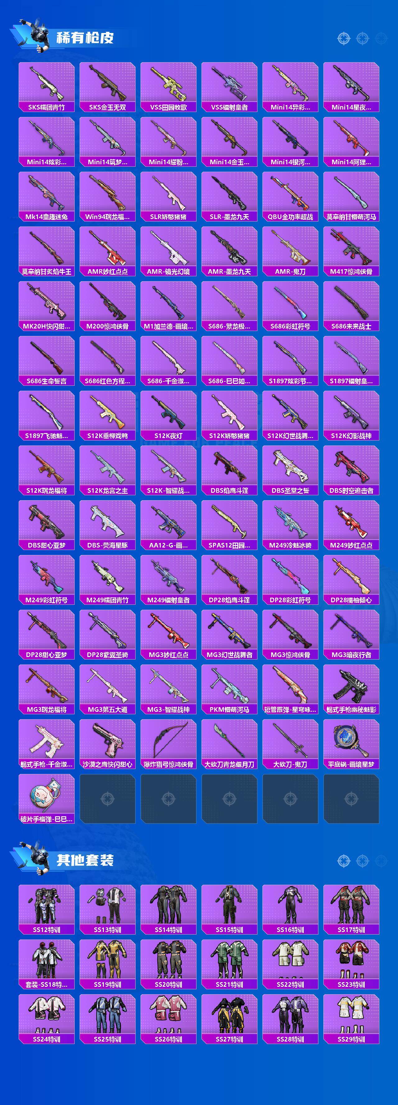 - [11623490]4特效枪 2印记 可二次 可修改实名 优质装备:AUG-暖羊咩咩,AMR-智耀战神,Kar98K-巳巳如意 稀有枪皮:DP-28-豹影疾电 六级特效枪:六级AMR-智耀战神 五级特效枪:五级DP-28-豹影疾电,五级AUG-暖羊咩咩 四级特效枪:四级Kar98K-巳巳如意 紫色装扮:霓虹热舞,云朵鹅,雪绒豹,SS33特训套装,顶瓜瓜,快乐星愿,缤纷果语,耀动青春,黄色运动,黑色伏地魔,柠萌假日,海岛探路者,夏日倾情,破蛋小黄鸡,异域银装,浪漫天命,小鸟芋圆,蓝冰羽,紫幽梦,SS32特训服(SS32特训套装)