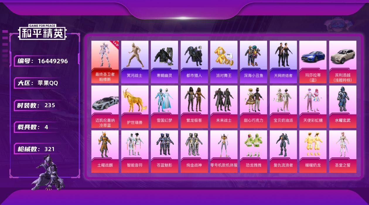 [16449296]可二次【特价出售/店主推荐】苹果 手Q-无敌战神框-1神装-19粉装-17特效枪-4载具-9粉色飞行器-117558热力值-15王牌印记-235套装-321枪皮