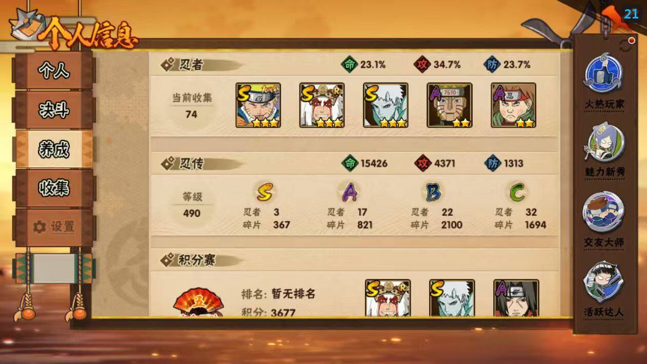 [16450496]3S级忍者数-17A级忍者数 【S级忍者】:自来也「舞之豪杰」(3星),漩涡鸣人·宇智波佐助(3星),宇智波带土「十尾人柱力」(3星) 【A级忍者】:迪达拉(2星),干柿鬼鲛(2星),机械鸣人「初始形态」(2星),迈特凯(2星),旗木卡卡西「忍界大战」(2星),蝎(2星),小南「漂泊浪客」(2星),猿飞阿斯玛(2星),宇智波鼬(2星),药师兜「侠隐江湖」(2星),长十郎「六代目水影」(2星),猿飞木叶丸「博人传」(2星),秋道丁次「忍界大战」(2星),土台「忍界大战」(2星),大野木「侠隐江湖」(2星),巳月「仙人模式」(2星),迈特凯「青春爆炸」(2星)