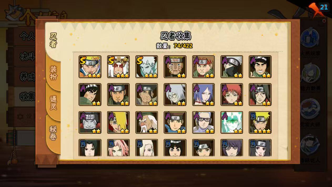 【S级忍者】:自来也「舞之豪杰」(3星),漩涡鸣人·宇智波佐助(3星),宇智波带土「十尾人柱力」(3星)