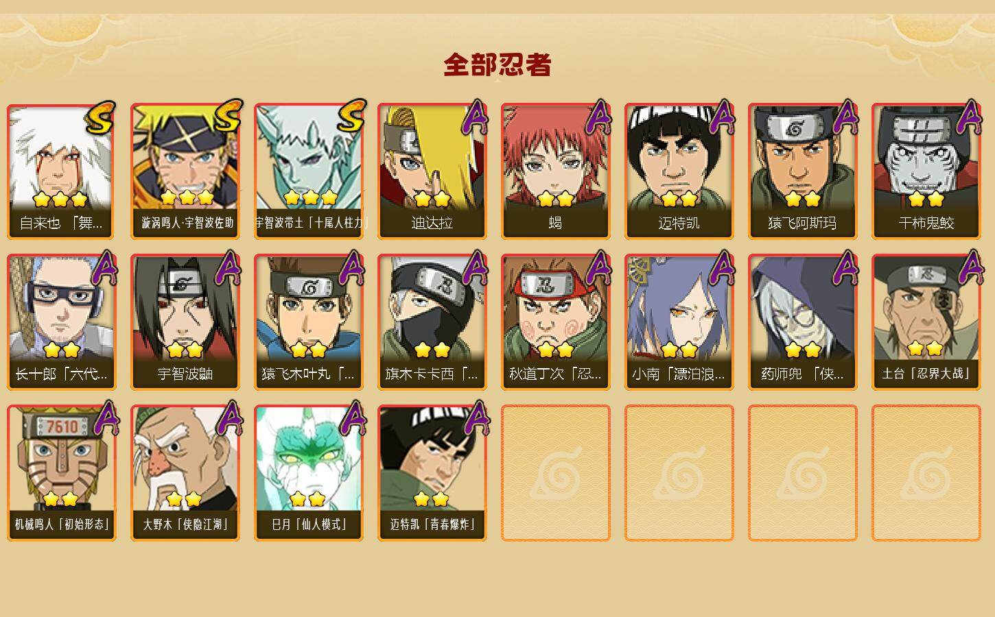 【A级忍者】:迪达拉(2星),干柿鬼鲛(2星),机械鸣人「初始形态」(2星),迈特凯(2星),旗木卡卡西「忍界大战」(2星),蝎(2星),小南「漂泊浪客」(2星),猿飞阿斯玛(2星),宇智波鼬(2星),药师兜「侠隐江湖」(2星),长十郎「六代目水影」(2星),猿飞木叶丸「博人传」(2星),秋道丁次「忍界大战」(2星),土台「忍界大战」(2星),大野木「侠隐江湖」(2星),巳月「仙人模式」(2星),迈特凯「青春爆炸」(2星)