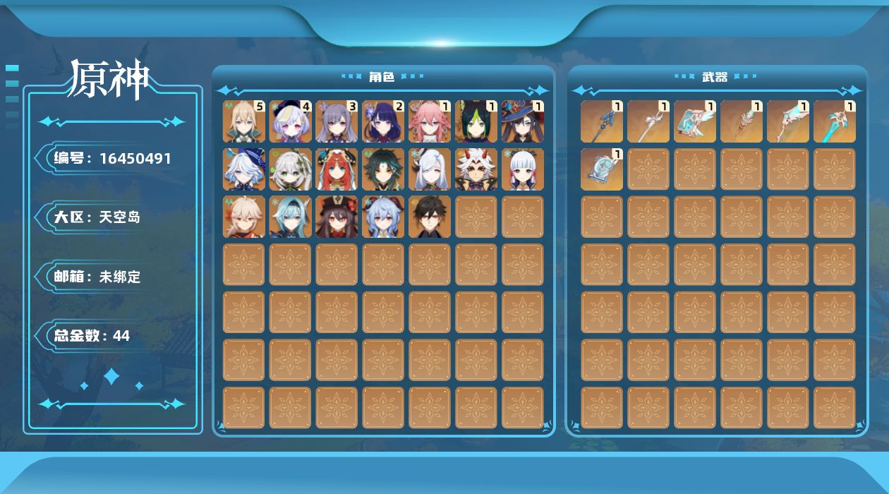 0命芙宁娜,0命纳西妲,0命妮露,1命提纳里,1命八重神子,0命申鹤,0命荒泷一斗,0命优菈,2命雷电将军,0命枫原万叶,0命神里绫华,0命钟离,0命胡桃,0命甘雨,0命魈,3命刻晴,4命七七,5命琴,1命莫娜,精1息灾,精1四风原典,精1天空之脊,精1天空之翼,精1天空之刃,精1天空之卷,精1风鹰剑