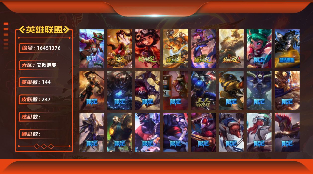 [16451376]【店主推荐捡漏号】未定级段位-144英雄-247皮肤-0炫彩-0终极-2神话-40限定-10传说-58史诗