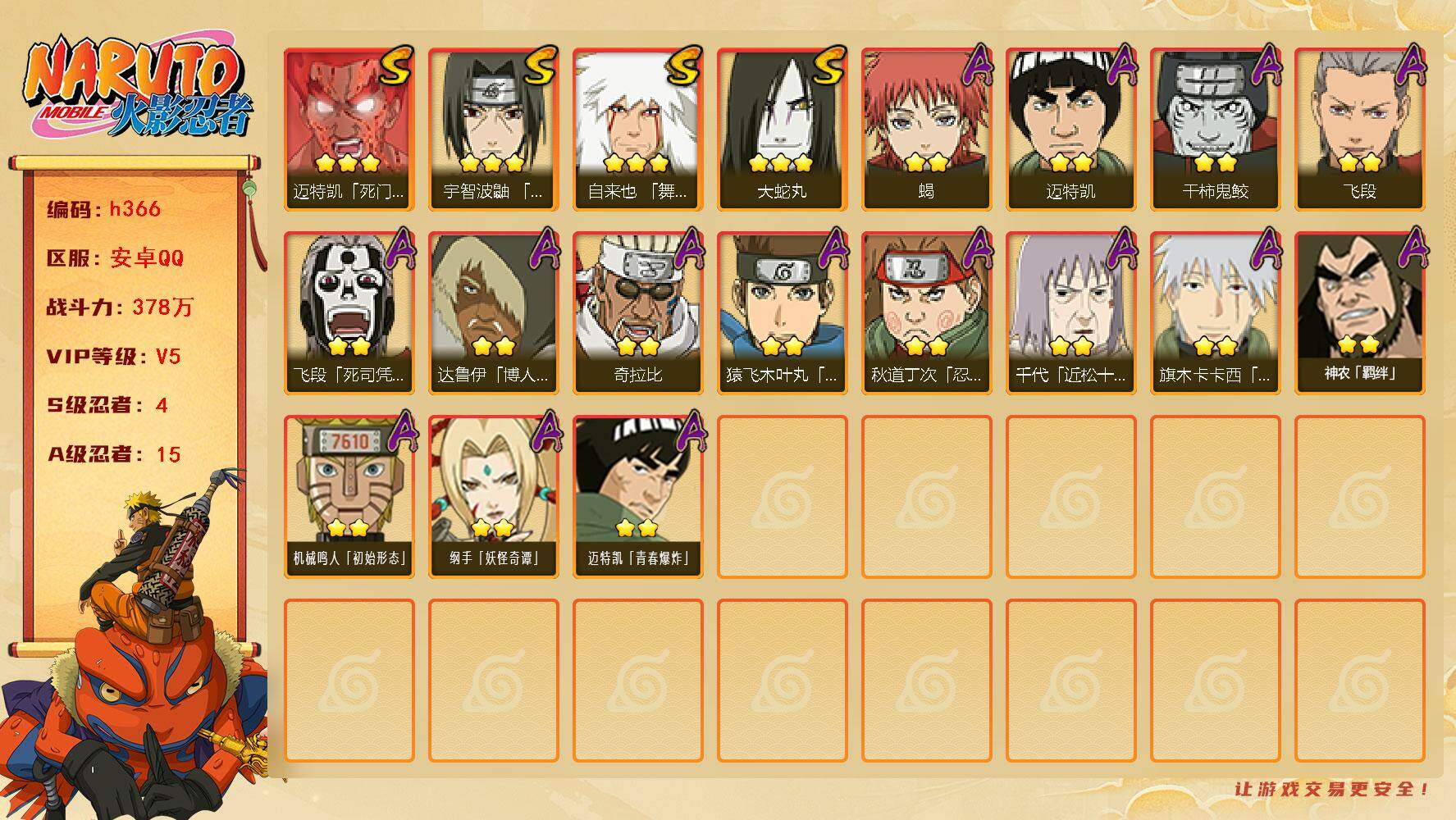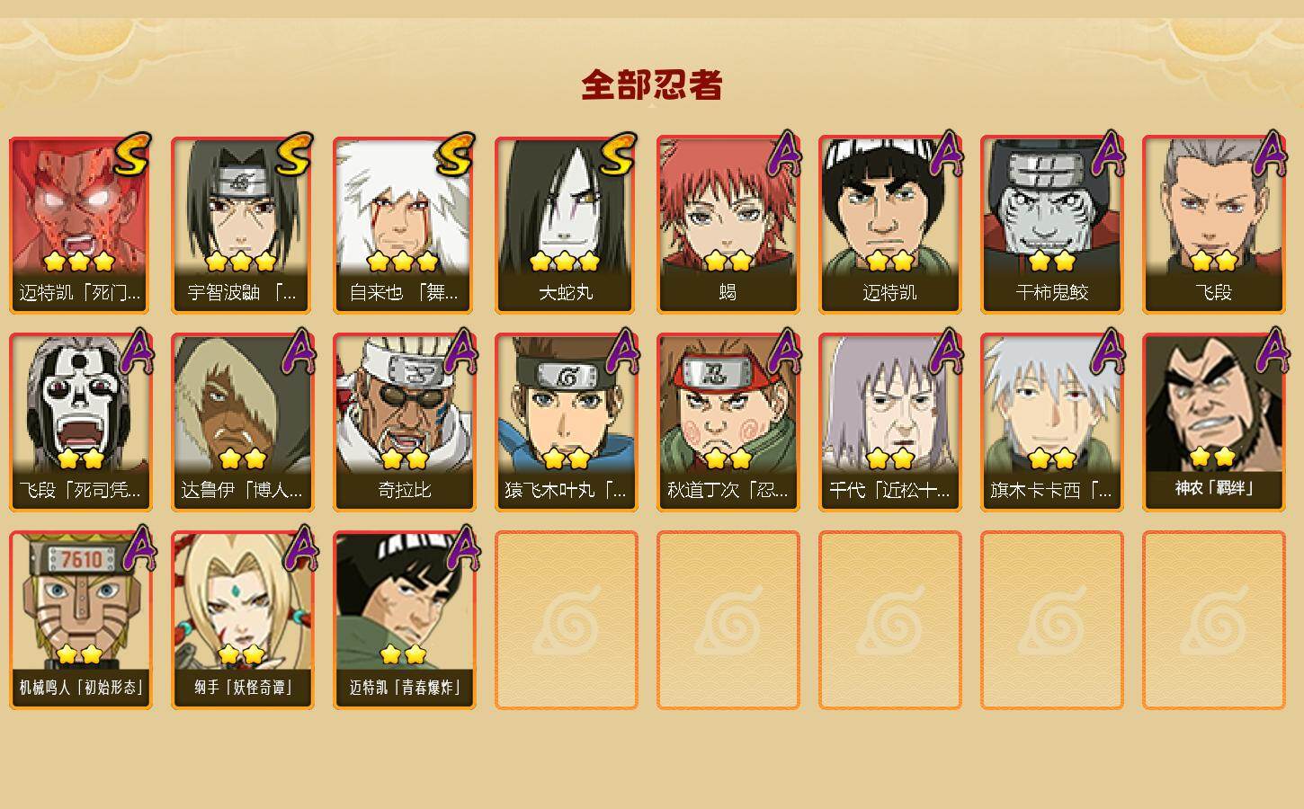 【S级忍者】:宇智波鼬「须佐能乎」(3星),自来也「舞之豪杰」(3星),大蛇丸(3星),迈特凯「死门」(3星)