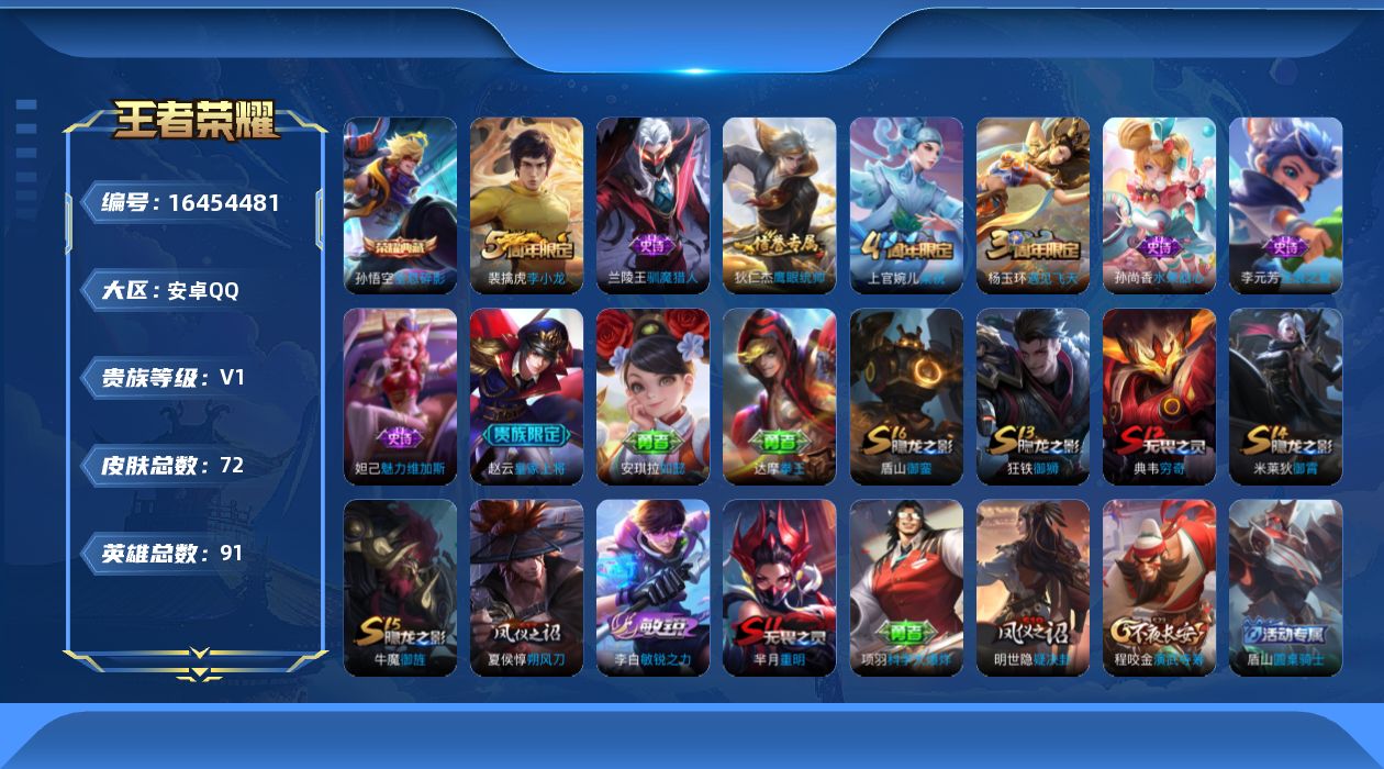 [16454481]【特价急出/详情看图】安卓Q-V0-尊贵铂金IV段位-87英雄-72皮肤-1典藏皮肤-9史诗 【荣耀典藏】:孙悟空全息碎影 【限定皮肤】:狄仁杰阴阳师,赵云皇家上将,芈月重明,周瑜赤莲之焰,夏侯惇朔风刀,典韦穷奇,狄仁杰万华元夜,项羽海滩派对,程咬金演武夺筹,兰陵王驯魔猎人,牛魔御旌,钟馗驱傩正仪,杨玉环遇见飞天,鬼谷子原初探秘者,弈星混沌棋,明世隐疑决卦,裴擒虎李小龙,狂铁御狮,米莱狄御霄,盾山御銮,上官婉儿梁祝 【赛季限定】:芈月重明,典韦穷奇,狂铁御狮,米莱狄御霄,牛魔御旌,盾山御銮,夏侯惇朔风刀,弈星混沌棋,明世隐疑决卦,鬼谷子原初探秘者,狄仁杰万华元夜,程咬金演武夺筹,钟馗驱傩正仪 【战令限定】:兰陵王驯魔猎人,周瑜赤莲之焰 【史诗皮肤】:赵云皇家上将,孙尚香水果甜心,妲己魅力维加斯,李元芳逐浪之夏,杨玉环遇见飞天,狄仁杰鹰眼统帅,兰陵王驯魔猎人,上官婉儿梁祝,裴擒虎李小龙 【其他皮肤】:项羽海滩派对,韩信教廷特使,程咬金星际陆战队,扁鹊化身博士,妲己少女阿狸,典韦黄金武士,亚瑟死亡骑士,达摩拳王,花木兰兔女郎,张飞五福同心,甄姬花好人间,宫本武藏万象初新,狄仁杰阴阳师,钟无艳海滩丽影,王昭君幻想奇妙夜,芈月重明,典韦穷奇,李白敏锐之力,狂铁御狮,安琪拉如懿,项羽科学大爆炸,米莱狄御霄,明世隐虹云星官,张良幽兰居士,庄周奇妙博物学,牛魔御旌,盾山御銮,夏侯惇朔风刀,周瑜赤莲之焰,弈星混沌棋,哪吒次元突破,鲁班七号黑桃队长,明世隐疑决卦,盾山圆桌骑士,廉颇无尽征程,鬼谷子原初探秘者,狄仁杰万华元夜,程咬金演武夺筹,钟馗驱傩正仪,高渐离金属狂潮,小乔万圣前夜,孙悟空西部大镖客,妲己仙境爱丽丝,周瑜海军大将,后羿精灵王,李元芳特种部队,虞姬加勒比小姐,马可波罗激情绿茵,哪吒三太子,干将莫邪第七人偶,鬼谷子阿摩司公爵,铠龙域领主,杨玉环霓裳曲,裴擒虎街头旋风,元歌午夜歌剧院,盾山极冰防御线,伽罗花见巫女,李信灼热之刃,上官婉儿修竹墨客,嫦娥露花倒影,盘古创世神祝,马超幸存者 【营地ID】:339557200