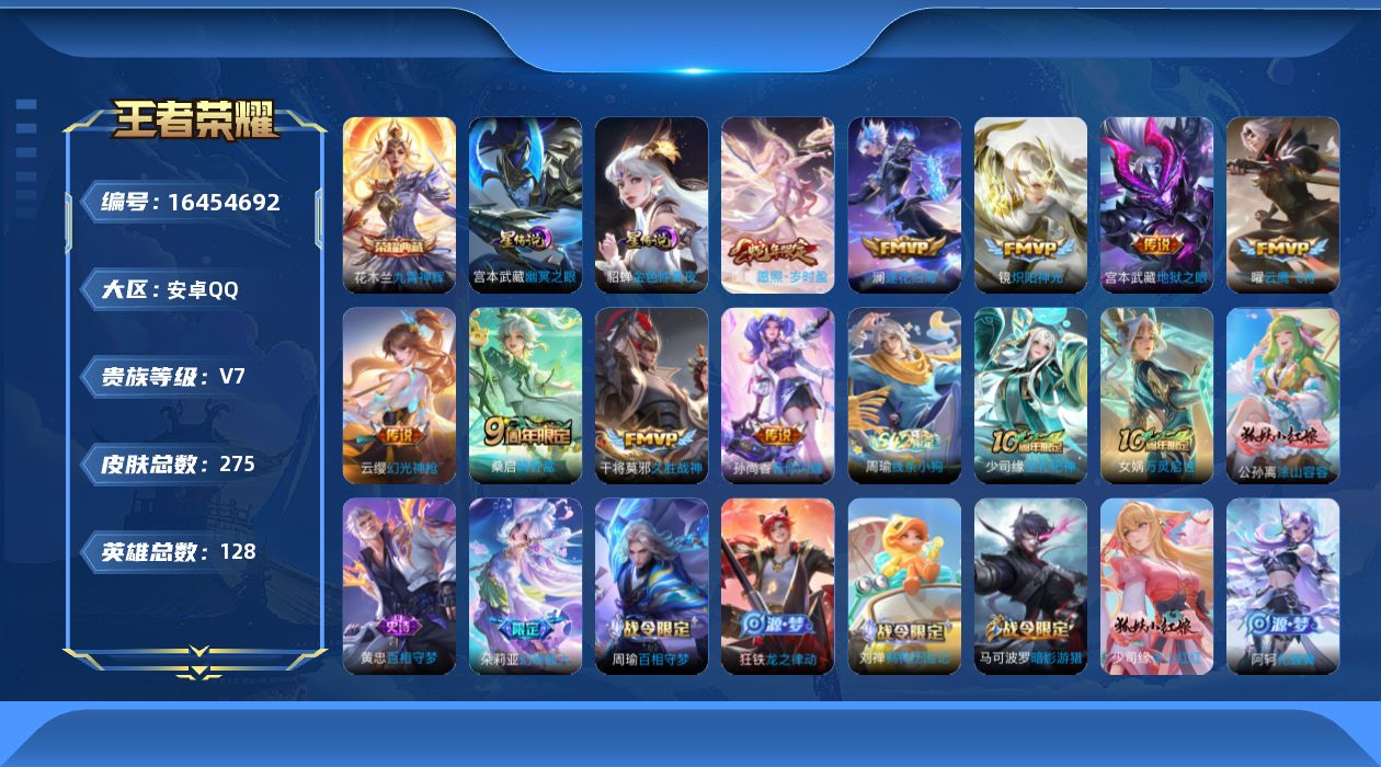 [16454692]可二次【特价出售/店主推荐】安卓Q-V7-永恒钻石V段位-128英雄-275皮肤-1典藏皮肤-2星传说-9传说-74史诗