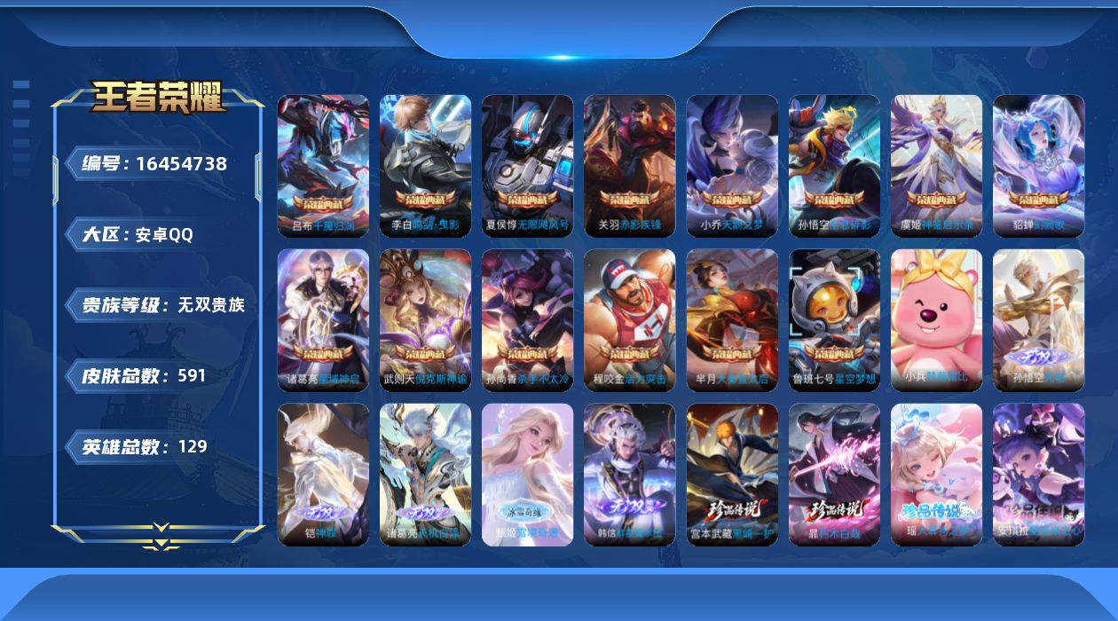 [16454738]可二次【特价出售/店主推荐/3621星币/37段发育路/33段游走/30段中路/1省标/7市标】:安卓Q-V11-最强王者段位-129英雄-591皮肤-14典藏皮肤-1典藏英雄-5无双-5珍品传说-9星元-68传说-204史诗