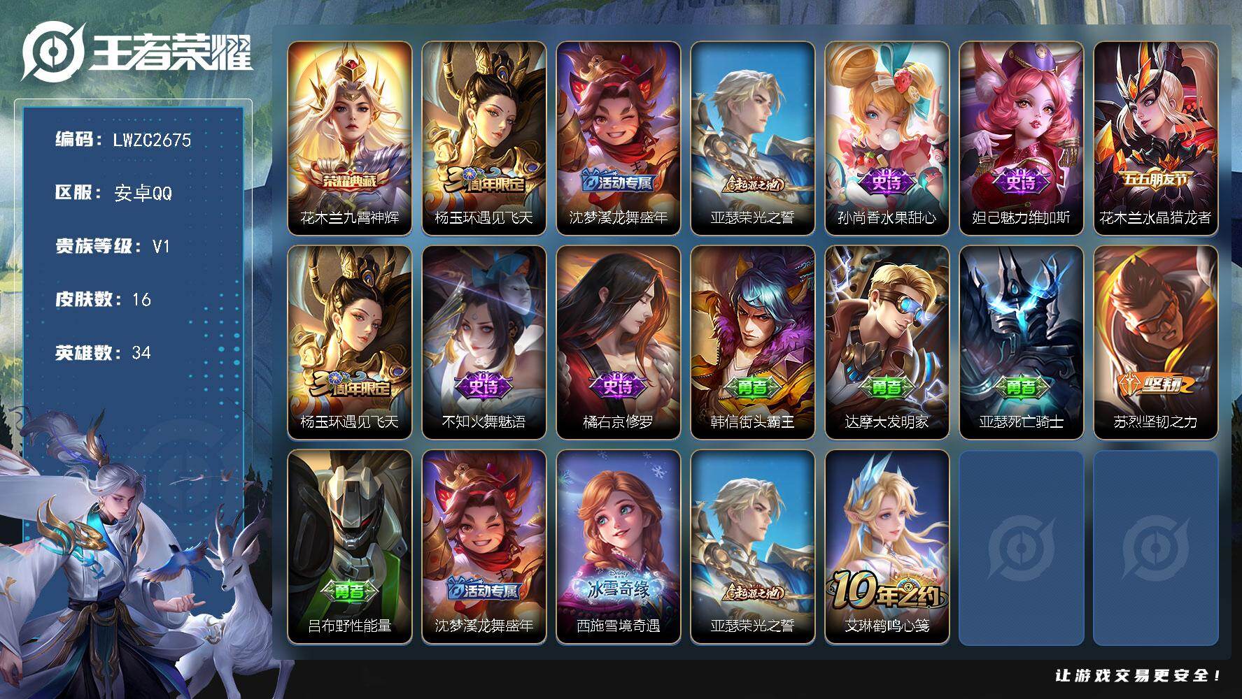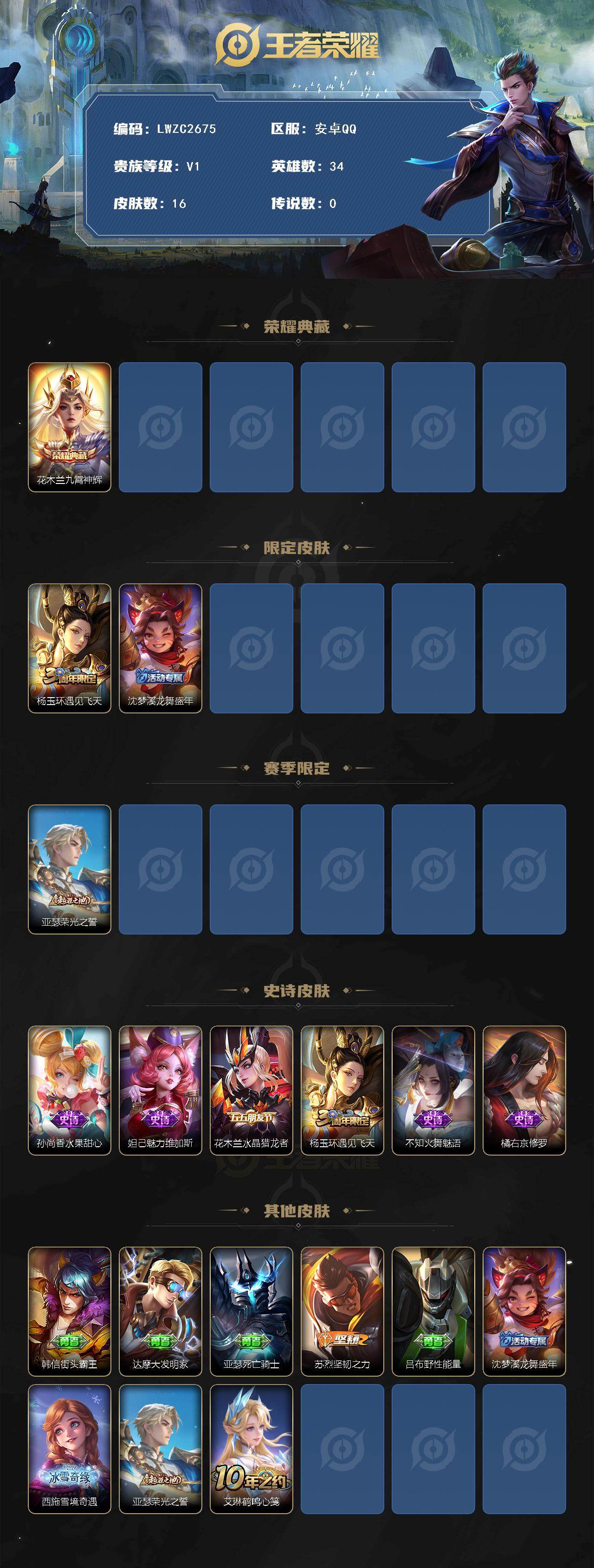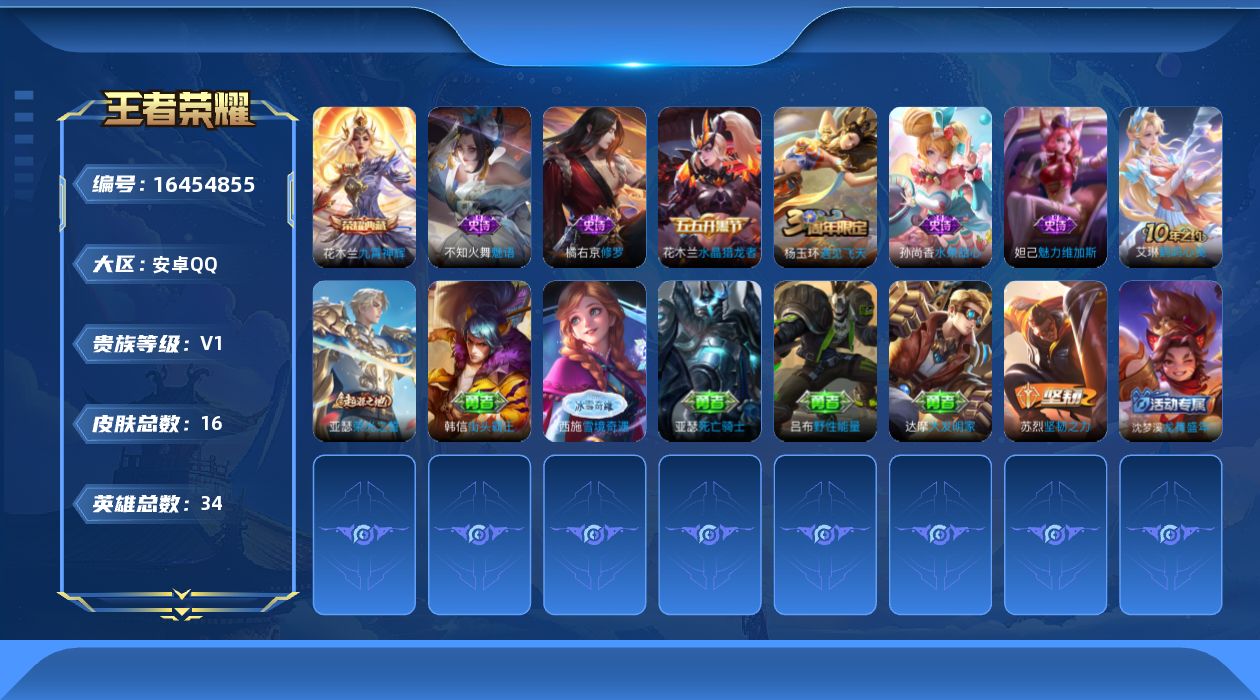[16454855]可二次【特价出售/店主推荐】:安卓Q-V1-尊贵铂金I段位-34英雄-16皮肤-1典藏皮肤-6史诗