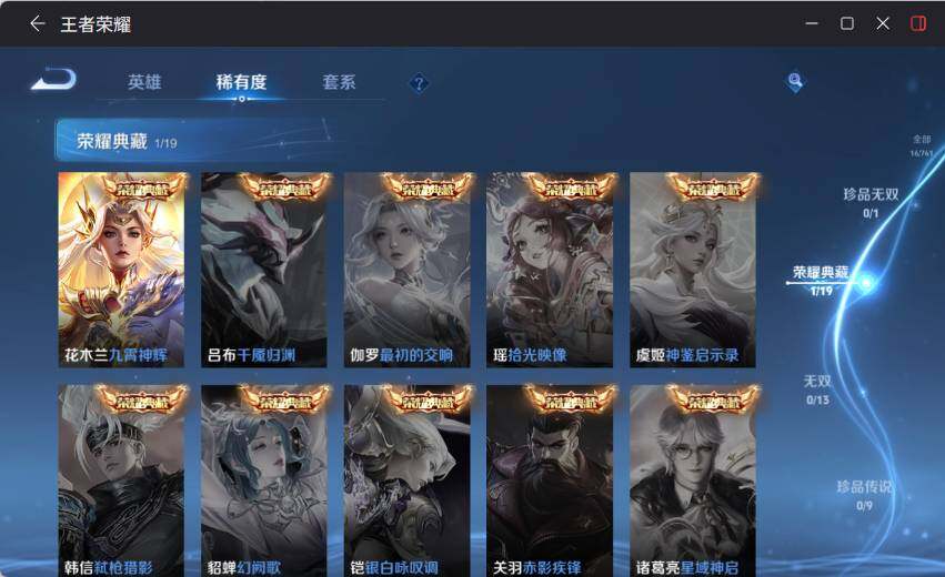 - [11632285]V7 1典藏 4传说 123英雄 269皮肤 可修改实名 优质装备:弑枪猎影(韩信典藏),云鹰飞将(小将军),一念神魔 珍宝阁皮:妄想食味,女武神 限定皮:鸣野蒿,至尊宝,白虎志(电光耗子),时之彼端,白鹤梁神女,神威(电光马子),五谷丰年,冰锋战神,天狼绘梦者,李小龙,朱雀志(守约年限),冰霜恋舞曲 史诗皮:龙之律动,百相守梦-黄忠,紫霞仙子,苍穹之光,黄金分割率,江河有灵,百解令(蒙犽),高渐离燃音魔法,冰冠公主,晚萤,电玩·爆裂旋风,末日机甲-吕布,猫狗日记-孙策,乱世虎臣,节奏热浪,摇滚巨星,水果甜心,绅士熊喵,天才门将,星夜王子,心灵骇客,德古拉伯爵,暗隐猎兽者,幽灵船长,鬼剑武藏,暗渊魔法,舞动绿茵,地狱岩魂,纤云弄巧,繁星吟游(呼啦呼啦),拒霜思,缤纷独角兽,乘风破浪,逐浪之夏,水晶猎龙者,曙光守护者,金属风暴,原初追逐者,圣诞狂欢,圣诞恋歌,鹰眼统帅,王者之锤,魅力维加斯,黎明之约,无心