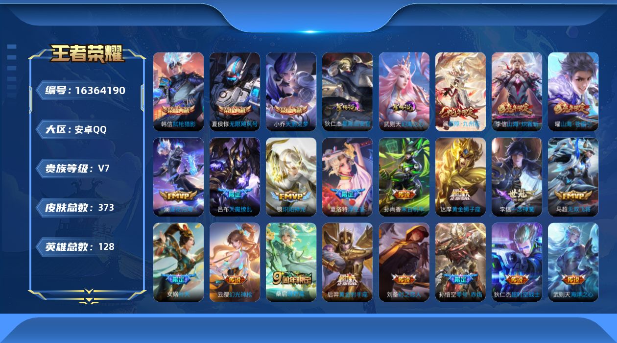 [16364190]【店主推荐捡漏号!可直接换绑】:安卓Q-V9-最强王者段位-128英雄-373皮肤-3典藏皮肤-1典藏英雄-3星元-25传说-114史诗