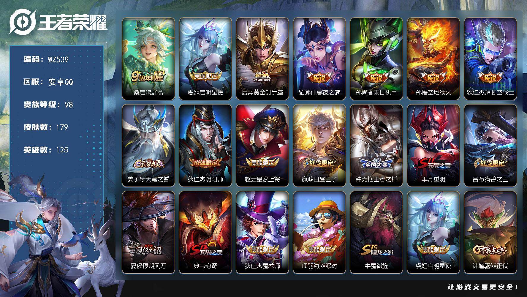 [16456442]安卓Q-179皮肤-7传说-39史诗 【传说皮肤】:桑启鸣野蒿,虞姬启明星使,后羿黄金射手座,貂蝉仲夏夜之梦,孙尚香末日机甲,孙悟空地狱火,狄仁杰超时空战士 【限定皮肤】:姜子牙天穹之誓,狄仁杰阴阳师,赵云皇家上将,嬴政白昼王子,钟无艳王者之锤,芈月重明,吕布猎兽之王,夏侯惇朔风刀,典韦穷奇,狄仁杰魔术师,项羽海滩派对,牛魔御旌,虞姬启明星使,钟馗驱傩正仪,东皇太一逐梦之光,弈星混沌棋,明世隐疑决卦,裴擒虎擒涛扼浪,狂铁御狮,米莱狄御霄,云中君纤云弄巧,盾山御銮,鲁班大师探海日志,桑启海盐诗旅,张良古海寻踪,鬼谷子天穹祈灯,姬小满妄想食味,沈梦溪龙舞盛年,刘邦剑破天穹,刘备异域游侠,周瑜熔金海岸 【赛季限定】:芈月重明,夏侯惇朔风刀,典韦穷奇,张良古海寻踪,牛魔御旌,钟馗驱傩正仪,弈星混沌棋,明世隐疑决卦,裴擒虎擒涛扼浪,狂铁御狮,米莱狄御霄,盾山御銮,鲁班大师探海日志,桑启海盐诗旅,鬼谷子天穹祈灯,刘邦剑破天穹,姜子牙天穹之誓 【战令限定】:嬴政白昼王子,吕布猎兽之王 【史诗皮肤】:鲁班七号电玩小子,露娜紫霞仙子,阿轲暗夜猫娘,钟无艳王者之锤,赵云皇家上将,赵云未来纪元,貂蝉圣诞恋歌,甄姬冰雪圆舞曲,王昭君偶像歌手,狄仁杰魔术师,宫本武藏鬼剑武藏,孙尚香水果甜心,嬴政摇滚巨星,妲己魅力维加斯,墨子金属风暴,曹操幽灵船长,李白千年之狐,韩信白龙吟,兰陵王暗隐猎兽者,诸葛亮黄金分割率,亚瑟心灵战警,雅典娜冰冠公主,百里守约特工魅影,铠曙光守护者,刘禅天才门将,李元芳逐浪之夏,程咬金功夫厨神,白起星夜王子,阿轲节奏热浪,东皇太一逐梦之光,嬴政白昼王子,孙策猫狗日记,伽罗箭羽风息,狄仁杰鹰眼统帅,橘右京修罗,云中君纤云弄巧,姬小满妄想食味,黄忠怒海争锋,牛魔星界战将 【其他皮肤】:项羽海滩派对,韩信教廷特使,韩信街头霸王,露娜哥特玫瑰,阿轲爱心护理,达摩大发明家,赵云忍炎影,芈月红桃皇后,扁鹊化身博士,宫本武藏未来纪元,安琪拉玩偶对对碰,孙膑天使之翼,姜子牙时尚教父,妲己少女阿狸,典韦黄金武士,亚瑟死亡骑士,达摩拳王,花木兰兔女郎,张飞五福同心,刘备万事如意,宫本武藏万象初新,后羿阿尔法小队,狄仁杰阴阳师,刘备纽约教父,刘备汉昭烈帝,钟无艳海滩丽影,宫本武藏霸王丸,芈月重明,狂铁命运角斗场,老夫子功夫老勺,孙尚香沉稳之力,典韦穷奇,诸葛亮掌控之力,李白敏锐之力,鬼谷子幻