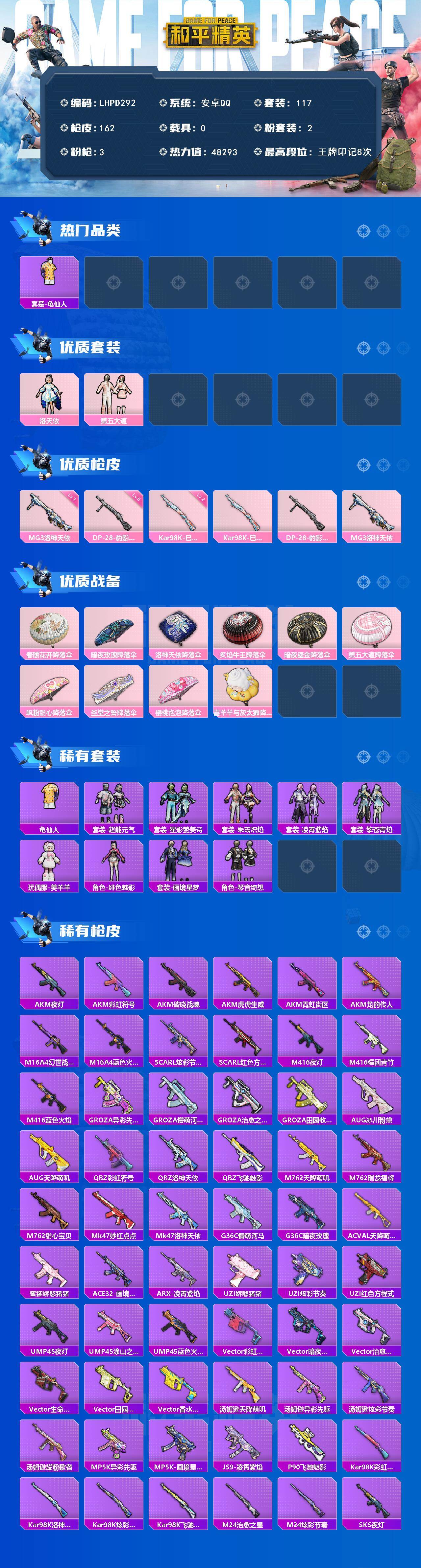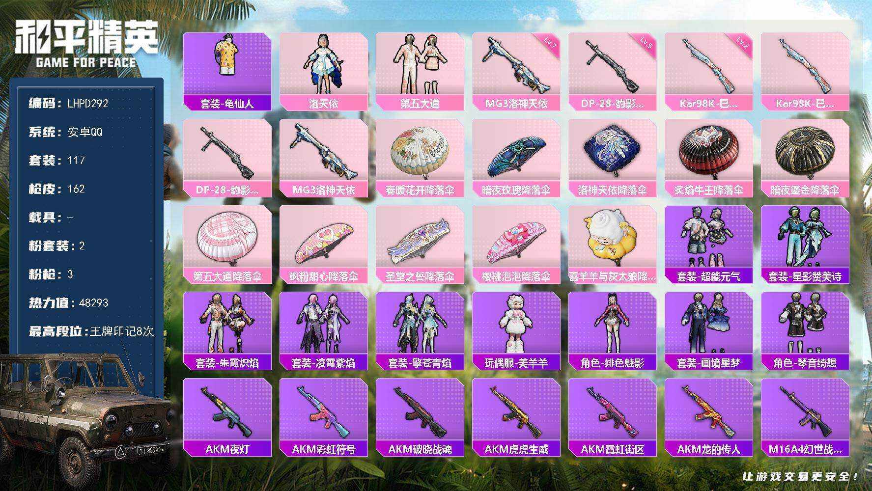 [16456604]【店主推荐捡漏号!可直接换绑】安卓 手Q-2粉装-3特效枪-0载具-1粉色飞行器-48293热力值-8王牌印记-117套装-162枪皮【热门品类】:套装-龟仙人【粉色套装】:角色-洛天依,粉装-第五大道【粉色枪皮等级】:Kar98K-巳巳如意(二级),DP-28-豹影疾电(五级),MG3-洛神天依(七级)【粉色枪皮】:Kar98K-巳巳如意,DP-28-豹影疾电,MG3-洛神天依