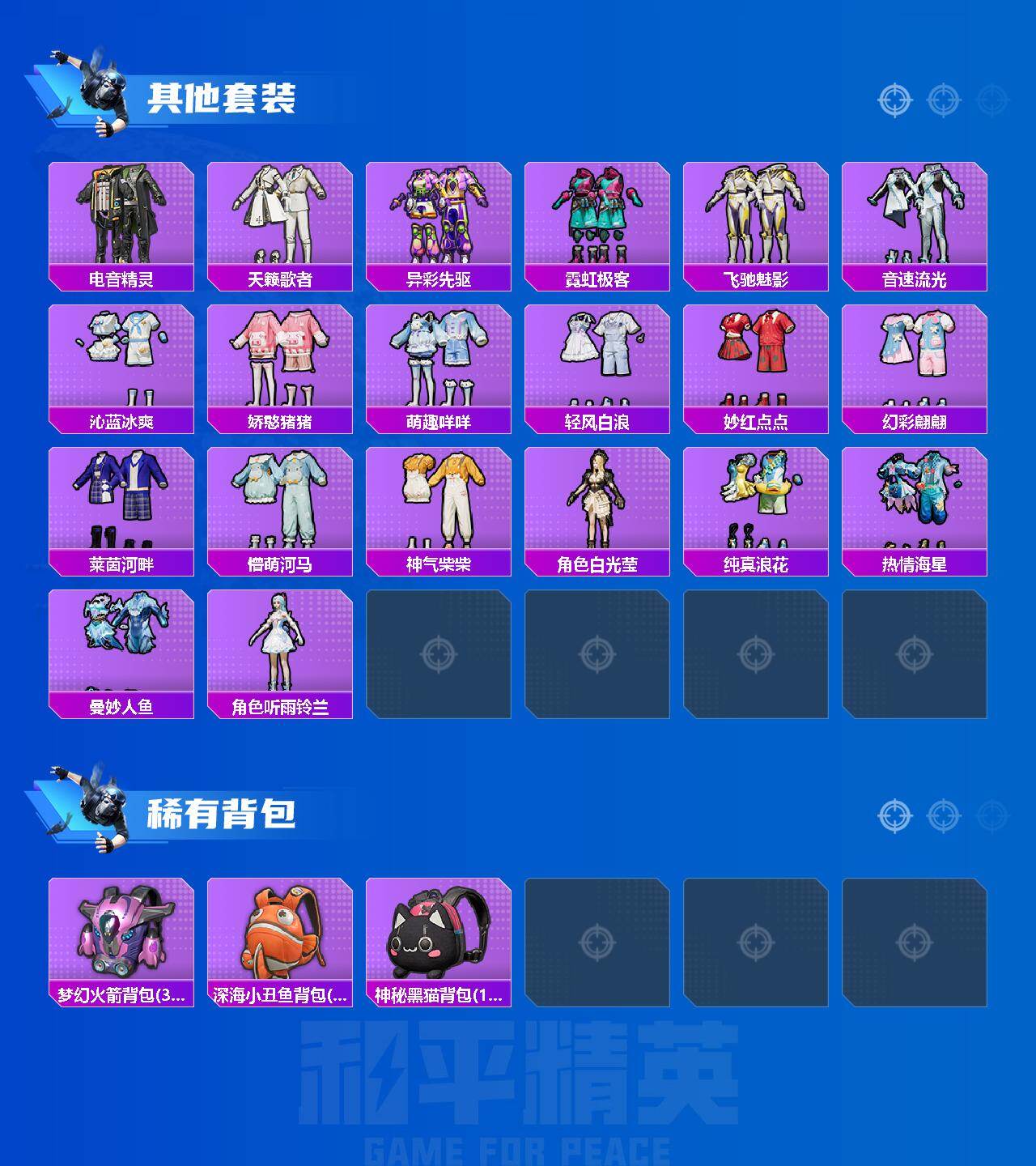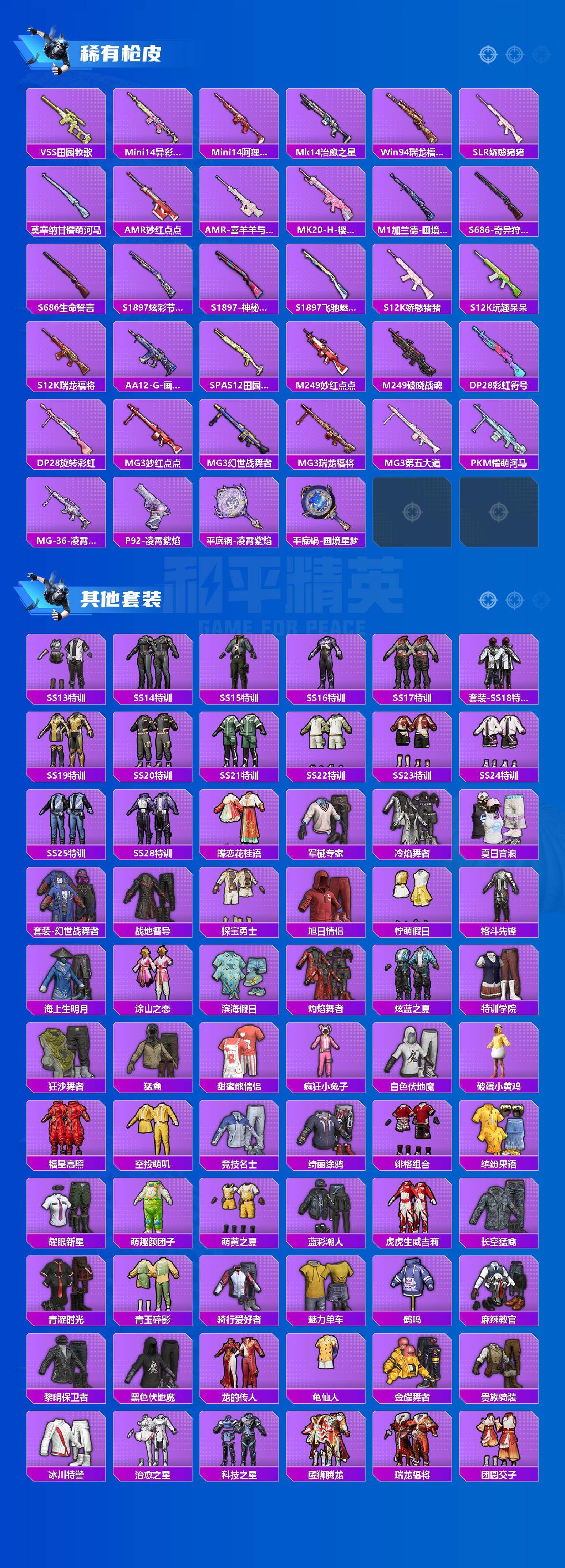 - [11471469]6粉装 6特效枪 6印记 可二次 可修改实名 身法装备:都市猎人,暗影哥特(红眼罩) 优质装备:都市猎人 热门装扮:千金淑猫,冷漠罗丽,香水柠檬,炙焰红王,山涧鹿灵,守护天翼,鹰眼刺客,深海小丑鱼,都市猎人,暗夜魅影 稀有枪皮:AMR-智耀战神,Kar98K-巳巳如意,UMP45量子极限,M762-青锋波束,M416电玩时刻 六级特效枪:六级AMR-智耀战神 五级特效枪:五级M762-青锋波束,五级UMP45-量子极限,五级Kar98K-巳巳如意,五级DP-28-豹影疾电,五级M416-电玩时刻 紫色装扮:田园牧歌,轻风白浪,SS22特训,萌趣咩咩,甜心亚梦,虚音幻奏,SS20特训,SS21特训,娇憨猪猪,人气偶像,SS23特训,极速光影,SS15特训,SS13特训,SS14特训,冰爽海盐,浪漫樱花,飞驰魅影,SS18特训,浓情蜜辣,音速流光,极速竞梦,SS19特训,冰川特警,SS16特训,瑞龙福将,团圆交子,SS17特训,蓝色运动,虎虎生威吉莉,街头潮人,跃动心情,蓝彩潮人,都市漫游者,都市魅力,酒红色名流,酷潮明星,蓝色守护者,阳光火鸡,竞技勇士朋克,竞技达人朋克,红色运动,绮丽涂鸦,缤纷果语,耀眼新星,长空猛禽,冰河战士,龙魂突击队,蝶变,龟仙人,无面战甲,青年教官,飞行日记,骑行爱好者,魅力单车,鹤鸣,麻辣教官,黄色伏地魔,黄色名流,黄色运动,黑色伏地魔,福星高照,战地督导,探宝勇士,时尚圣诞,极速红龙,柠萌假日,格斗先锋,橘黑制服,怒火燎原,冷焰舞者,北国孤狼,吉莉礼服,完美偶像,帅气教官,幻世战舞者,幻影武者,甜蜜告白,狂沙舞者,猎鹰,猛禽,王牌教练,甜蜜熊情侣,白熊同盟,白色伏地魔,破晓战魂,破蛋小黄鸡,海岛探路者,深蓝色名流,湖蓝色名流,滨海假日,滨海厨神,牛气满满,灰色格斗者,灼焰舞者,炫蓝之夏,热血青春,牛气冲天,粉日山川,小熊娃娃,雏菊兔兔,萝兰蝴蝶,SS29特训,冰公主,纯真浪花,热情海星,曼妙人鱼,SS28特训,暗影刺翼,湖雨初晴,暗影哥特(红眼罩),玉兔迎春,巳巳如意,海琴烟,星途旅人,竞技名士,都市丽猫,SS25特训,SS24特训(SS24特训套装),幻羽潜行,焰鹰斗篷,幽夜迷踪,SS27特训,萌趣绒叽,浪漫天命,逆风勇士,SS6特训,SS11特训,耀粉歌者,大橘大利,原初圣火,SS9特训,SS8特训,SS10特训,纯白誓言,青玉碎影,