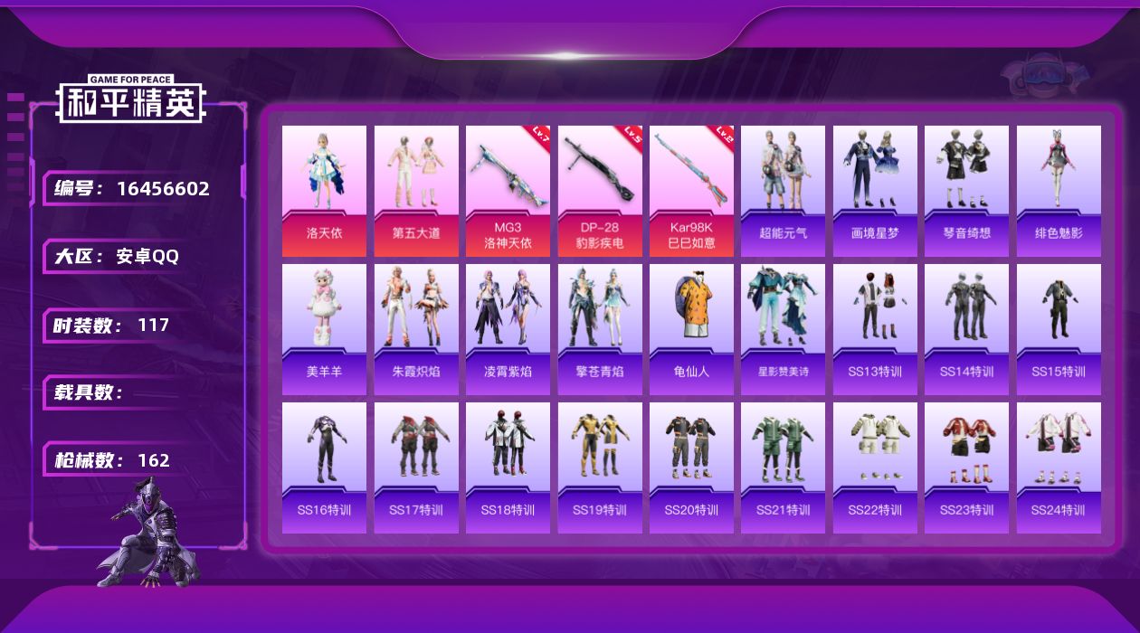 [16456602]【店主推荐捡漏号!可直接换绑】安卓 手Q-2粉装-3特效枪-0载具-1粉色飞行器-48293热力值-8王牌印记-117套装-162枪皮【热门品类】:套装-龟仙人【粉色套装】:角色-洛天依,粉装-第五大道【粉色枪皮等级】:Kar98K-巳巳如意(二级),DP-28-豹影疾电(五级),MG3-洛神天依(七级)【粉色枪皮】:Kar98K-巳巳如意,DP-28-豹影疾电,MG3-洛神天依