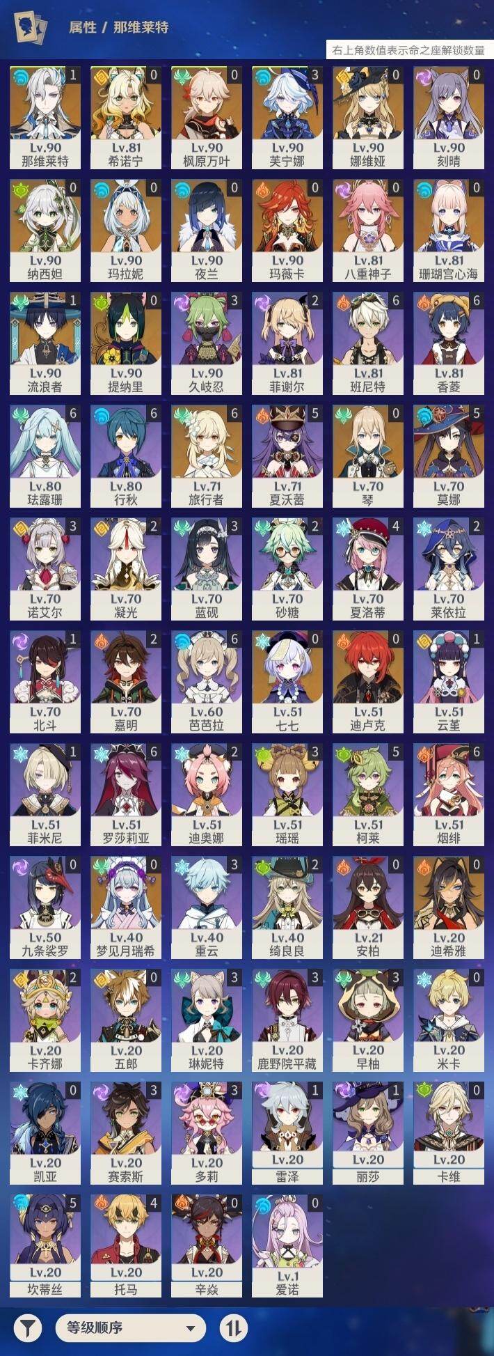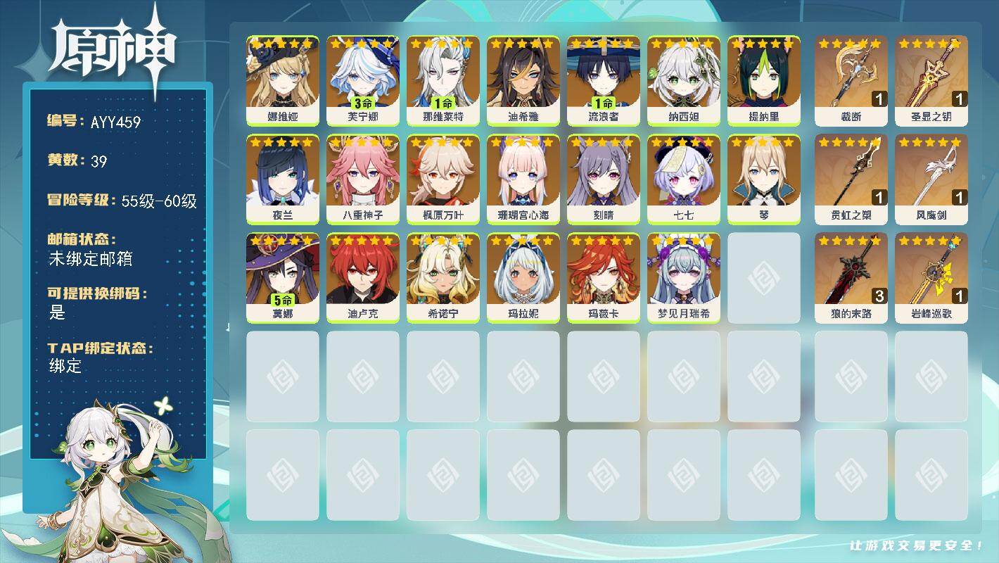 [16459250]59级/39黄/女主/20个五星角色/7个五星武器 0命娜维娅,3命芙宁娜,1命那维莱特,0命迪希雅,1命流浪者,0命纳西妲,0命提纳里,0命夜兰,0命八重神子,0命枫原万叶,0命珊瑚宫心海,0命刻晴,0命七七,0命琴,5命莫娜,0命迪卢克,0命希诺宁,0命玛拉妮,0命玛薇卡,0命梦见月瑞希,精1裁断,精1圣显之钥,精1贯虹之槊,精1风鹰剑,精3狼的末路,精1岩峰巡歌