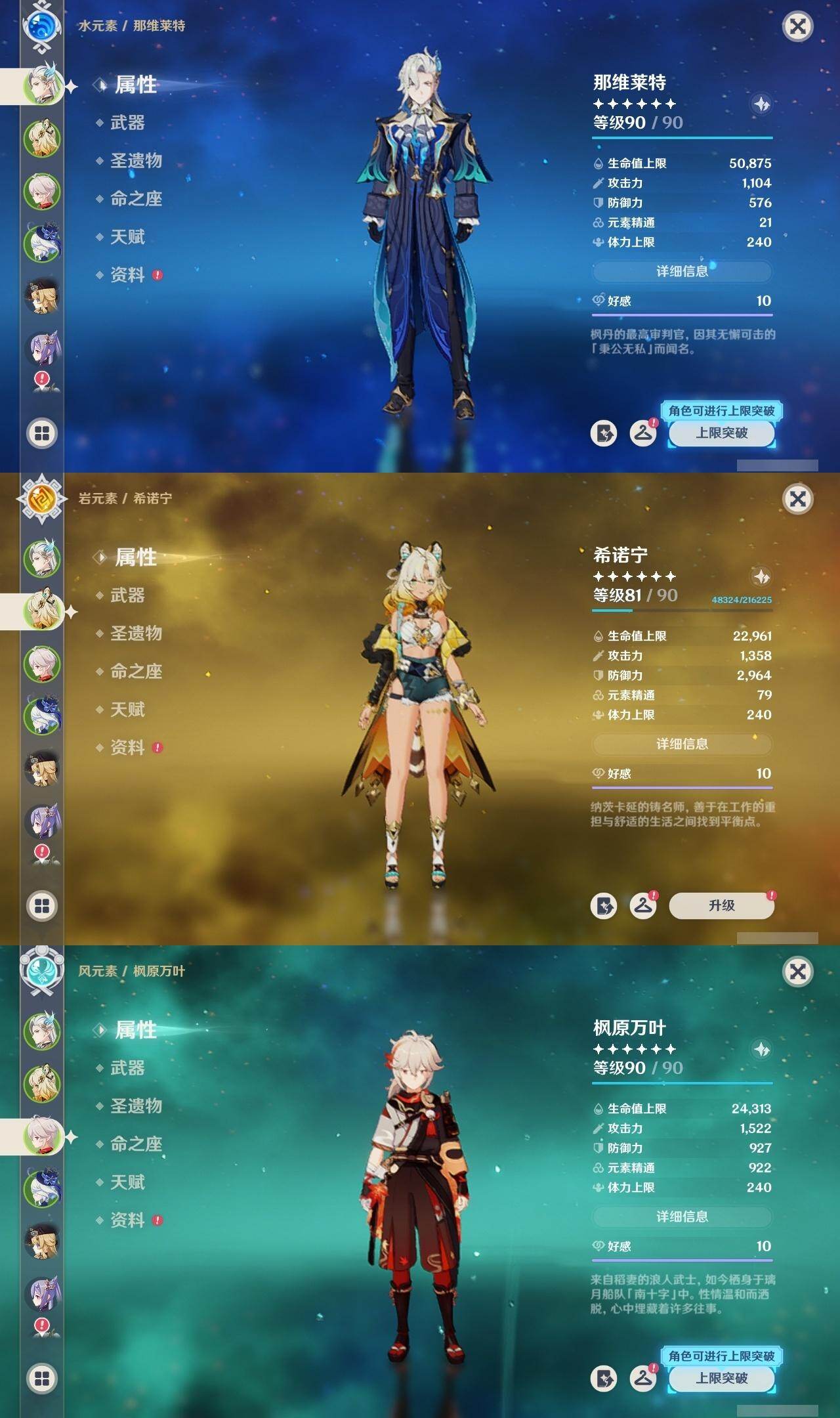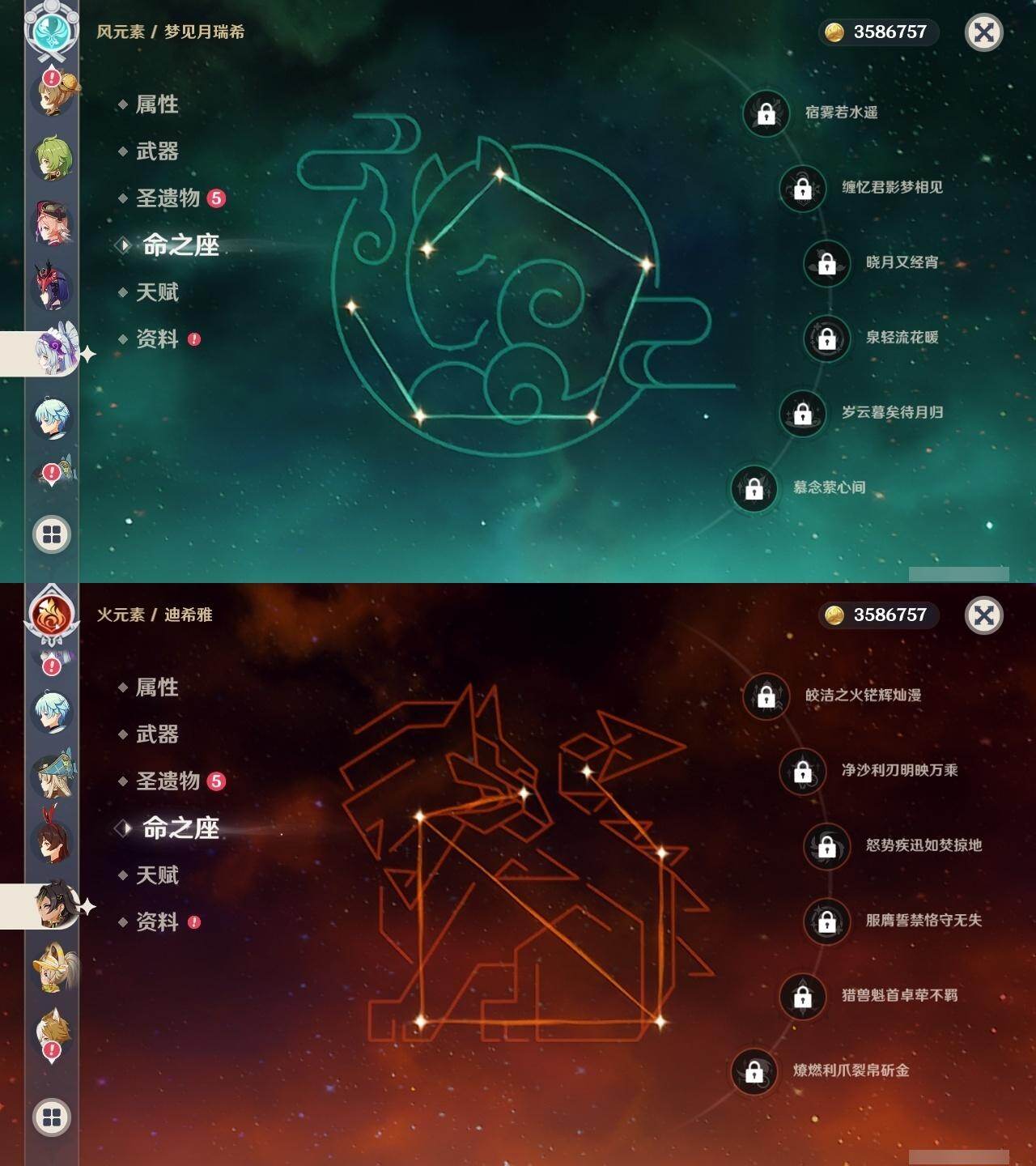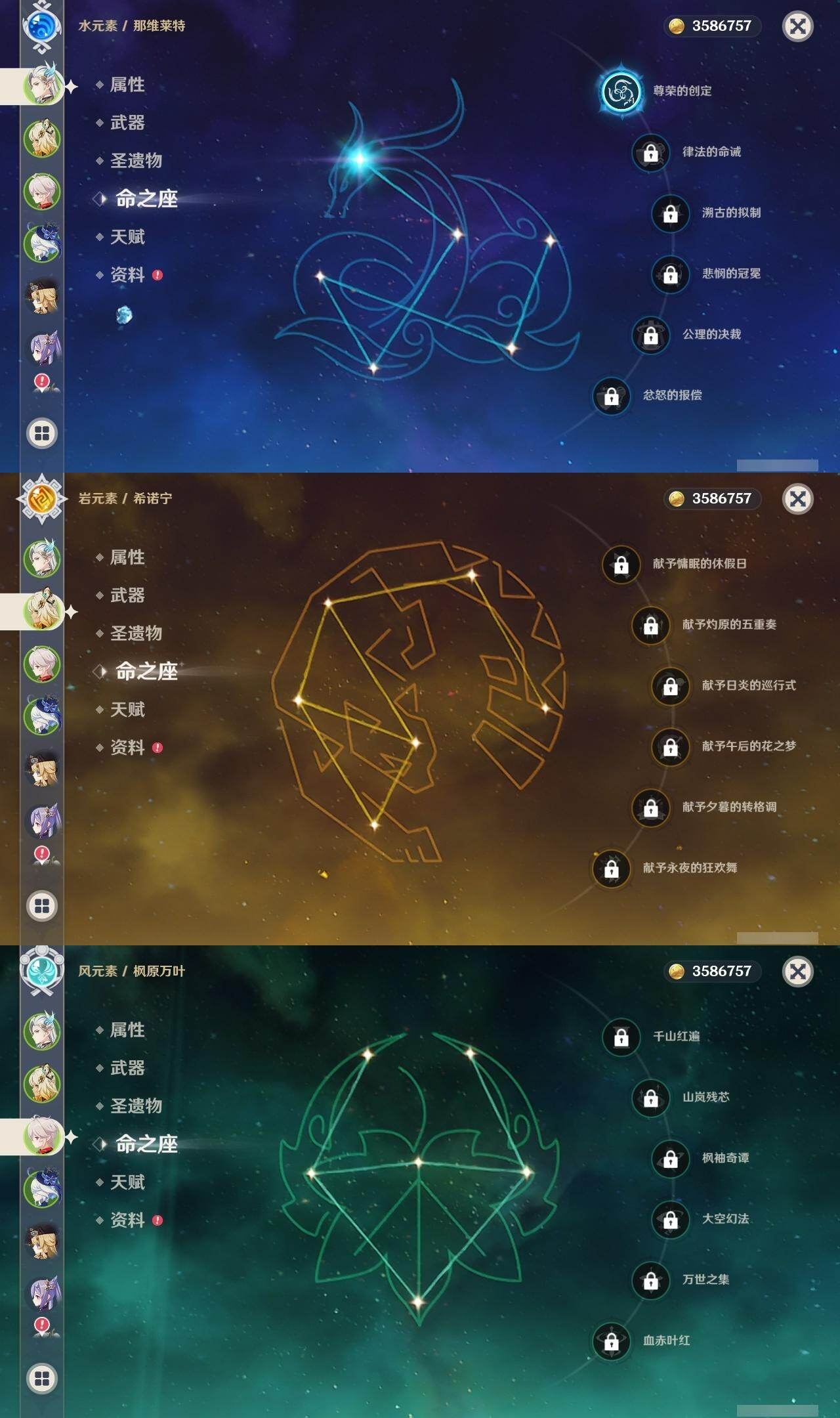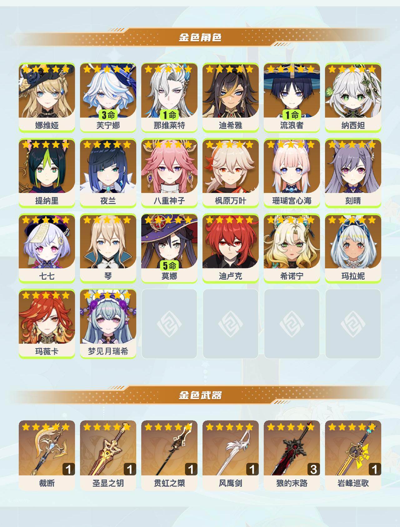 0命娜维娅,3命芙宁娜,1命那维莱特,0命迪希雅,1命流浪者,0命纳西妲,0命提纳里,0命夜兰,0命八重神子,0命枫原万叶,0命珊瑚宫心海,0命刻晴,0命七七,0命琴,5命莫娜,0命迪卢克,0命希诺宁,0命玛拉妮,0命玛薇卡,0命梦见月瑞希,精1裁断,精1圣显之钥,精1贯虹之槊,精1风鹰剑,精3狼的末路,精1岩峰巡歌