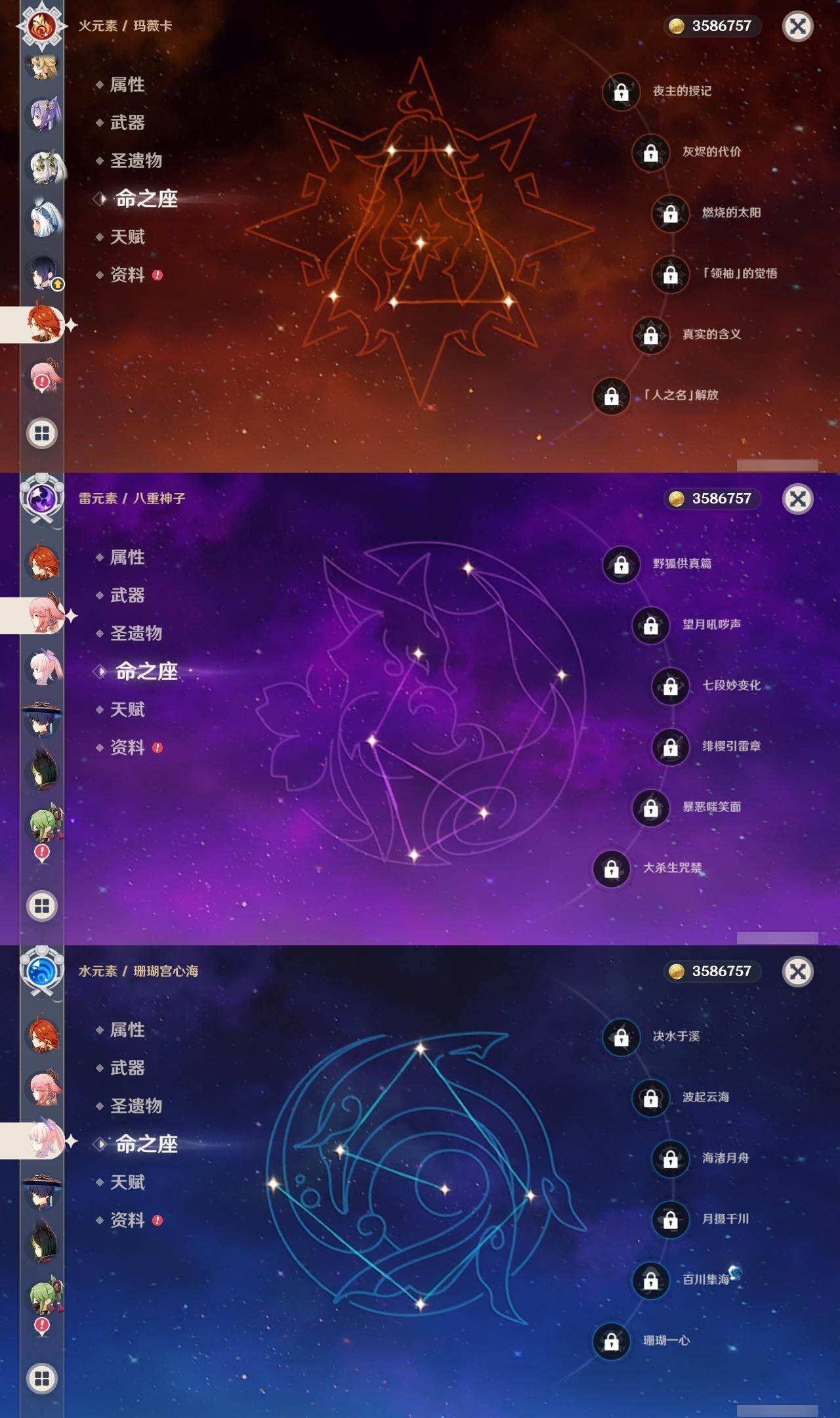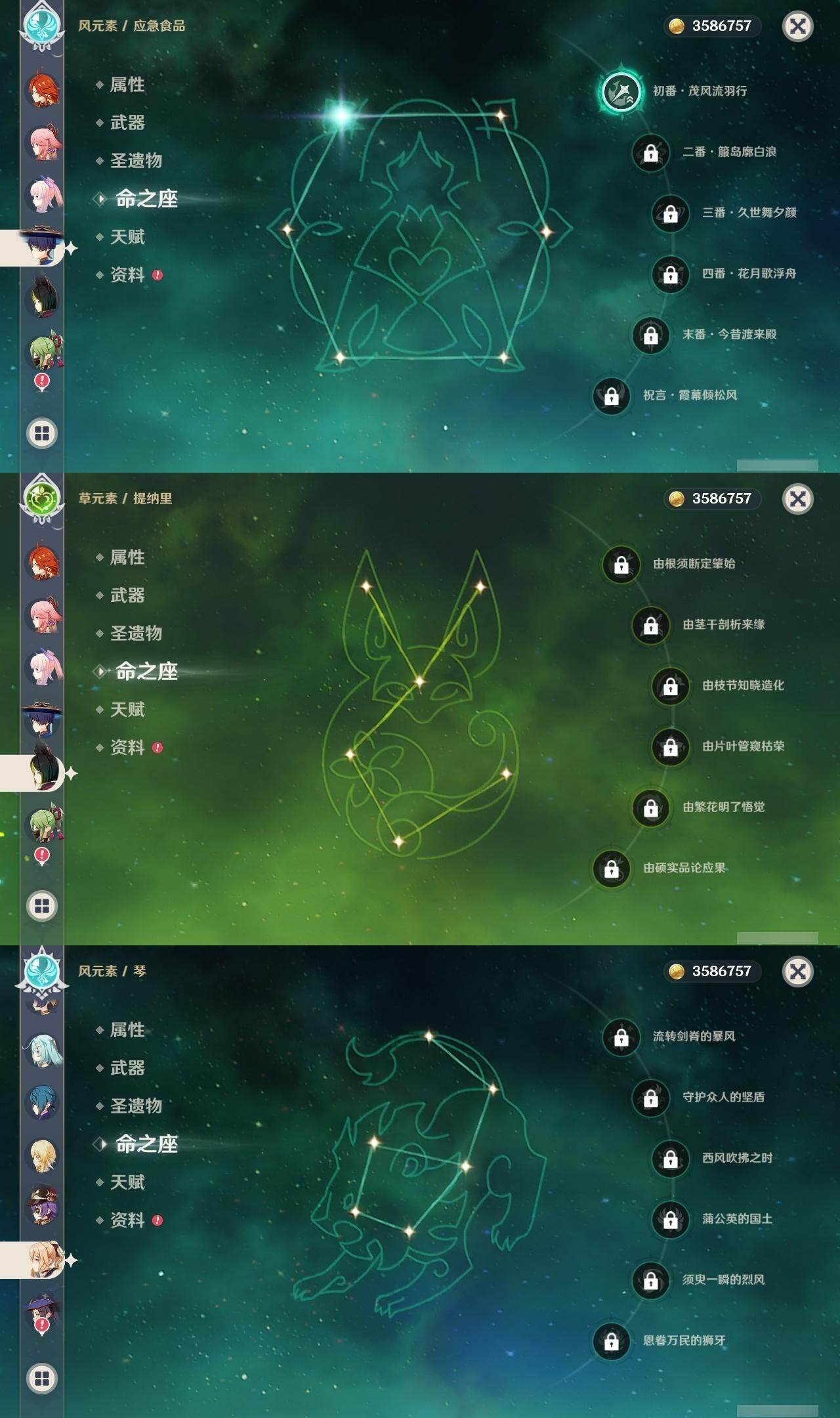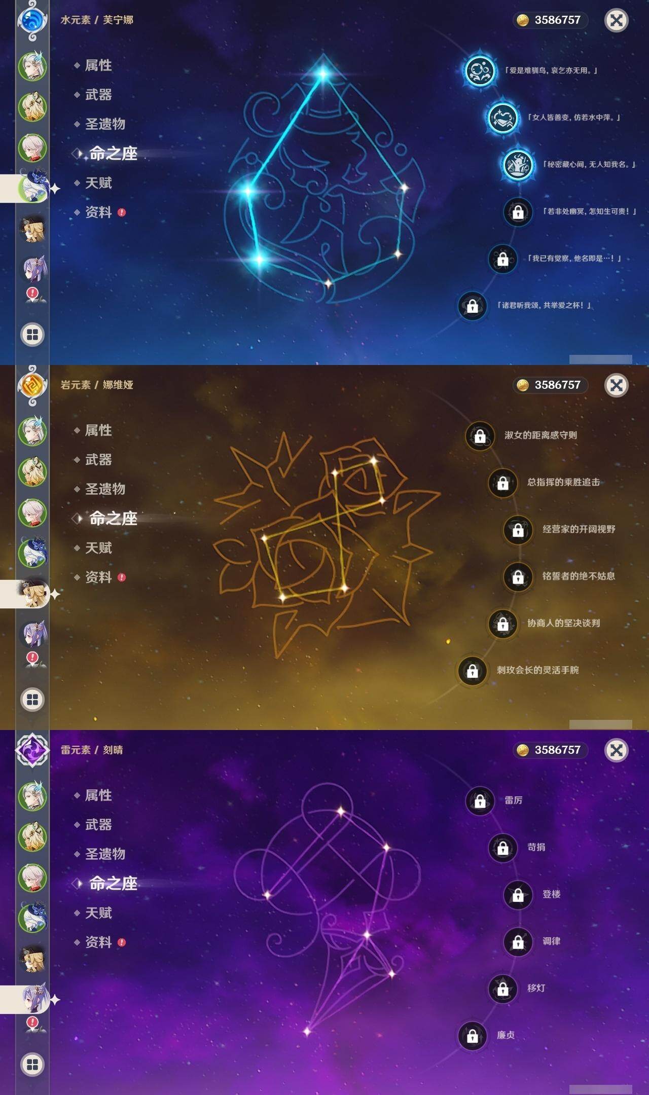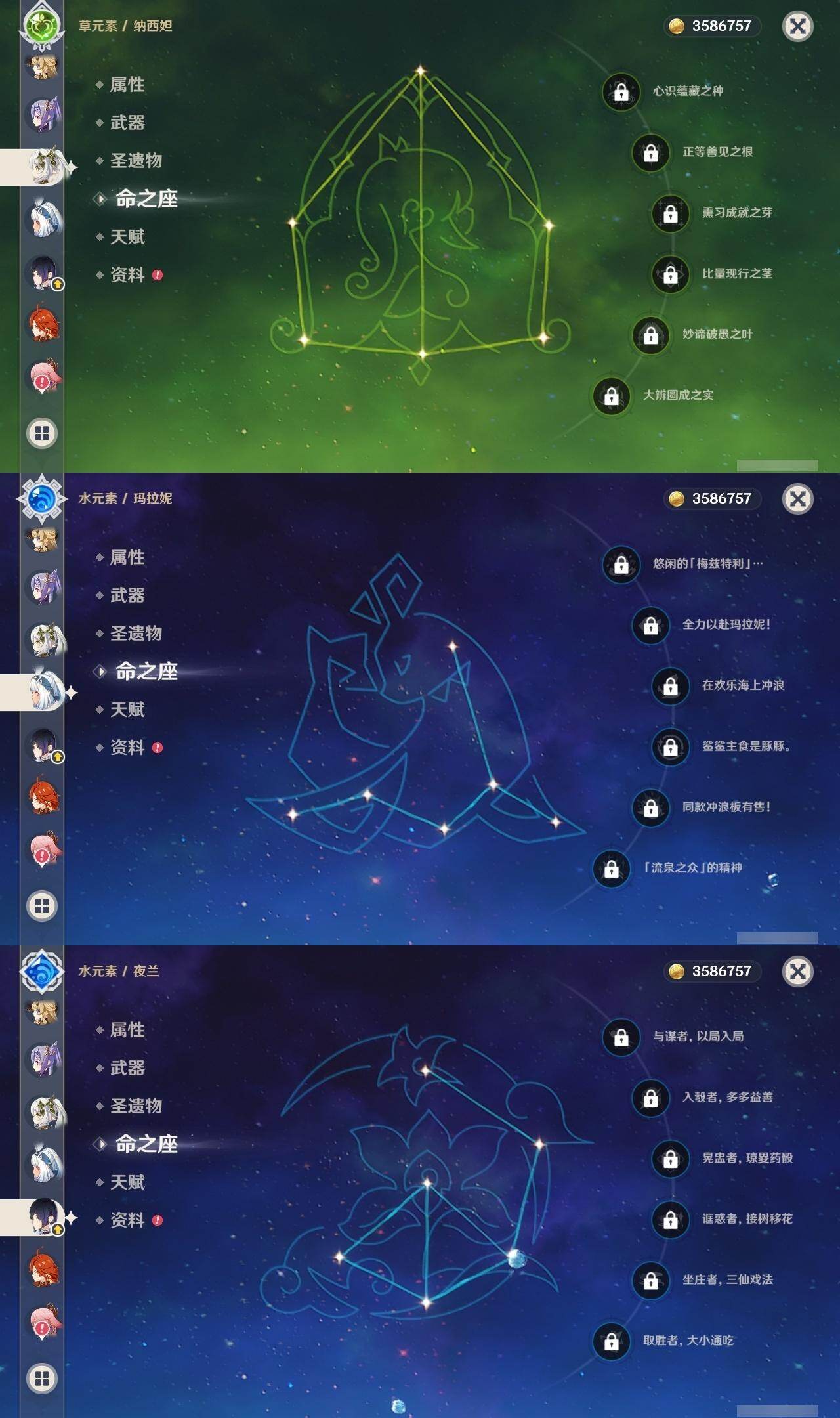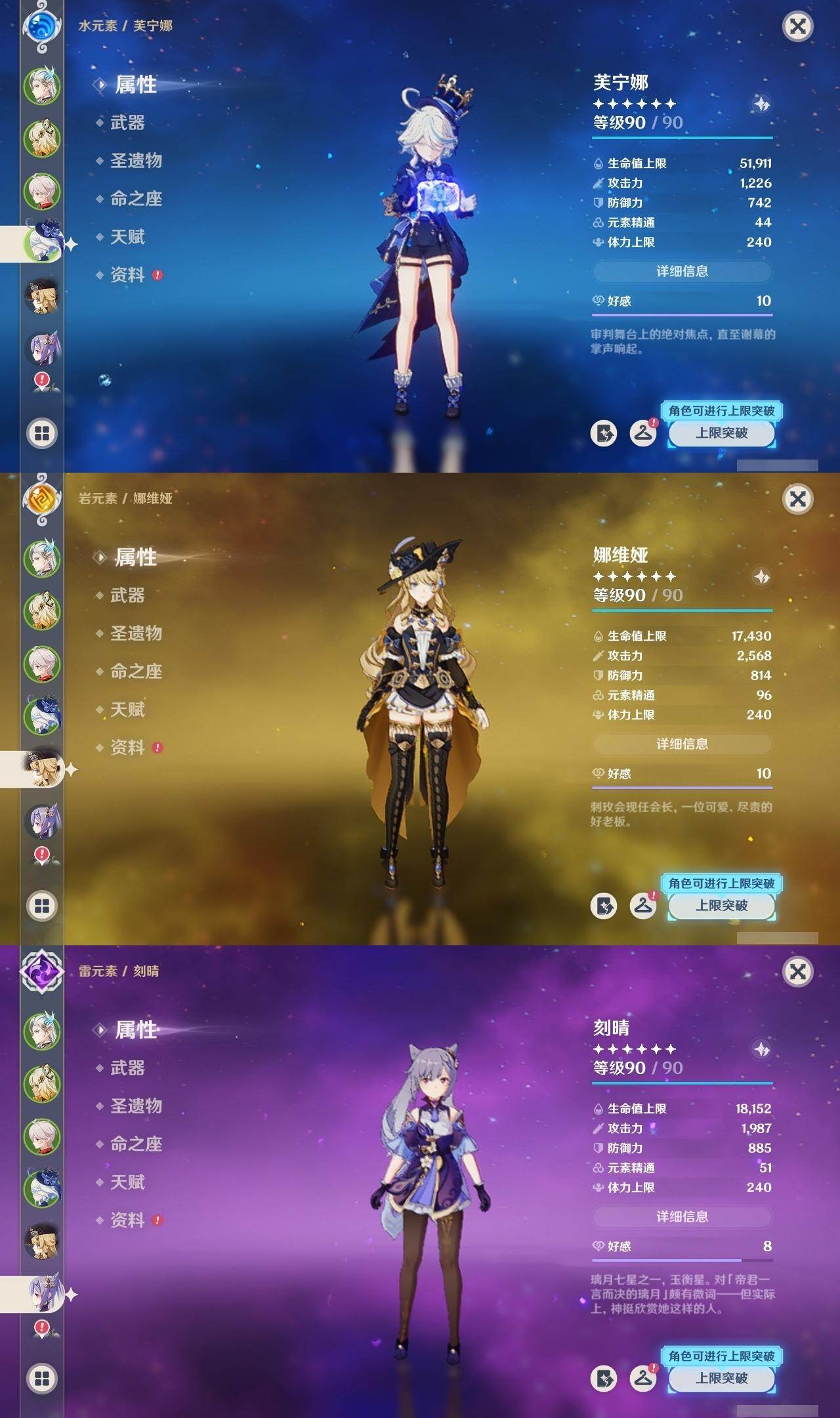 0命娜维娅,3命芙宁娜,1命那维莱特,0命迪希雅,1命流浪者,0命纳西妲,0命提纳里,0命夜兰,0命八重神子,0命枫原万叶,0命珊瑚宫心海,0命刻晴,0命七七,0命琴,5命莫娜,0命迪卢克,0命希诺宁,0命玛拉妮,0命玛薇卡,0命梦见月瑞希,精1裁断,精1圣显之钥,精1贯虹之槊,精1风鹰剑,精3狼的末路,精1岩峰巡歌