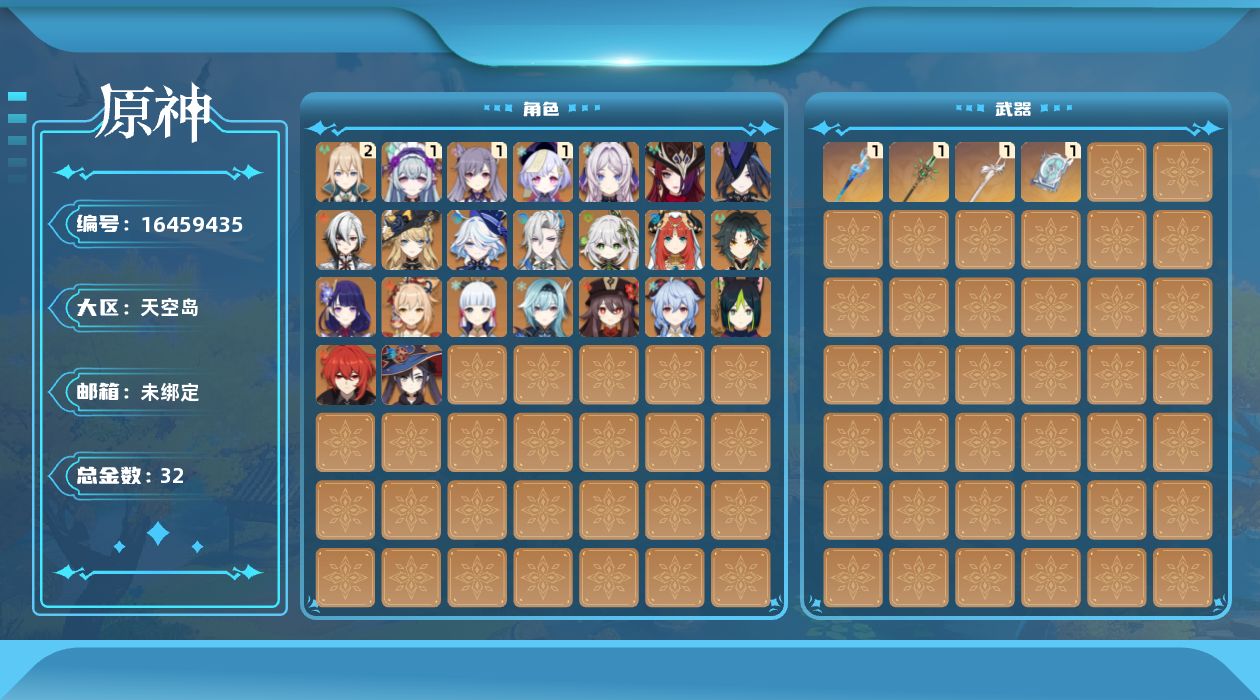 0命克洛琳德,0命阿蕾奇诺,0命娜维娅,0命芙宁娜,0命那维莱特,0命纳西妲,0命妮露,0命提纳里,0命优菈,0命雷电将军,0命神里绫华,0命胡桃,0命甘雨,0命魈,0命宵宫,1命刻晴,1命七七,2命琴,0命莫娜,0命迪卢克,0命恰斯卡,0命茜特菈莉,1命梦见月瑞希,精1静水流涌之辉,精1四风原典,精1和璞鸢,精1风鹰剑