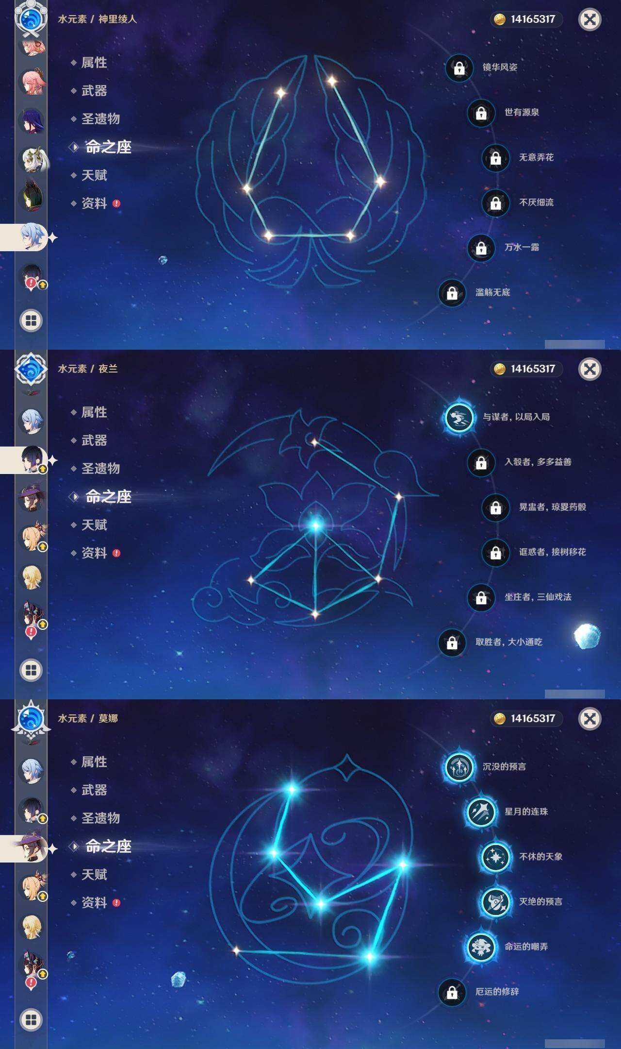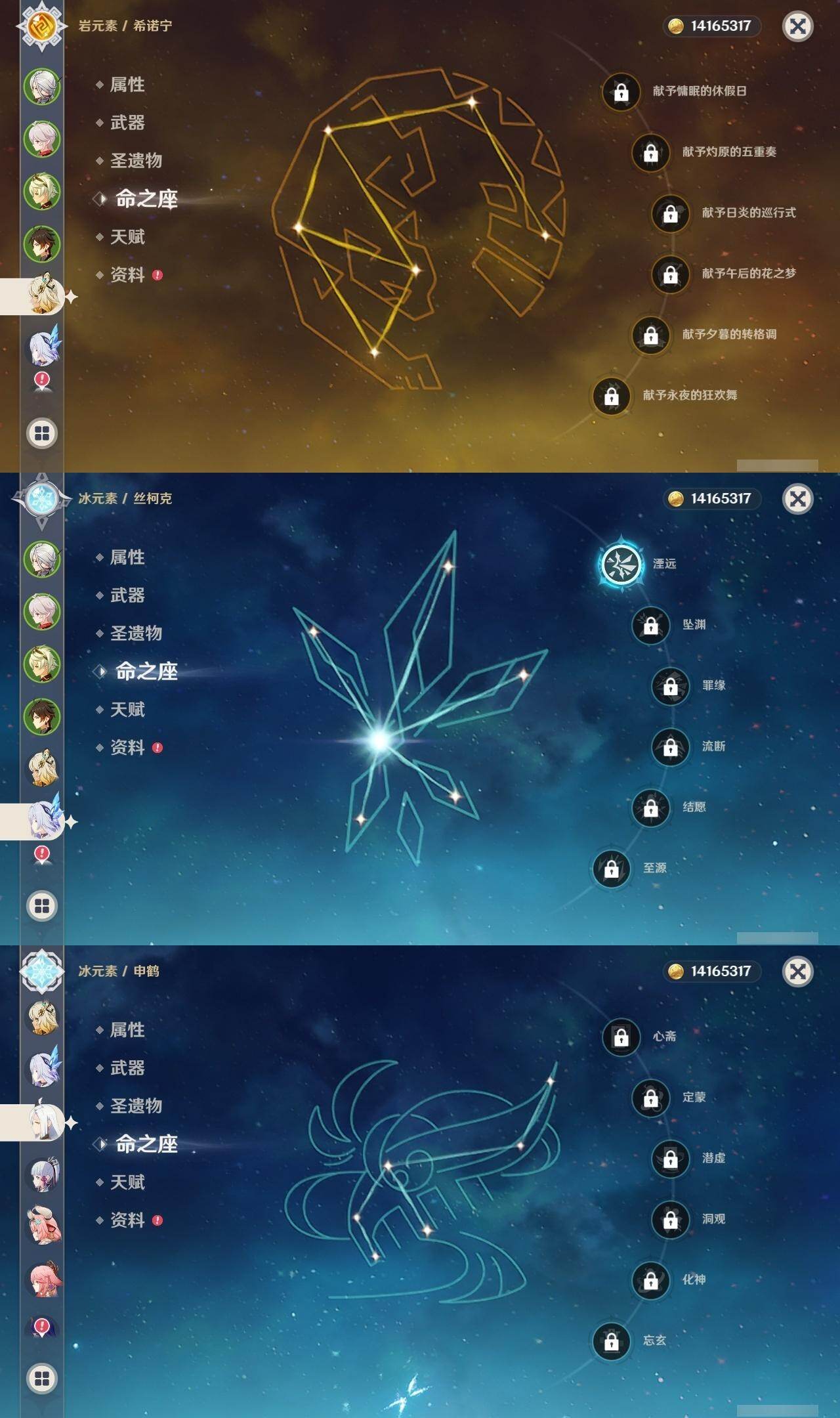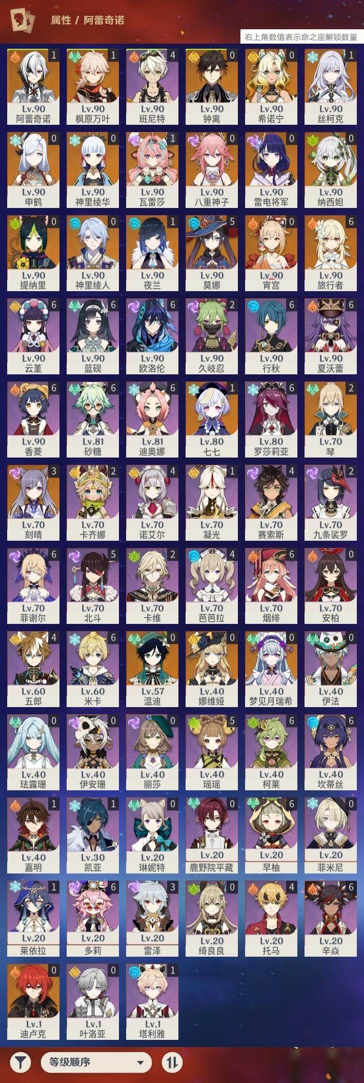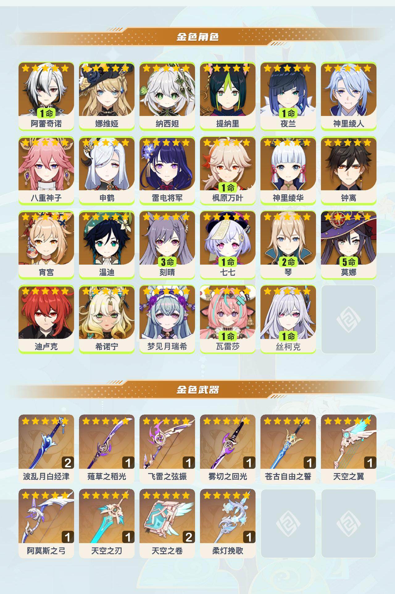 1命阿蕾奇诺,0命娜维娅,0命纳西妲,0命提纳里,1命夜兰,0命神里绫人,0命八重神子,0命申鹤,0命雷电将军,1命枫原万叶,0命神里绫华,0命钟离,0命宵宫,0命温迪,3命刻晴,1命七七,2命琴,5命莫娜,0命迪卢克,0命希诺宁,0命梦见月瑞希,1命瓦雷莎,1命丝柯克,精2波乱月白经津,精1薙草之稻光,精1飞雷之弦振,精1雾切之回光,精1苍古自由之誓,精1天空之翼,精1阿莫斯之弓,精1天空之刃,精2天空之卷,精1柔灯挽歌