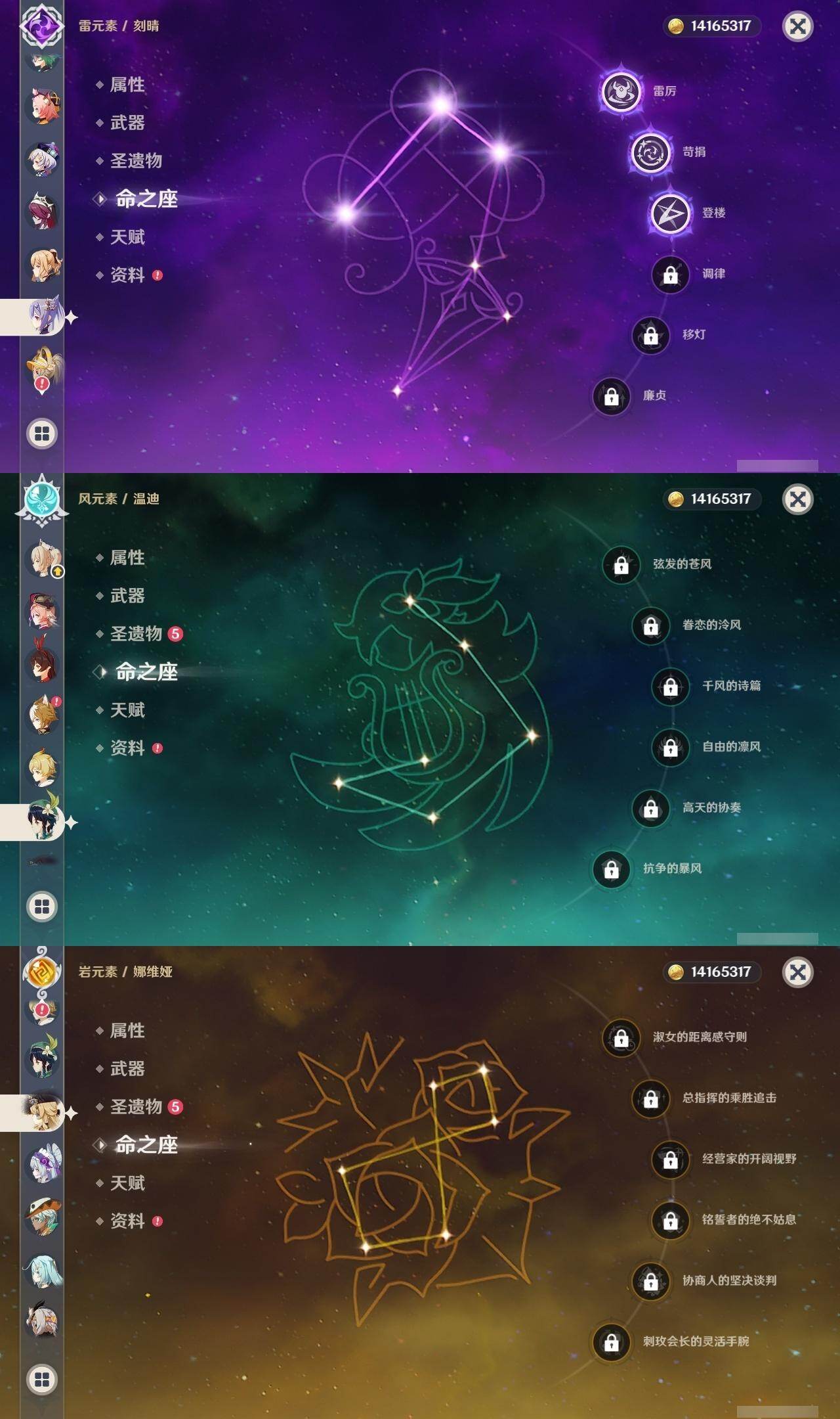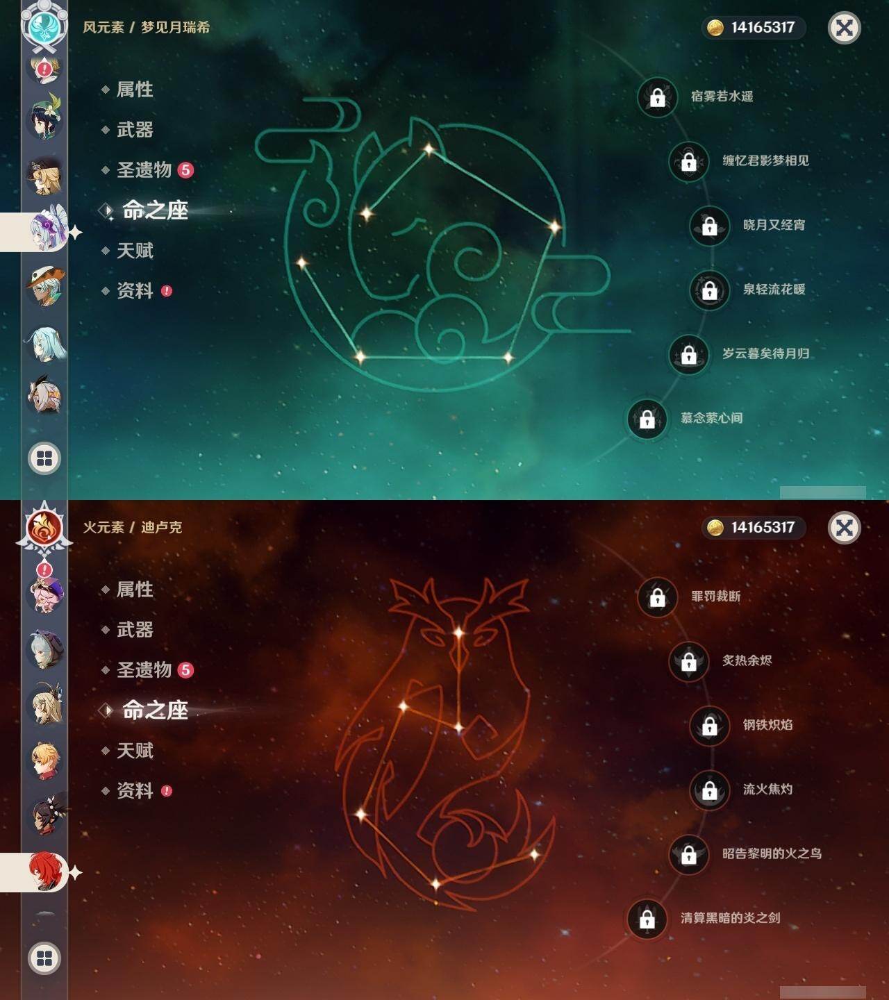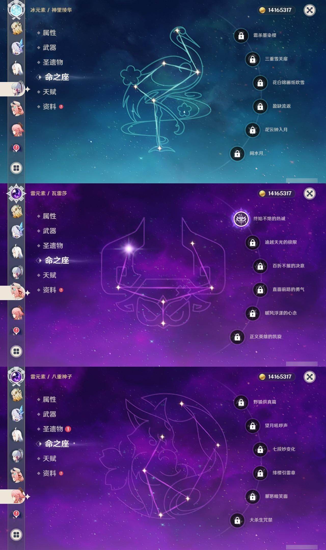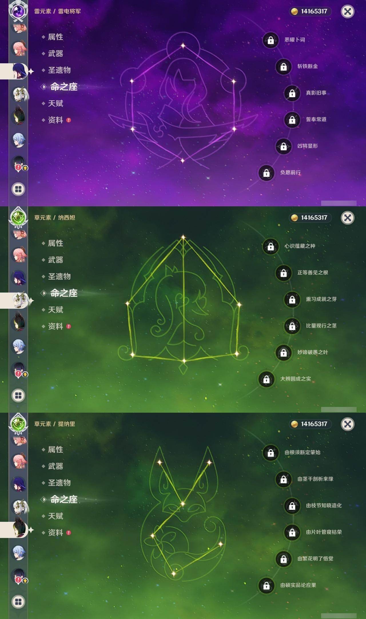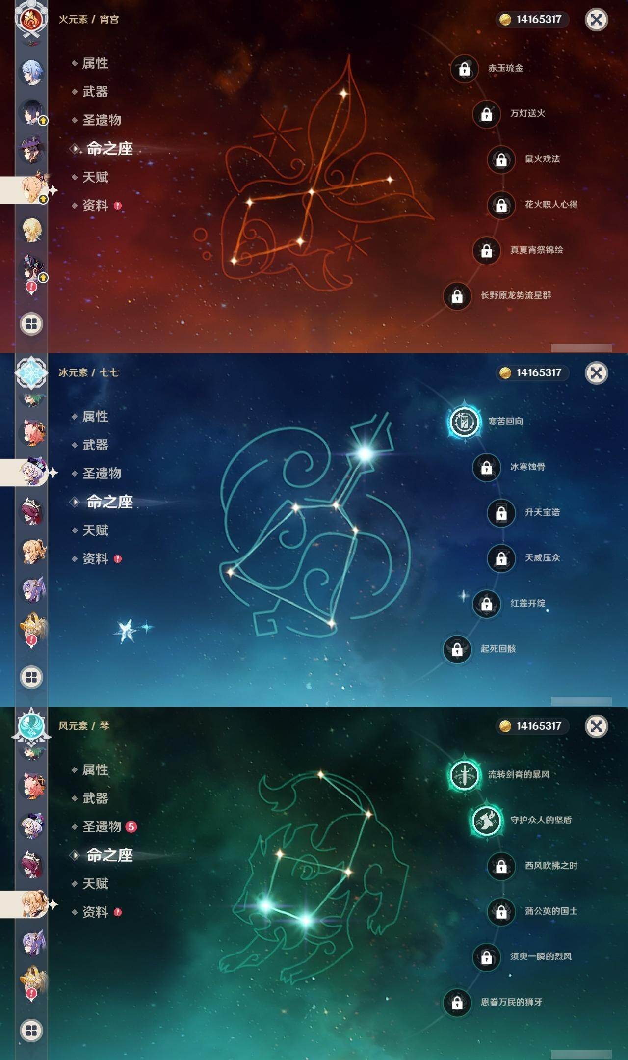 1命阿蕾奇诺,0命娜维娅,0命纳西妲,0命提纳里,1命夜兰,0命神里绫人,0命八重神子,0命申鹤,0命雷电将军,1命枫原万叶,0命神里绫华,0命钟离,0命宵宫,0命温迪,3命刻晴,1命七七,2命琴,5命莫娜,0命迪卢克,0命希诺宁,0命梦见月瑞希,1命瓦雷莎,1命丝柯克,精2波乱月白经津,精1薙草之稻光,精1飞雷之弦振,精1雾切之回光,精1苍古自由之誓,精1天空之翼,精1阿莫斯之弓,精1天空之刃,精2天空之卷,精1柔灯挽歌