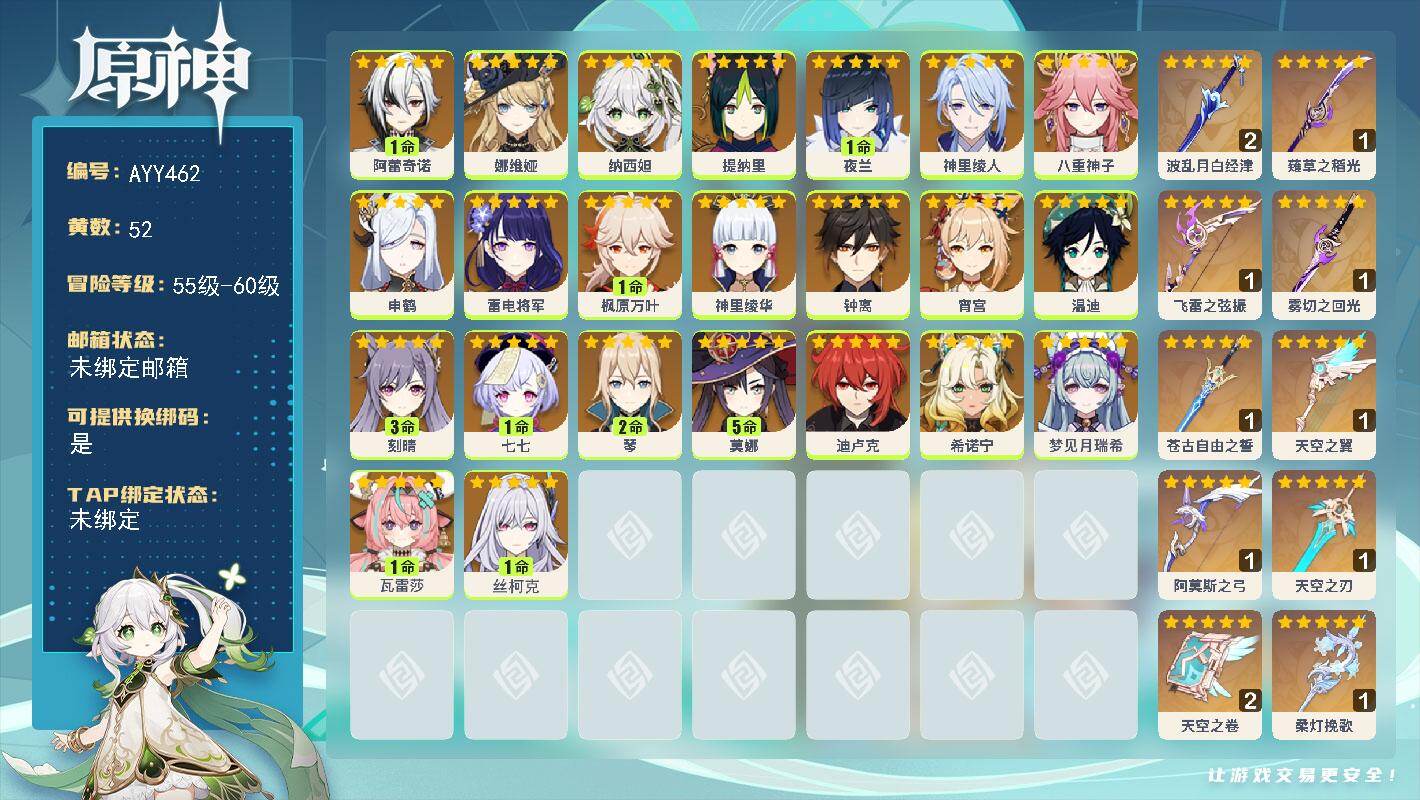 [16459849]60级/52黄/女主/23个五星角色/11个五星武器 1命阿蕾奇诺,0命娜维娅,0命纳西妲,0命提纳里,1命夜兰,0命神里绫人,0命八重神子,0命申鹤,0命雷电将军,1命枫原万叶,0命神里绫华,0命钟离,0命宵宫,0命温迪,3命刻晴,1命七七,2命琴,5命莫娜,0命迪卢克,0命希诺宁,0命梦见月瑞希,1命瓦雷莎,1命丝柯克,精2波乱月白经津,精1薙草之稻光,精1飞雷之弦振,精1雾切之回光,精1苍古自由之誓,精1天空之翼,精1阿莫斯之弓,精1天空之刃,精2天空之卷,精1柔灯挽歌