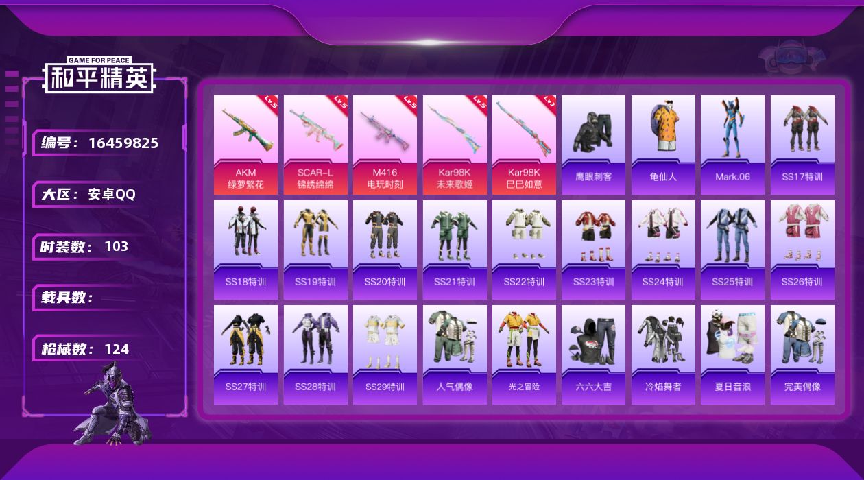 [16459825]【特价出售/店主推荐】安卓 手Q-0粉装-5特效枪-0载具-1粉色飞行器-33472热力值-1王牌印记-103套装-124枪皮 【热门品类】:套装-龟仙人,角色-Mark.06 【粉色枪皮等级】:AKM-绿萝繁花(五级),SCAR-L-锦绣绵绵(五级),M416-电玩时刻(五级),Kar98K-未来歌姬(五级),Kar98K-巳巳如意(一级) 【粉色枪皮】:AKM-绿萝繁花,SCAR-L-锦绣绵绵,M416-电玩时刻,Kar98K-未来歌姬,Kar98K-巳巳如意 【粉色降落伞】:星之彼岸降落伞,暗夜鎏金降落伞,初号机 觉醒Ver.降落伞,忍者神龟降落伞,炫彩糖果降落伞 【稀有套装】:套装-龟仙人 【稀有枪皮】:AKM-夜灯,AKM-彩虹符号,AKM-灼热熔岩,AKM-破晓战魂,AKM-萌趣颜团子,AKM-虎虎生威,AKM-霓虹街区,AKM-龙的传人,M16A4-夜灯,M16A4-幻世战舞者,SCAR-L-炫彩节奏,SCAR-L-玉兔迎春,SCAR-L-红色方程式,SCAR-L-黄金龙骨,M416-夜灯,M416-糯团青竹,M416-红色方程式,M416-绯红前夜,M416-蓝色火焰,GROZA-彩虹符号,AUG-天降萌叽,AUG-耀粉歌者,QBZ-彩虹符号,QBZ-赛罗,M762-天降萌叽,M762-绯红前夜,AC-VAL-快闪甜心,AC-VAL-闲梦青缨,蜜獾-天降萌叽,蜜獾-娇憨猪猪,UZI-啾咪啾咪,UZI-天降萌叽,UZI-娇憨猪猪,UZI-炫彩节奏,UZI-红色方程式,UMP45-夜灯,UMP45-时空追击者,UMP45-生命誓言,Vector-焰鹰斗篷,Vector-夜灯,Vector-彩虹符号,汤姆逊-天降萌叽,汤姆逊-炫彩节奏,汤姆逊-耀粉歌者,MP5K-飒粉甜心,P90-倾城蜜语,P90-快闪甜心,Kar98K-彩虹符号,M24-炫彩节奏,AWM-焰鹰斗篷,SKS-炫彩节奏,SKS-糯团青竹,VSS-彩虹符号,Mini14-涂山之恋,Mini14-耀粉歌者,SLR-娇憨猪猪,SLR-彩虹符号,M417-惊鸿侠骨,MK20-H-快闪甜心,M200-惊鸿侠骨,S686-生命誓言,S686-红色方程式,S1897-炫彩节奏,S12K-破晓战魂,S12K-娇憨猪猪,S12K-幻世战舞者,DBS-焰鹰斗篷,M249-彩虹符号,M249-破晓战魂,DP-2