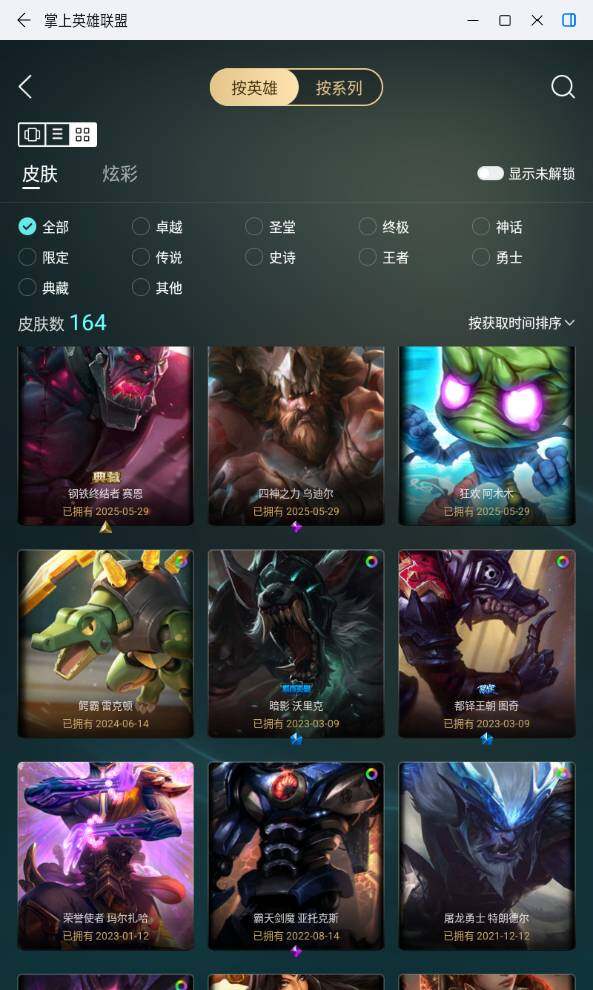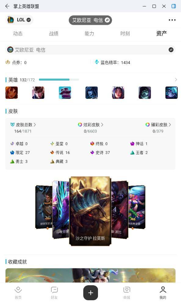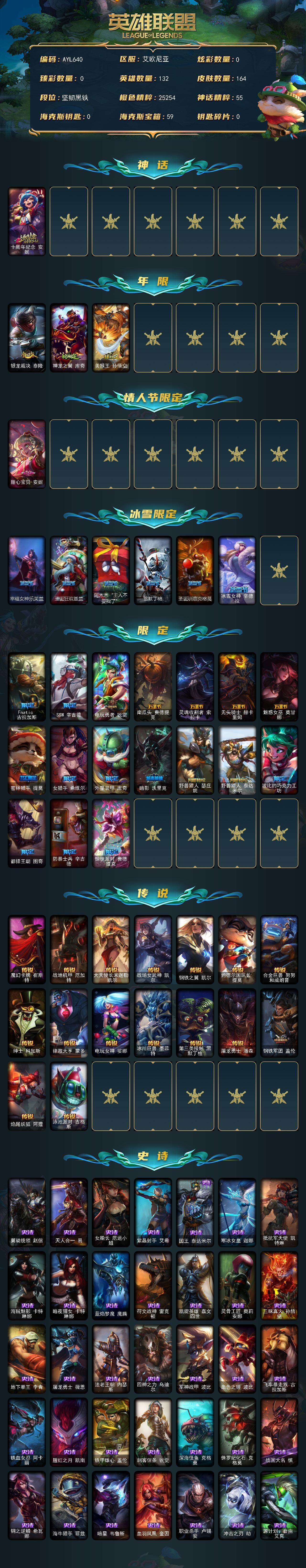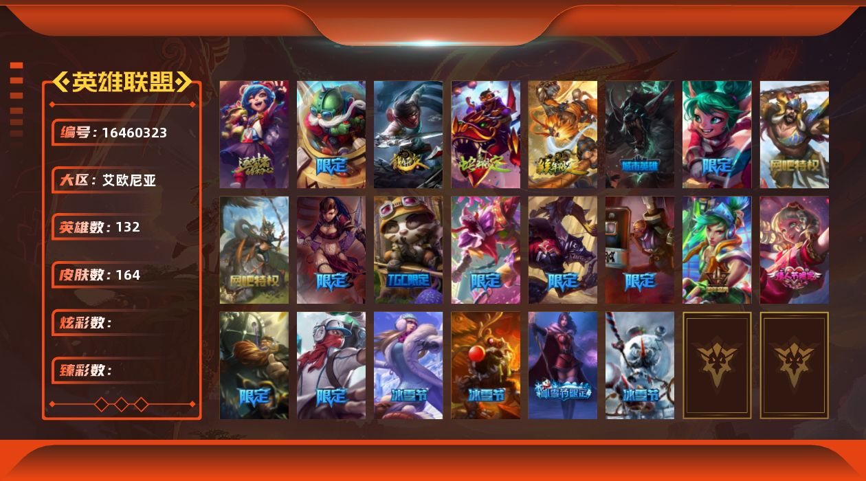 [16460323]未定级段位-132英雄-164皮肤-0炫彩-0终极-1神话-27限定-16传说-37史诗