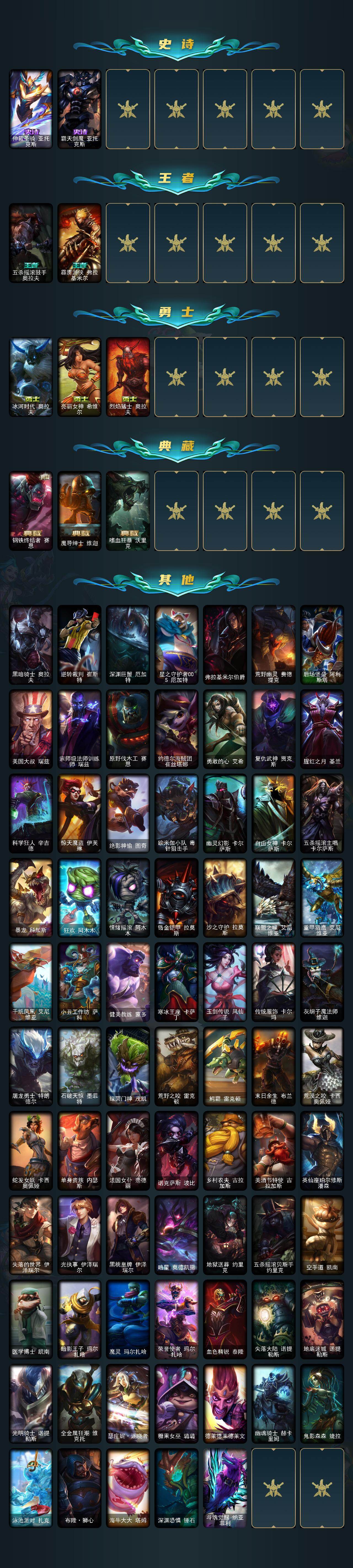 【其他皮肤1】:黑暗骑士奥拉夫,逆转裁判崔斯特,深渊巨蟹厄加特,星之守护者COS厄加特,弗拉基米尔伯爵,荒野幽灵费德提克,后场堡垒阿利斯塔,美国大叔瑞兹,宗师级法师训练师瑞兹,原野伐木工赛恩,约德尔海贼团崔丝塔娜,勇敢的心艾希,复仇武神贾克斯,腥红之月基兰,科学狂人辛吉德,惊天魔盗伊芙琳,绝影神偷图奇,欧米伽小队毒针狙击手,幽灵幻影卡尔萨斯,自由女神卡尔萨斯,五杀摇