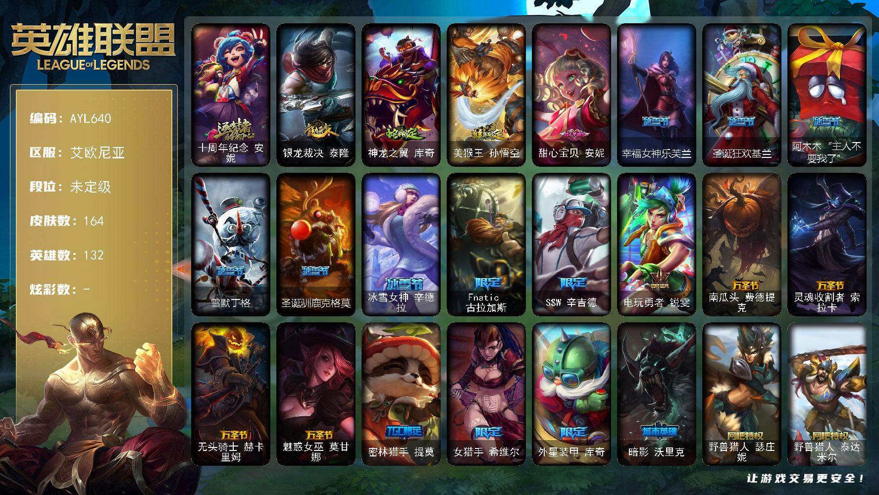[16460323]未定级段位-132英雄-164皮肤-0炫彩-0终极-1神话-27限定-16传说-37史诗 【神话皮肤】:十周年纪念安妮 【年限皮肤】:银龙裁决泰隆,神龙之翼库奇,美猴王孙悟空 【情人节限定】:甜心宝贝安妮 【冰雪限定】:幸福女神乐芙兰,圣诞狂欢基兰,阿木木“主人不要我了”,雪默丁格,圣诞驯鹿克格莫,冰雪女神辛德拉 【限定皮肤】:Fnatic古拉加斯,SSW辛吉德,电玩勇者锐雯,南瓜头费德提克,灵魂收割者索拉卡,无头骑士赫卡里姆,魅惑女巫莫甘娜,密林猎手提莫,女猎手希维尔,外星装甲库奇,暗影沃里克,野兽猎人瑟庄妮,野兽猎人泰达米尔,波比的巧克力工坊,都铎王朝图奇,防暴士兵辛吉德,惊悚派对费德提克 【传说皮肤】:魔幻卡牌崔斯特,战地机甲厄加特,大天使长米迦勒凯尔,战场女武神凯尔,钢铁之翼凯尔,约德尔国队长提莫,合金巨兽努努和威朗普,绅士科加斯,律政大亨蒙多,电玩女神娑娜,冰川巨兽墨菲特,第三类接触黑默丁格,屠龙勇士潘森,钢铁军团盖伦,焰尾妖狐阿狸,泳池派对吉格斯 【史诗皮肤】:翼骑统领赵信,天人合一易,女船长厄运小姐,紫晶射手艾希,国王泰达米尔,寒冰女皇迦娜,抵抗军天使凯特琳,海贼魅影卡特琳娜,暗夜猫女卡特琳娜,蓝焰梦魔魔腾,符文战神雷克顿,凯旋英雄嘉文四世,灵骨工匠奥莉安娜,三昧真火孙悟空,地下拳王李青,屠龙勇士薇恩,法老王朝内瑟斯,四神之力乌迪尔,军神战甲波比,血色之锤波比,飞车暴走族古拉加斯,铁血女忍阿卡丽,腥红之月凯南,铁甲雄心盖伦,刺客信条锐雯,深海怪鱼克格莫,侏罗纪化石克格莫,战国大名慎,钢之逆鳞希瓦娜,海牛猎手菲兹,暗星韦鲁斯,血羽凤凰奎因,职业杀手卢锡安,冲击之刃劫,源计划自由艾克,仲裁圣骑亚托克斯,霸天剑魔亚托克斯 【王者皮肤】:五杀摇滚鼓手奥拉夫,霹雳游侠弗拉基米尔 【勇士皮肤】:冰河时代奥拉夫,亮丽女神希维尔,烈焰猛士奥拉夫 【典藏皮肤】:钢铁终结者赛恩,魔导绅士维迦,嗜血狂暴沃里克 【其他皮肤1】:黑暗骑士奥拉夫,逆转裁判崔斯特,深渊巨蟹厄加特,星之守护者COS厄加特,弗拉基米尔伯爵,荒野幽灵费德提克,后场堡垒阿利斯塔,美国大叔瑞兹,宗师级法师训练师瑞兹,原野伐木工赛恩,约德尔海贼团崔丝塔娜,勇敢的心艾希,复仇武神贾克斯,腥红之月基兰,科学狂人辛吉德,惊天魔盗伊芙琳,绝影神偷图奇,欧米伽小队毒针狙击手,幽灵幻影卡尔萨斯,自由女神卡尔萨斯,五杀摇