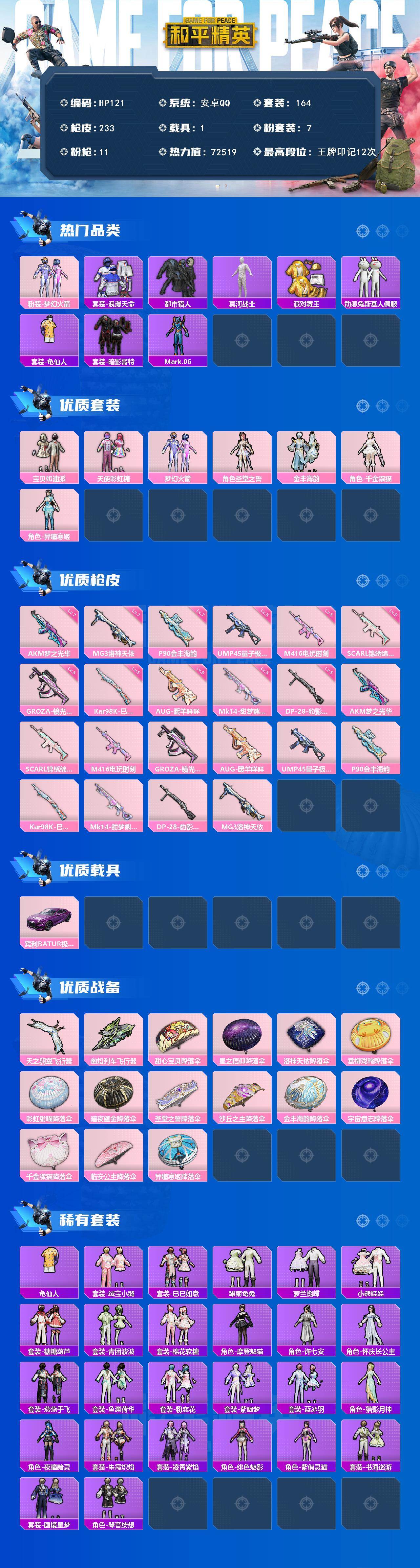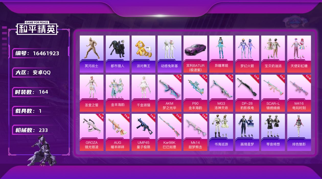 [16461923]安卓 手Q-7粉装-11特效枪-1载具-3粉色飞行器-72519热力值-12王牌印记-164套装-233枪皮 【热门品类】:粉装-梦幻火箭,套装-浪漫天命,套装-都市猎人,套装-冥河战士,套装-派对舞王,套装-动感兔斯基人偶服,套装-龟仙人,套装-暗影哥特,角色-Mark.06 【粉色套装】:粉装-宝贝奶油派,粉装-天使彩虹糖,粉装-梦幻火箭,角色-圣堂之誓,粉装-金丰海韵,角色-千金淑猫,角色-异瞳寒姬 【粉色枪皮等级】:AKM-梦之光华(七级),SCAR-L-锦绣绵绵(五级),M416-电玩时刻(五级),GROZA-镜光银凌(五级),AUG-暖羊咩咩(五级),UMP45-量子极限(五级),P90-金丰海韵(七级),Kar98K-巳巳如意(五级),Mk14-甜梦熊击(五级),DP-28-豹影疾电(五级),MG3-洛神天依(七级) 【粉色载具】:宾利BATUR(极速紫) 【粉色枪皮】:AKM-梦之光华,SCAR-L-锦绣绵绵,M416-电玩时刻,GROZA-镜光银凌,AUG-暖羊咩咩,UMP45-量子极限,P90-金丰海韵,Kar98K-巳巳如意,Mk14-甜梦熊击,DP-28-豹影疾电,MG3-洛神天依 【粉色飞行器】:天之羽翼飞行器,幽焰列车飞行器 【粉色降落伞】:甜心宝贝降落伞,星之信仰降落伞,洛神天依降落伞,垂柳戏鸭降落伞,彩虹甜喵降落伞,暗夜鎏金降落伞,圣堂之誓降落伞,沙丘之主降落伞,金丰海韵降落伞,宇宙意志降落伞,千金淑猫降落伞,临安公主降落伞,异瞳寒姬降落伞,炫彩糖果降落伞 【稀有套装】:套装-龟仙人,套装-绒宝小鹅,套装-巳巳如意,套装-雪国风尚,套装-炫彩糖果,套装-雏菊兔兔,套装-萝兰蝴蝶,套装-小熊娃娃,套装-糖糖葫芦,套装-青团波波,套装-棉花软糖,角色-摩登魅猫,角色-许七安,角色-怀庆长公主,套装-燕燕于飞,套装-鱼渊荷华,套装-粉恋花,套装-紫幽梦,套装-蓝冰羽,角色-猎影月神,角色-夜瞳黯灵,套装-朱霞炽焰,套装-凌霄紫焰,角色-绯色魅影,角色-紫俏灵猫,套装-书海巡游,套装-画境星梦,套装-琴音绮想 【稀有枪皮】:AUG-冰晶雪宝,AKM-影袭,AKM-破晓战魂,AKM-虎虎生威,AKM-龙的传人,M16A4-冥河战士,M16A4-幻世战舞者,M16A4-千金淑猫,SCAR-L-炫彩节奏,SCAR-L-玉兔迎春,M416-糯团青竹