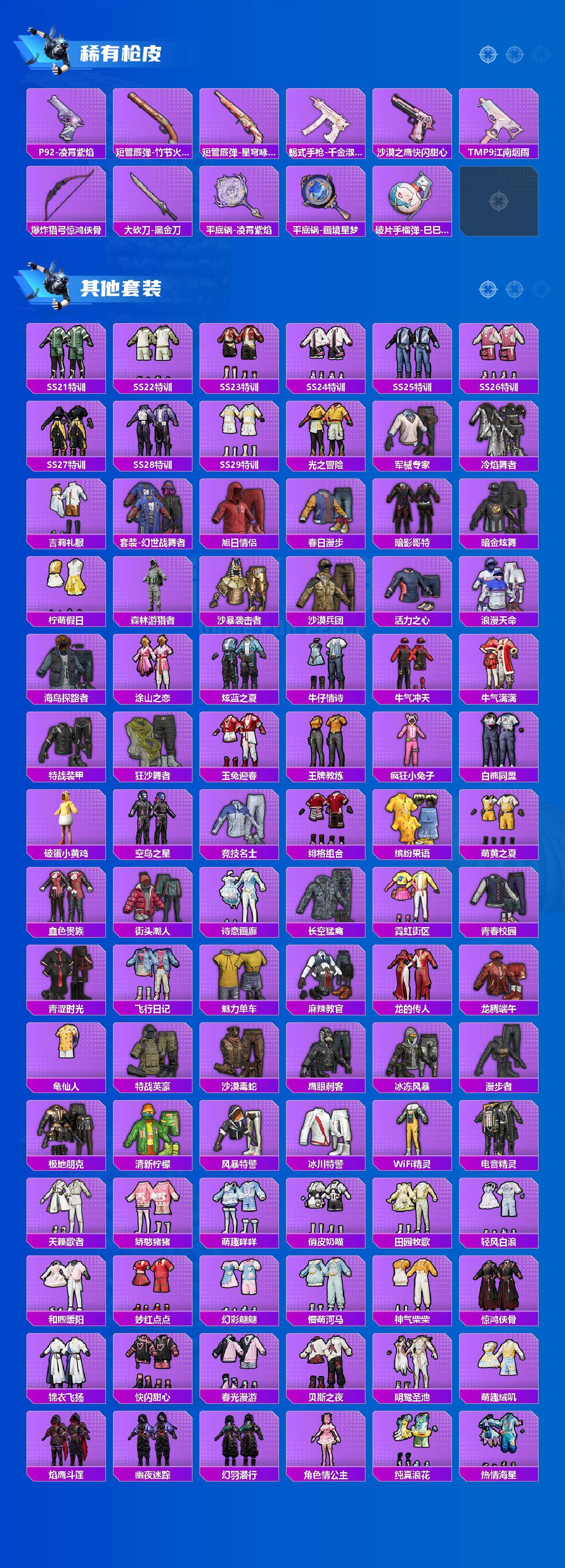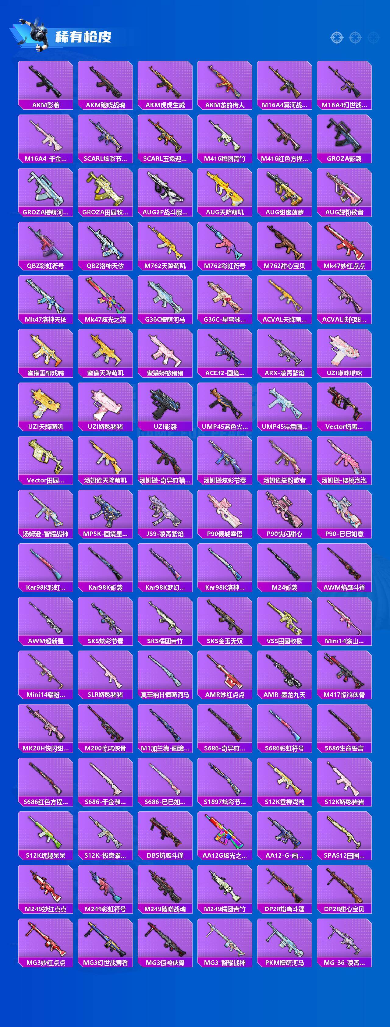 AKM-梦之光华,SCAR-L-锦绣绵绵,M416-电玩时刻,GROZA-镜光银凌,AUG-暖羊咩咩,UMP45-量子极限,P90-金丰海韵,Kar98K-巳巳如意,MG3-洛神天依