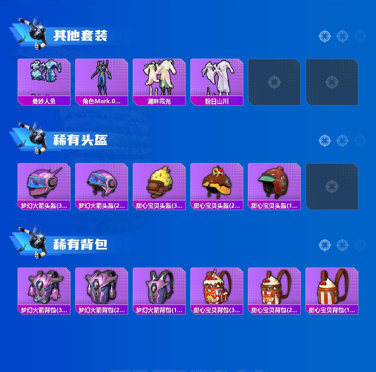 套装-梦幻火箭,套装-都市猎人,套装-冥河战士,套装-派对舞王,套装-宝贝奶油派,套装-天使彩虹糖,角色-圣堂之誓,套装-金丰海韵,角色-千金淑猫,套装-鹰眼刺客
