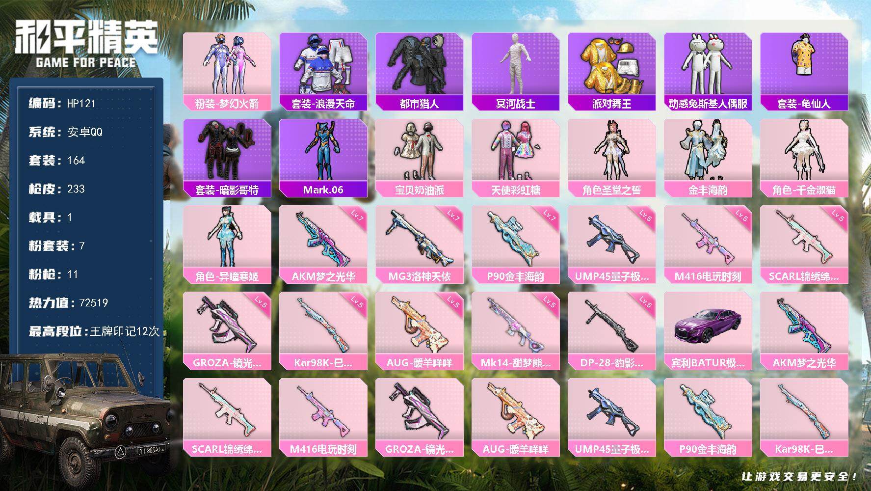 [16461923]安卓 手Q-7粉装-11特效枪-1载具-3粉色飞行器-72519热力值-12王牌印记-164套装-233枪皮