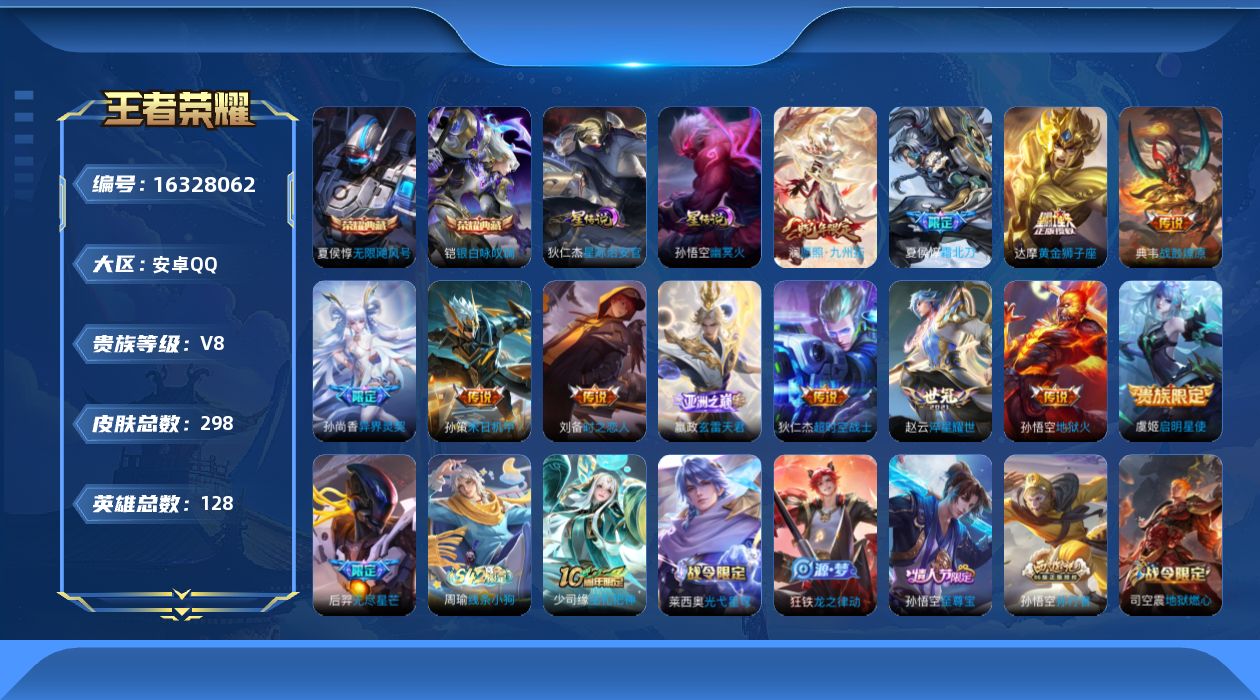 [16328062]可二次【店主推荐捡漏号!可直接换绑】安卓Q-V8-至尊星耀III段位-127英雄-292皮肤-2典藏皮肤-13传说-76史诗-3星元 【英雄全皮】:蒙恬全皮,戈娅全皮,影全皮 【荣耀典藏】:夏侯惇无限飓风号,铠银白咏叹调 【传说皮肤】:澜愿照九州拓,嬴政玄雷天君,夏侯惇霜北刀,典韦战鼓燎原,后羿无尽星芒,孙策末日机甲,孙尚香异界灵契,赵云淬星耀世,虞姬启明星使,刘备时之恋人,达摩黄金狮子座,孙悟空地狱火,狄仁杰超时空战士 【限定皮肤】:夏侯惇霜北刀,蔡文姬夏日便利店,大乔绒语心约,姜子牙天穹之誓,狄仁杰阴阳师,虞姬凯尔特女王,廉颇寅虎御盾,赵云皇家上将,墨子神迹守卫,墨子降魔,嬴政优雅恋人,孙尚香异界灵契,庄周高山流水,阿轲迷踪丽影,扁鹊奇幻香踪,白起夜都怪侠,芈月幻夜卜梦,元歌无心,夏侯惇匿光决锋者,典韦穷奇,狄仁杰魔术师,狄仁杰万华元夜,达摩沙漠行僧,项羽海滩派对,老夫子醍醐杖,老夫子航海奇遇记,程咬金演武夺筹,刘邦夺宝奇兵,王昭君午后时光,兰陵王金庭之子,孙悟空至尊宝,孙悟空孙行者,后羿圣弓游侠,后羿无尽星芒,李元芳云中旅人,虞姬启明星使,钟馗驱傩正仪,杨戬潮玩骑兵,干将莫邪真爱魔法,雅典娜黎明之约,太乙真人饕餮,鬼谷子原初探秘者,鬼谷子五谷丰年,黄忠火炮绅士,苏烈千军破阵,百里玄策原初追逐者,梦奇顽趣,沈梦溪大漠名商,明世隐疑决卦,明世隐吟游魔法,裴擒虎李小龙,裴擒虎擒涛扼浪,狂铁电玩高手,猪八戒猪悟能,上官婉儿梁祝,嫦娥暖冬兔眠,西施玲珑珍味,鲁班大师探海日志,桑启海盐诗旅,暃星界游侠,戈娅驭风魔法,艾琳女武神,艾琳流音漫舞,司空震地狱燃心,阿古朵江河有灵,张良古海寻踪,蒙恬荣光圣徽,鬼谷子天穹祈灯,周瑜熔金海岸 【年限皮肤】:廉颇寅虎御盾 【赛季限定】:典韦穷奇,狄仁杰万华元夜,达摩沙漠行僧,老夫子醍醐杖,程咬金演武夺筹,兰陵王金庭之子,张良古海寻踪,李元芳云中旅人,虞姬凯尔特女王,钟馗驱傩正仪,雅典娜黎明之约,太乙真人饕餮,鬼谷子原初探秘者,苏烈千军破阵,百里玄策原初追逐者,梦奇顽趣,沈梦溪大漠名商,明世隐疑决卦,裴擒虎擒涛扼浪,鲁班大师探海日志,桑启海盐诗旅,鬼谷子天穹祈灯,蒙恬荣光圣徽,姜子牙天穹之誓 【战令限定】:墨子神迹守卫,蔡文姬夏日便利店,阿轲迷踪丽影,扁鹊奇幻香踪,白起夜都怪侠,芈月幻夜卜梦,老夫子航海奇遇记,刘邦夺宝奇兵,王昭君午后时