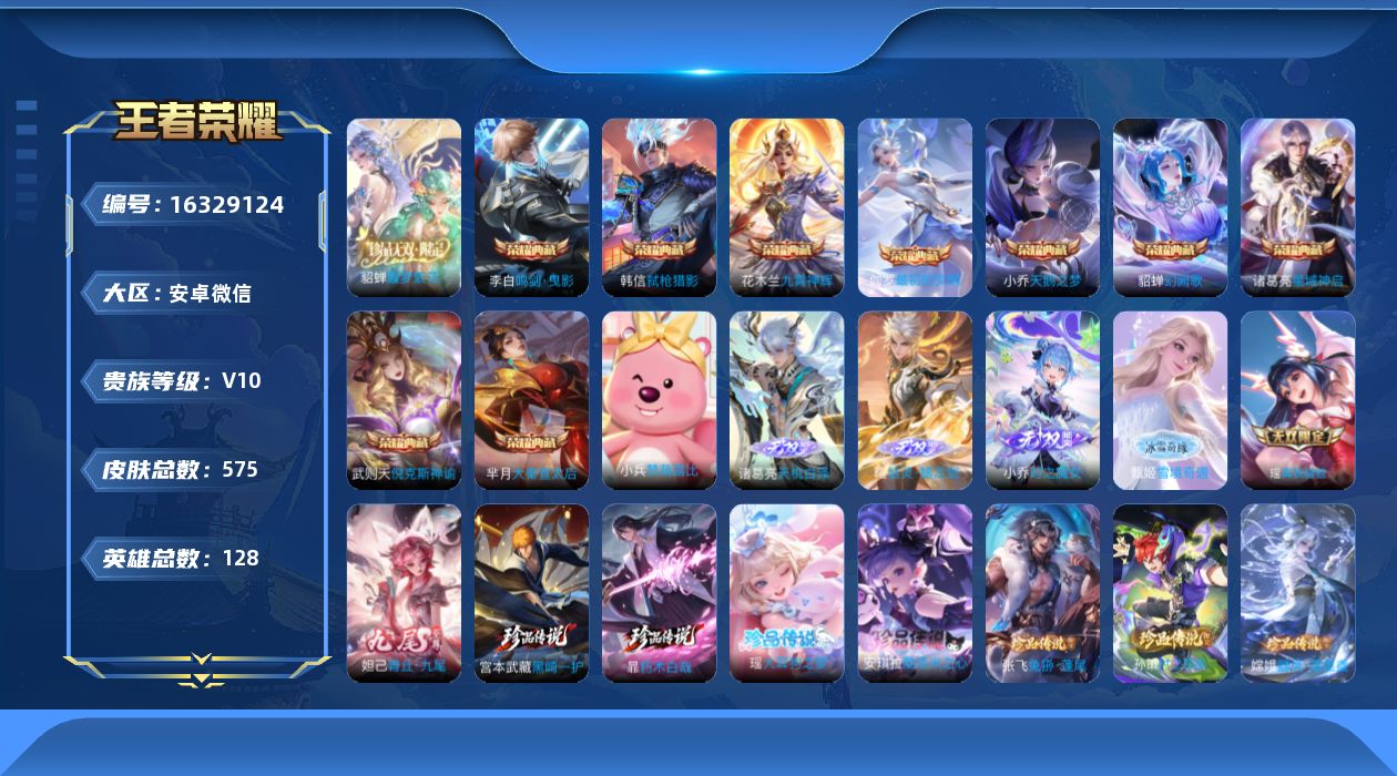 [16329124]社交限制安卓WX-V10-最强王者段位-128英雄-575皮肤-9典藏皮肤-1典藏英雄-7星元-1珍品无双-6无双-7珍品传说-72传说-212史诗