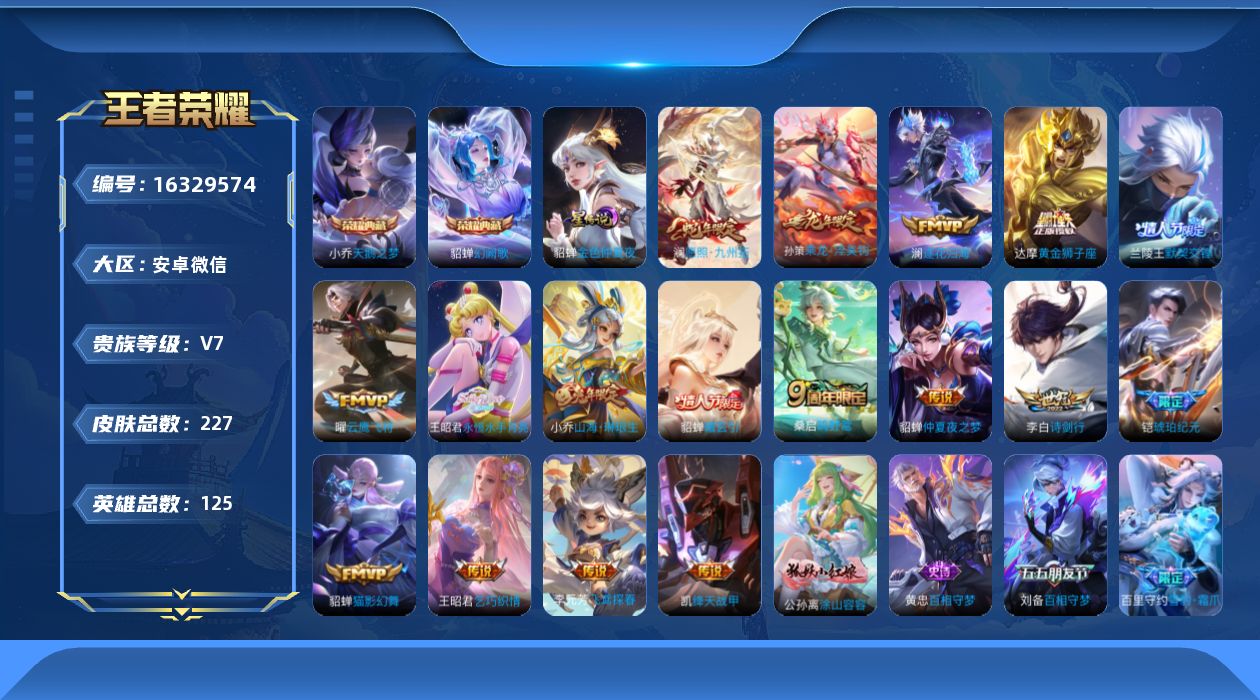[16329574]安卓WX-V7-最强王者段位-125英雄-227皮肤-2典藏皮肤-18传说-75史诗-1星传说