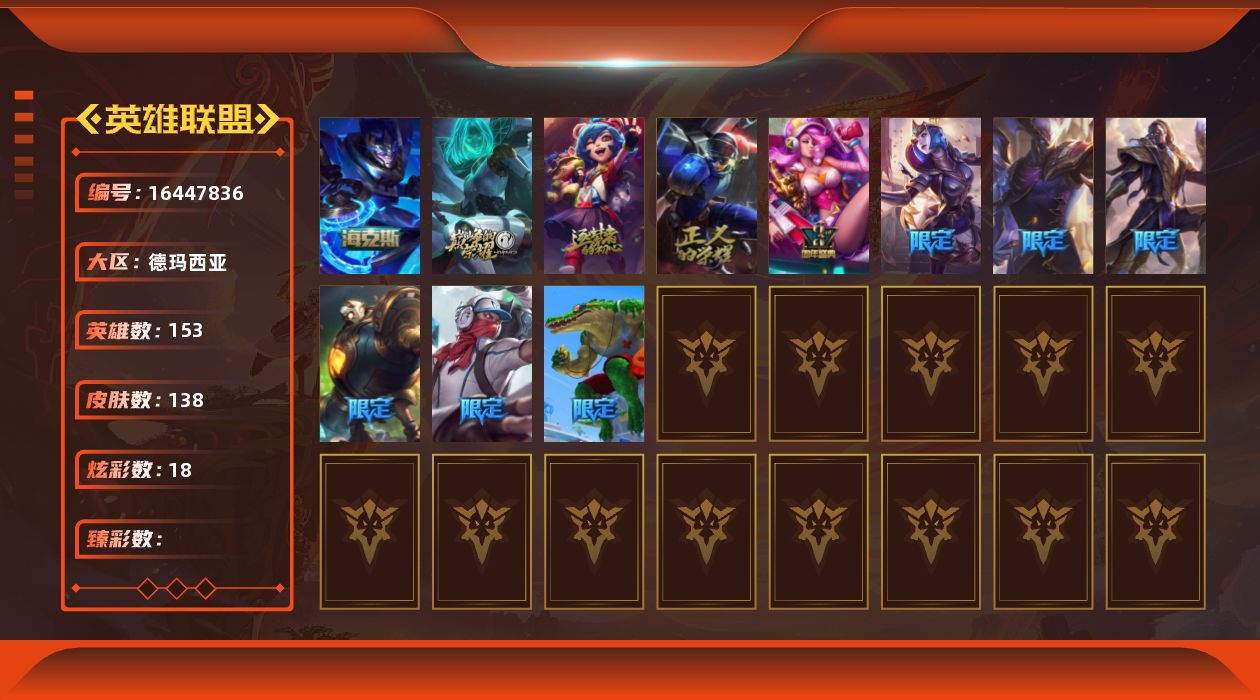 未定级段位-153英雄-138皮肤-18炫彩-0终极-3神话-9限定-16传说-37史诗