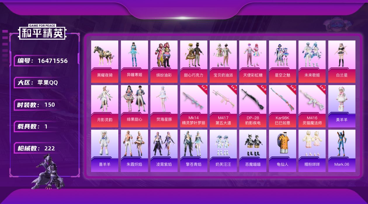 [16471556]【身法素材号-特价急出】巧克力三姐妹-猪妹-蓝螳螂-苹果 手Q-11粉装-5特效枪-1载具-4粉色飞行器-68846热力值-13王牌印记-150套装-222枪皮 【热门品类】:粉装-缤纷油彩,套装-龟仙人,套装-糯粉咩咩,角色-Mark.06,套装-红熊茄茄 【粉色套装】:粉装-甜心巧克力,粉装-宝贝奶油派,粉装-天使彩虹糖,粉装-缤纷油彩,粉装-星空之魅,粉装-未来歌姬,角色-白兰星,角色-月影灵韵,粉装-绯果甜心,角色-荧海星豚,角色-异瞳寒姬 【粉色枪皮等级】:M416-灵猫魔法师(三级),Kar98K-巳巳如意(五级),Mk14-精灵梦叶罗丽(七级),M417-第五大道(七级),DP-28-豹影疾电(五级) 【粉色载具】:黑曜夜骑 【粉色枪皮】:M416-灵猫魔法师,Kar98K-巳巳如意,Mk14-精灵梦叶罗丽,M417-第五大道,DP-28-豹影疾电 【粉色飞行器】:萌物绒绒飞行器,绯果甜心飞行器,灵猫魔法师飞行器 【粉色降落伞】:绝对恒星降落伞,甜心宝贝降落伞,梦幻火箭降落伞,天之羽翼降落伞,甜梦小狐降落伞,闪光银龙降落伞,旋转彩虹降落伞,第五大道降落伞,纯梦嫁纱降落伞,未来歌姬降落伞,萌物绒绒降落伞,炫光之旅降落伞,精灵梦叶罗丽降落伞,戏水时光降落伞,绯果甜心降落伞,星穹咏叹调降落伞,灵猫魔法师降落伞,绯穹魔姬降落伞,喜羊羊与灰太狼降落伞,炫彩糖果降落伞 【稀有套装】:套装-龟仙人,套装-航行童话,套装-巳巳如意,套装-雪国风尚,套装-炫彩糖果,套装-雏菊兔兔,套装-萝兰蝴蝶,角色-都市丽猫,角色-摩登魅猫,套装-燕燕于飞,套装-鱼渊荷华,套装-粉恋花,套装-紫幽梦,套装-蓝冰羽,角色-瑰梦爱神,角色-鲛海歌灵,套装-极速光影,套装-彩虹兔,套装-云朵鹅,套装-雪绒豹,角色-绛羽幽主,角色-夜瞳黯灵,套装-朱霞炽焰,套装-凌霄紫焰,套装-擎苍青焰,玩偶服-美羊羊,玩偶服-喜羊羊 【稀有枪皮】:AUG-冰晶雪宝,AKM-破晓战魂,AKM-龙的传人,AKM-灵猫魔法师,SCAR-L-夜灯,SCAR-L-炫彩节奏,SCAR-L-玉兔迎春,SCAR-L-红色方程式,M416-糯团青竹,M416-红色方程式,M416-绯红前夜,M416-萌萌史莱姆,GROZA-懵萌河马,GROZA-田园牧歌,GROZA-荧海星豚,AUG-天降萌叽,AUG-耀粉歌者,QBZ-