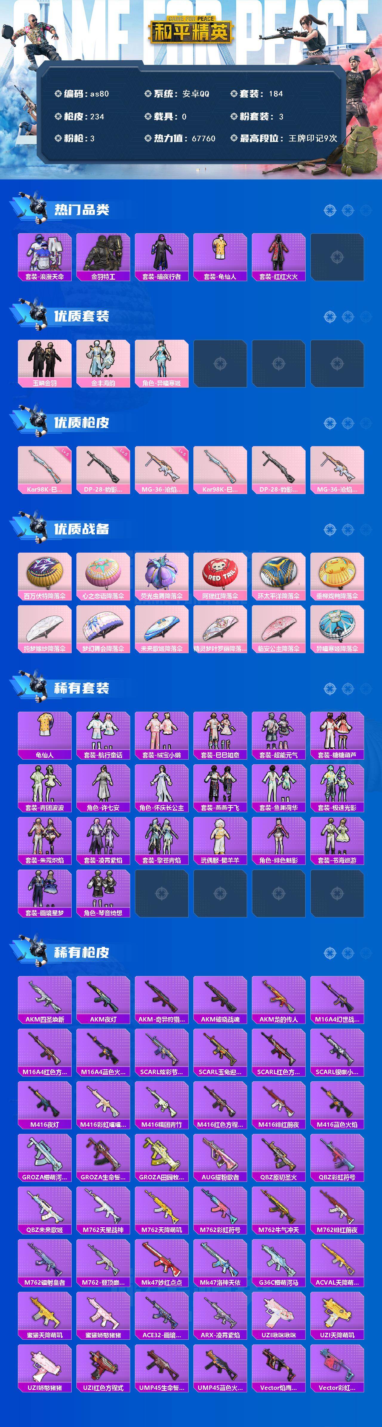 [16471838]安卓 手Q-3粉装-3特效枪-0载具-2粉色飞行器-67760热力值-9王牌印记-184套装-234枪皮 【热门品类】:套装-浪漫天命,套装-金羽特工,套装-暗夜行者,套装-龟仙人,套装-红红火火 【粉色套装】:粉装-玉鳞金羽,粉装-金丰海韵,角色-异瞳寒姬 【粉色枪皮等级】:Kar98K-巳巳如意(五级),DP-28-豹影疾电(五级),MG-36-沧焰双生(五级) 【粉色枪皮】:Kar98K-巳巳如意,DP-28-豹影疾电,MG-36-沧焰双生 【粉色降落伞】:百万伏特降落伞,心之恋语降落伞,荧光虫舞降落伞,阿狸红降落伞,环太平洋降落伞,垂柳戏鸭降落伞,纯梦嫁纱降落伞,梦幻舞会降落伞,未来歌姬降落伞,精灵梦叶罗丽降落伞,临安公主降落伞,异瞳寒姬降落伞,炫彩糖果降落伞 【稀有套装】:套装-龟仙人,套装-航行童话,套装-绒宝小鹅,套装-巳巳如意,套装-超能元气,套装-雪国风尚,套装-炫彩糖果,套装-糖糖葫芦,套装-青团波波,角色-许七安,角色-怀庆长公主,套装-燕燕于飞,套装-鱼渊荷华,套装-极速光影,套装-朱霞炽焰,套装-凌霄紫焰,套装-擎苍青焰,玩偶服-懒羊羊,角色-绯色魅影,套装-书海巡游,套装-画境星梦,套装-琴音绮想 【稀有枪皮】:AUG-冰晶雪宝,AKM-四圣焕新,AKM-夜灯,AKM-奇异狩猎者,AKM-破晓战魂,AKM-龙的传人,M16A4-幻世战舞者,M16A4-红色方程式,M16A4-蓝色火焰,SCAR-L-炫彩节奏,SCAR-L-玉兔迎春,SCAR-L-红色方程式,SCAR-L-银碳小老虎,M416-夜灯,M416-彩虹嘻嘻猴,M416-糯团青竹,M416-红色方程式,M416-绯红前夜,M416-蓝色火焰,GROZA-懵萌河马,GROZA-生命誓言,GROZA-田园牧歌,AUG-耀粉歌者,QBZ-原初圣火,QBZ-彩虹符号,QBZ-未来歌姬,M762-天星战神,M762-天降萌叽,M762-彩虹符号,M762-牛气冲天,M762-绯红前夜,M762-镭射皇者,M762-登顶巅峰,Mk47-妙红点点,Mk47-洛神天依,G36C-懵萌河马,AC-VAL-天降萌叽,蜜獾-天降萌叽,蜜獾-娇憨猪猪,ACE32-画境星梦,ARX-凌霄紫焰,UZI-啾咪啾咪,UZI-天降萌叽,UZI-娇憨猪猪,UZI-红色方程式,UMP45-生命誓言,UMP45-蓝色