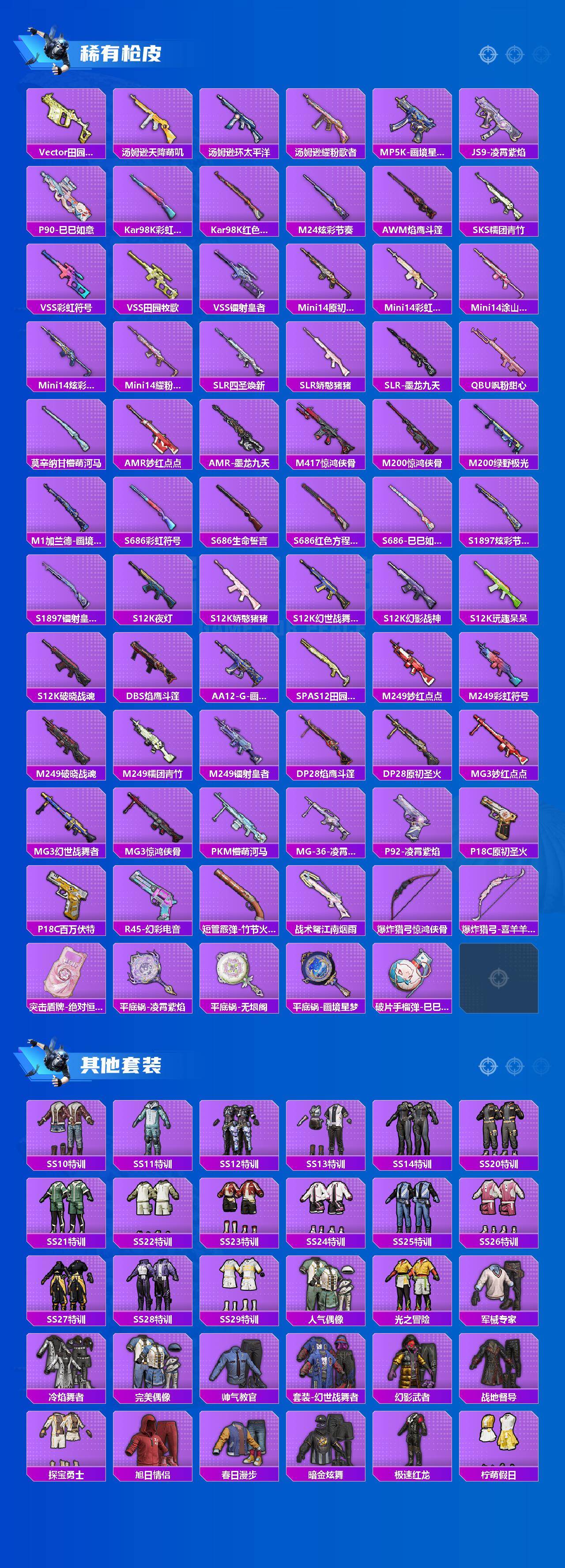 【稀有枪皮】:AUG-冰晶雪宝,AKM-四圣焕新,AKM-夜灯,AKM-奇异狩猎者,AKM-破晓战魂,AKM-龙的传人,M16A4-幻世战舞者,M16A4-红色方程式,M16A4-蓝色火焰,SCAR-L-炫彩节奏,SCAR-L-玉兔迎春,SCAR-L-红色方程式,SCAR-L-银碳小老虎,M416-夜灯,M416-彩虹嘻嘻猴,M416-糯团青竹,M416-红色方程式,M416-绯红前夜,M416-蓝色火焰,GROZA-懵萌河马,GROZA-生命誓言,GROZA-田园牧歌,AUG-耀粉歌者,QBZ-原初圣火,QBZ-彩虹符号,QBZ-未来歌姬,M762-天星战神,M762-天降萌叽,M762-彩虹符号,M762-牛气冲天,M762-绯红前夜,M762-镭射皇者,M762-登顶巅峰,Mk47-妙红点点,Mk47-洛神天依,G36C-懵萌河马,AC-VAL-天降萌叽,蜜獾-天降萌叽,蜜獾-娇憨猪猪,ACE32-画境星梦,ARX-凌霄紫焰,UZI-啾咪啾咪,UZI-天降萌叽,UZI-娇憨猪猪,UZI-红色方程式,UMP45-生命誓言,UMP45-蓝色