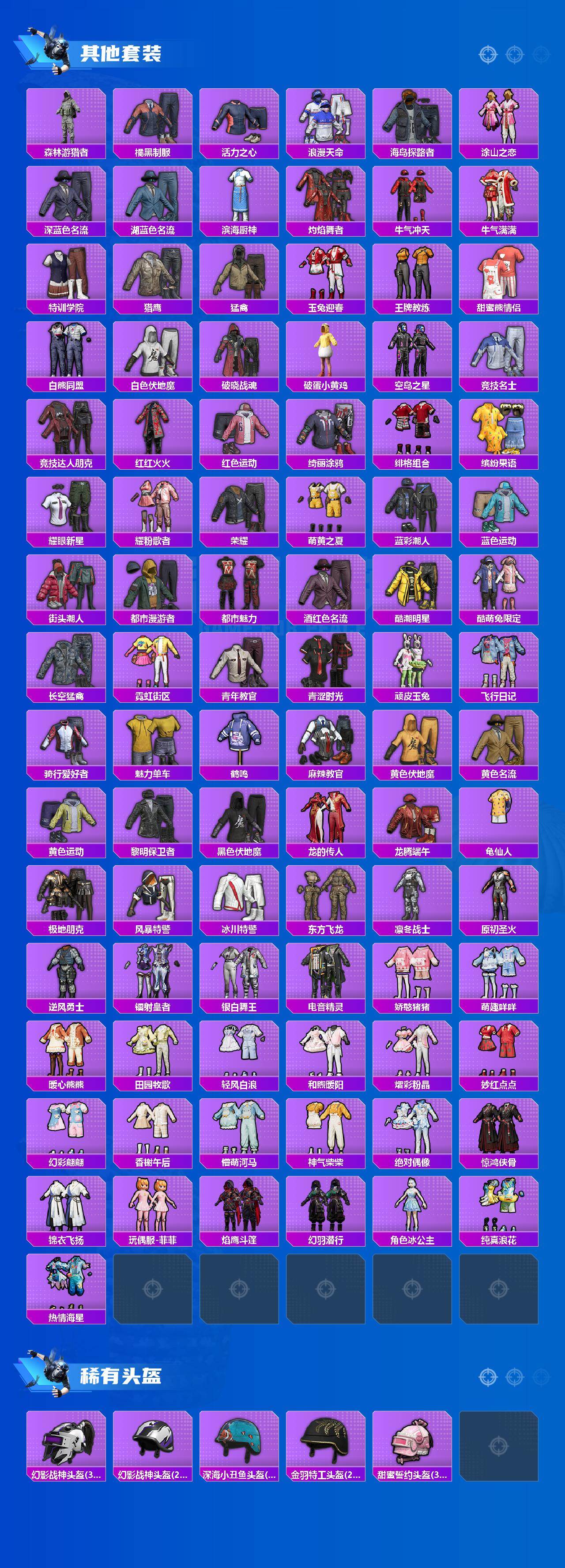【稀有套装】:套装-龟仙人,套装-航行童话,套装-绒宝小鹅,套装-巳巳如意,套装-超能元气,套装-雪国风尚,套装-炫彩糖果,套装-糖糖葫芦,套装-青团波波,角色-许七安,角色-怀庆长公主,套装-燕燕于飞,套装-鱼渊荷华,套装-极速光影,套装-朱霞炽焰,套装-凌霄紫焰,套装-擎苍青焰,玩偶服-懒羊羊,角色-绯色魅影,套装-书海巡游,套装-画境星梦,套装-琴音绮想
